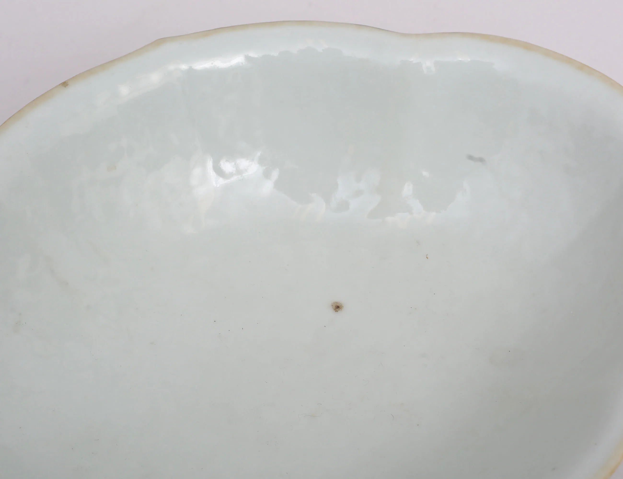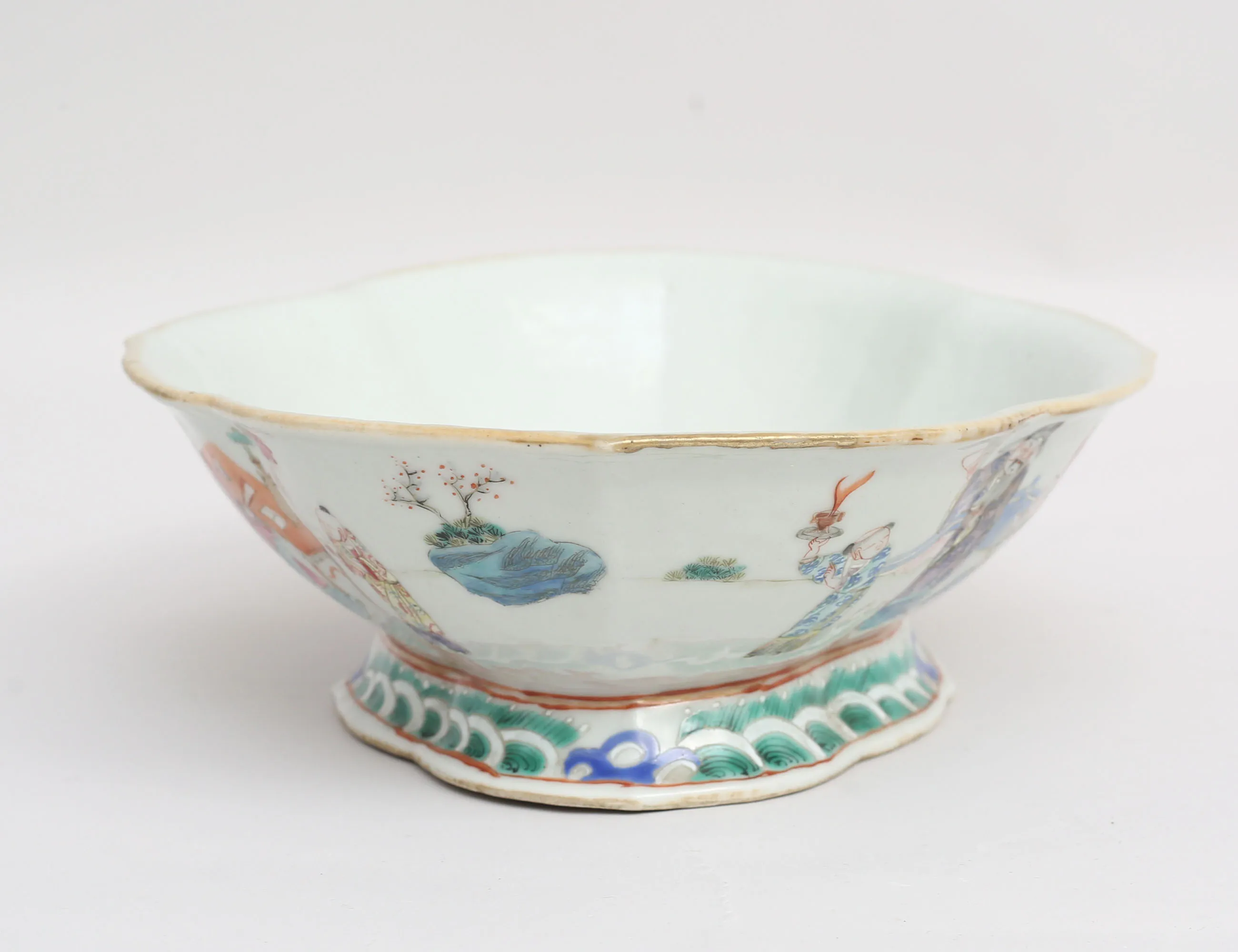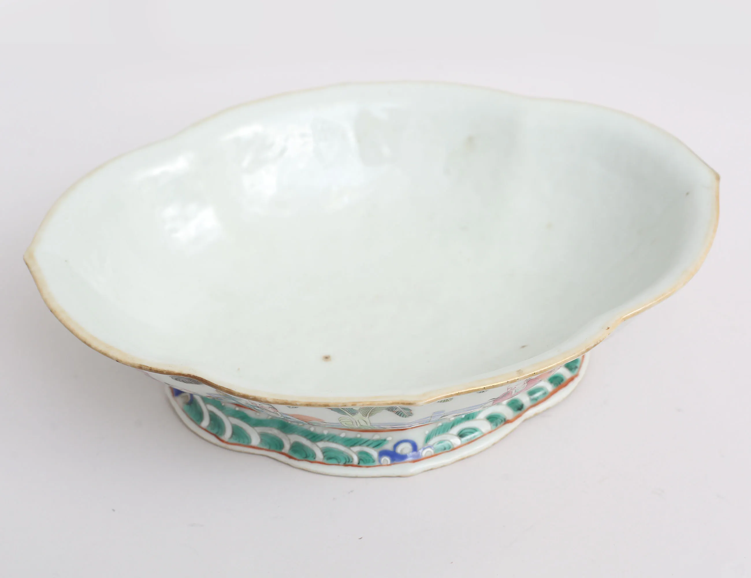 sen Qing, famille rose, polykrom emaljdekor av figurscener, profilerad kant, bottenmärke, höjd 8, bredd 27,5x21,5 (insidans botten med obetydlig tillverkningsdefekt i glasyren)
