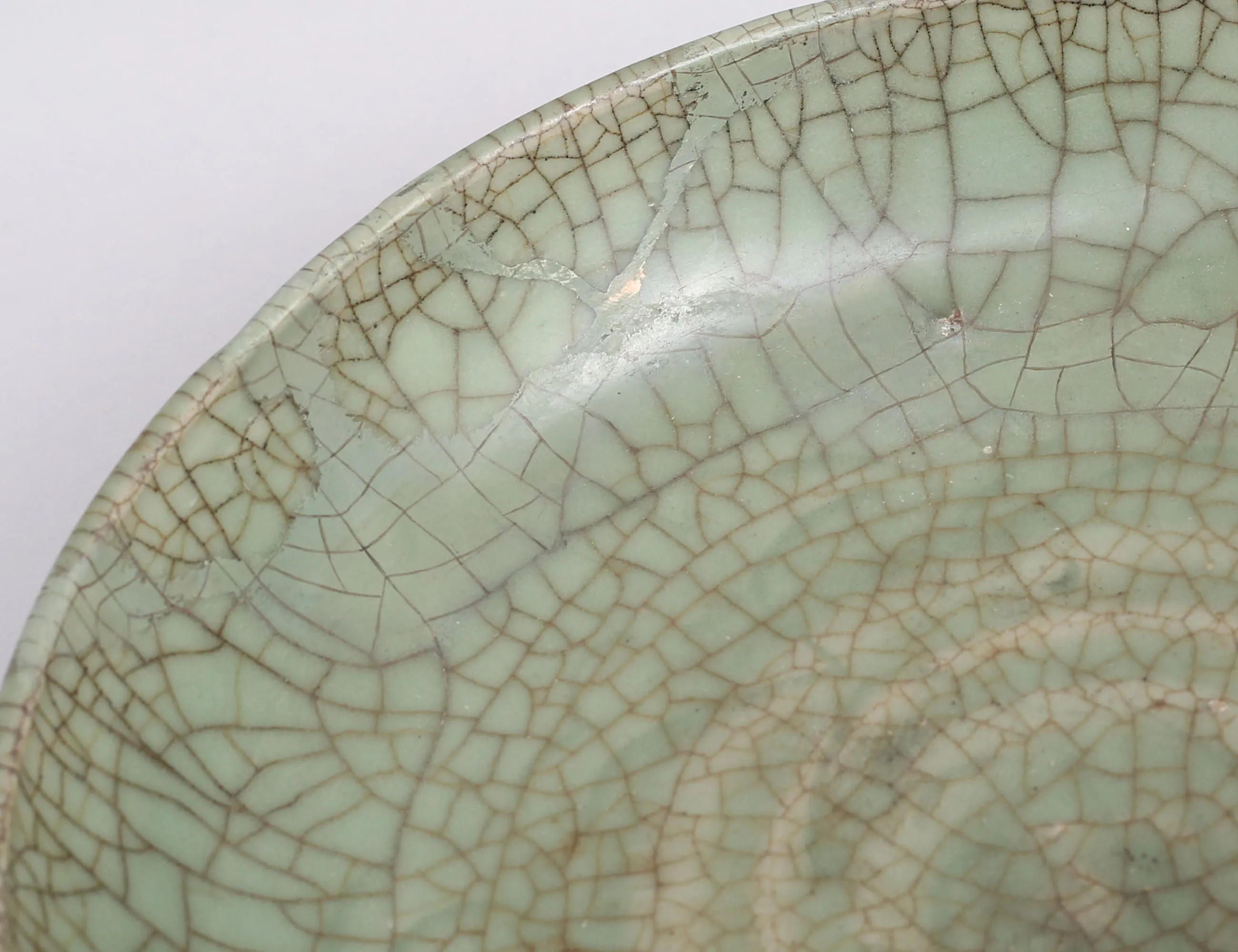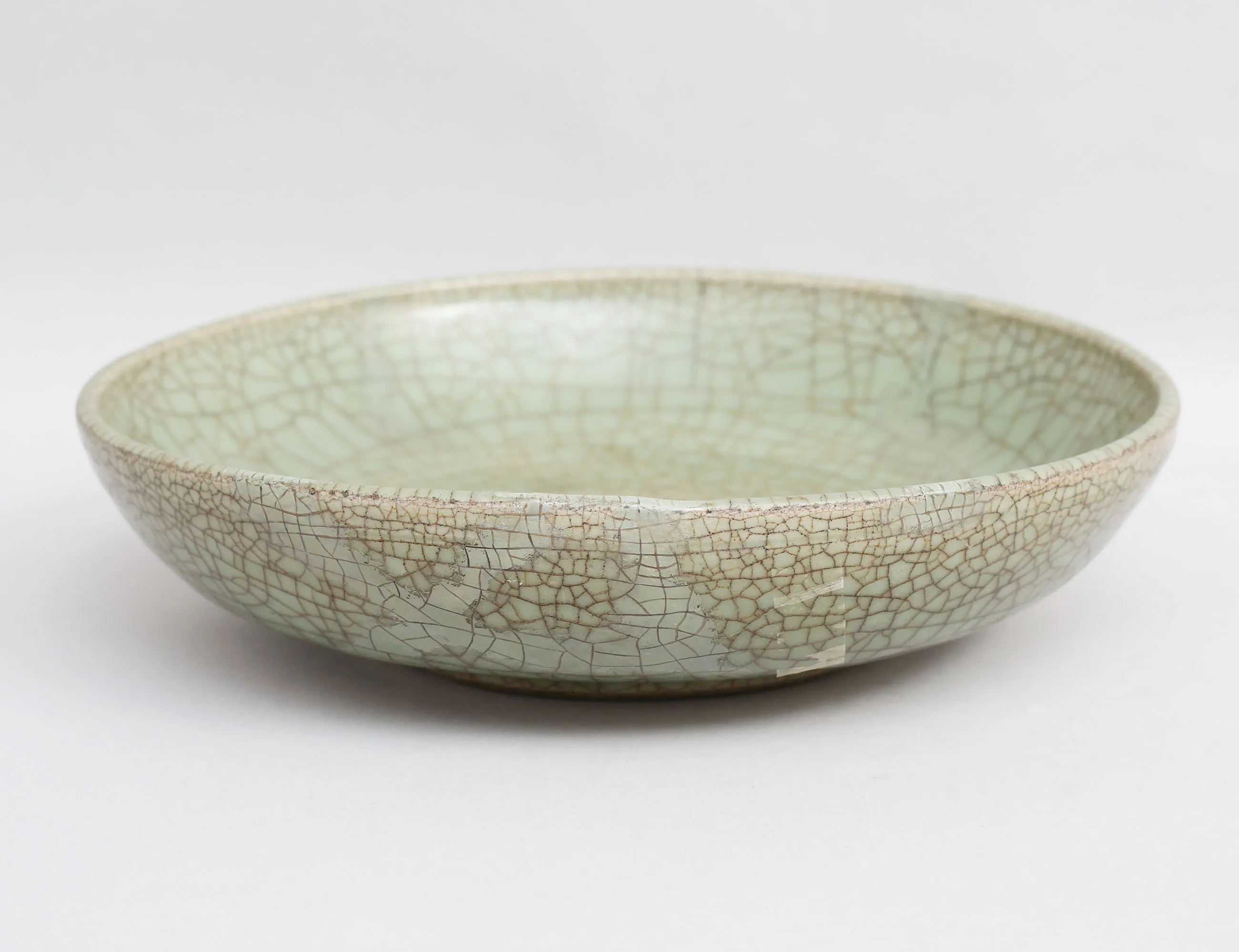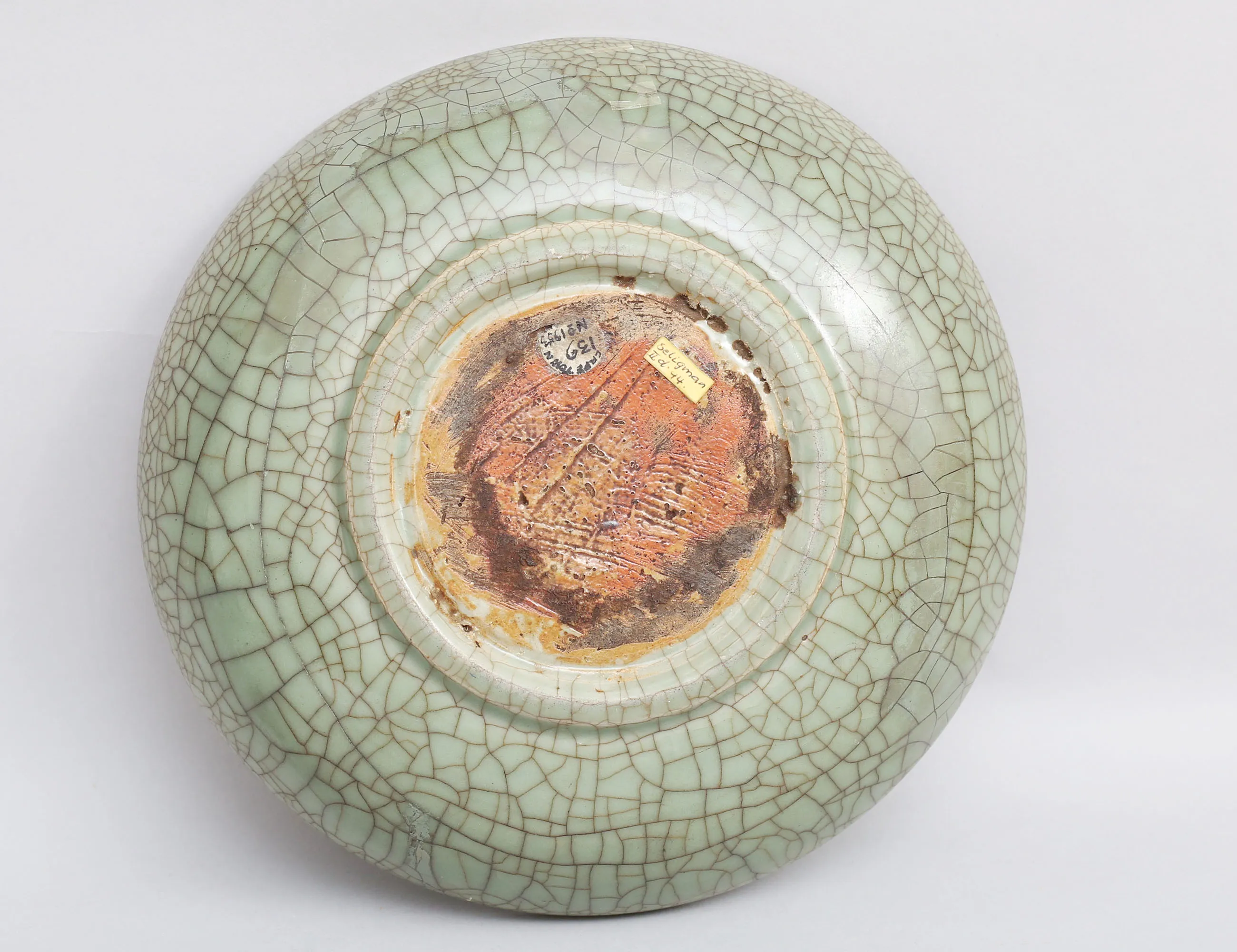 möjligen Ming (1368-1644) crackleware glasyr i celadon, utställningsetikett 1953, höjd 6, diameter 26 (lagningar)