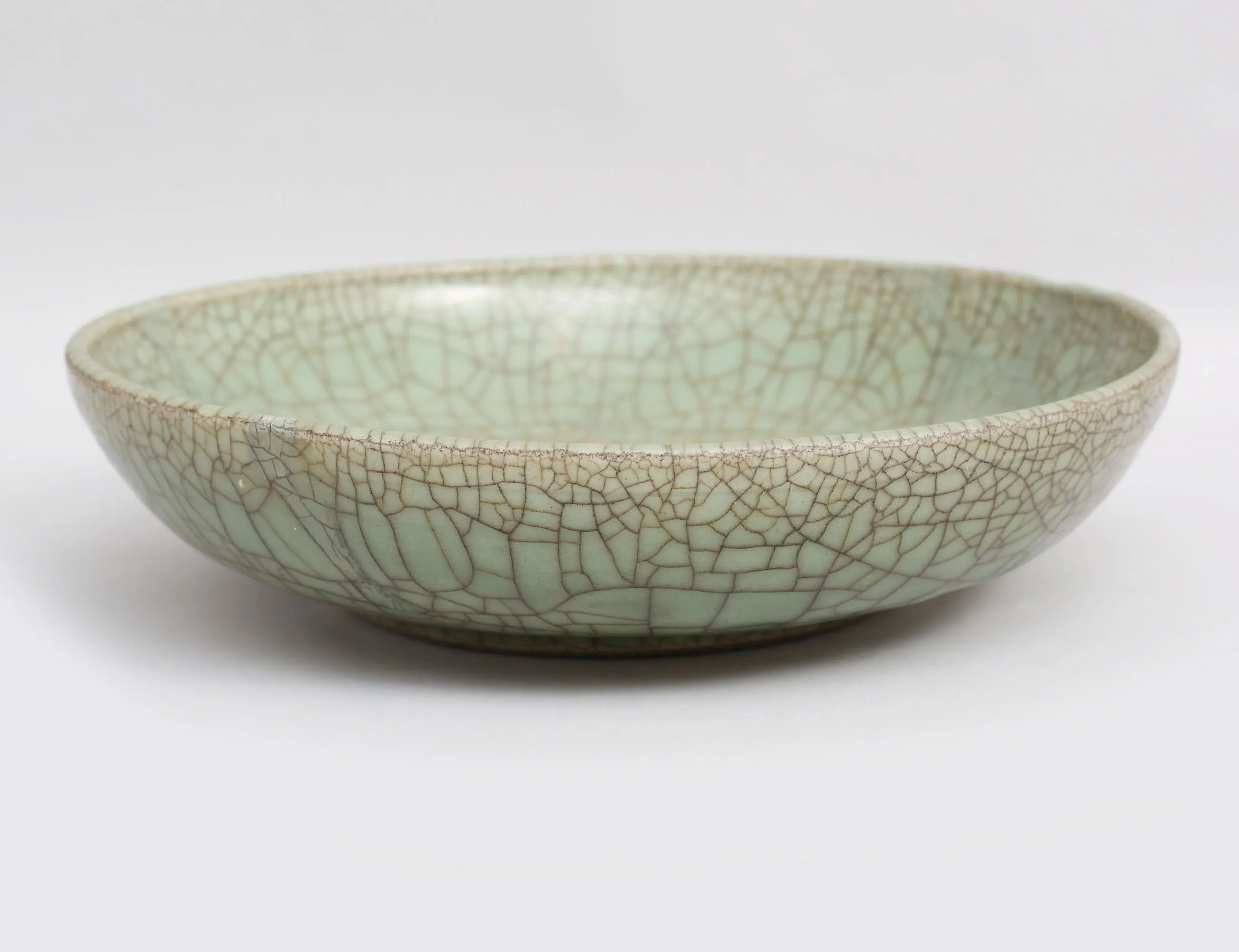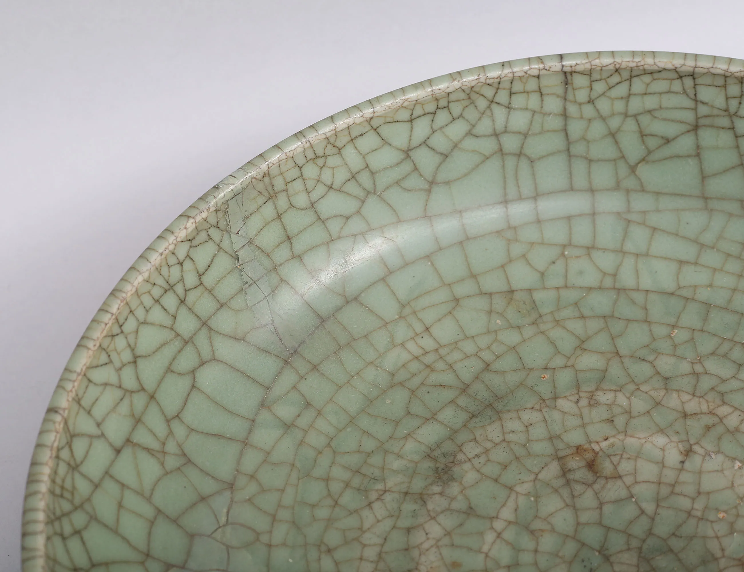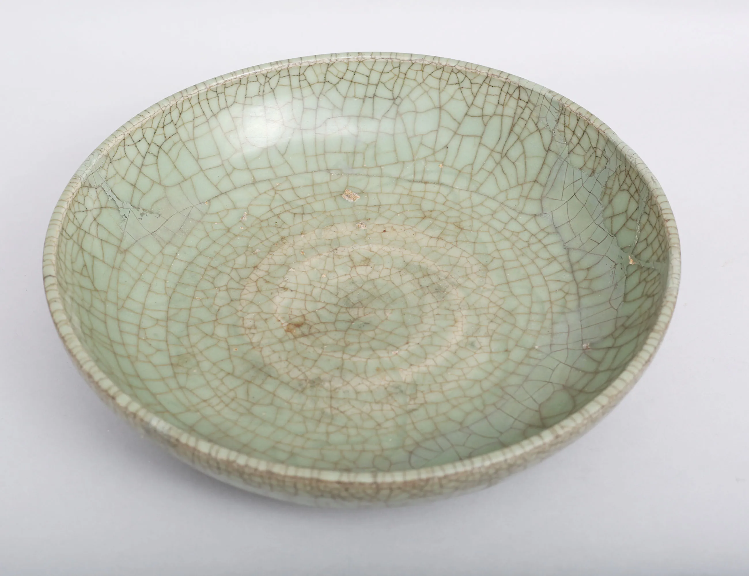 möjligen Ming (1368-1644) crackleware glasyr i celadon, utställningsetikett 1953, höjd 6, diameter 26 (lagningar)