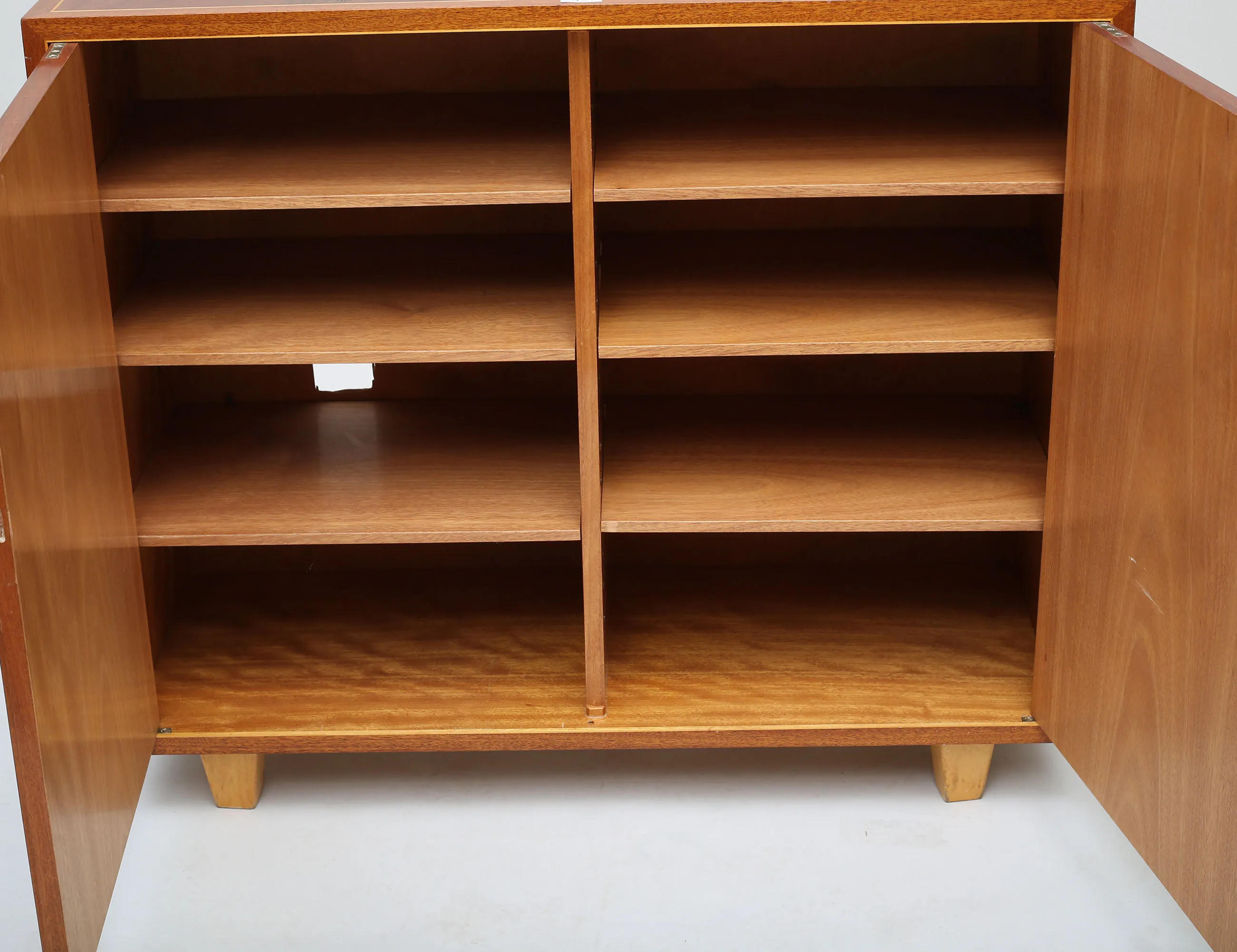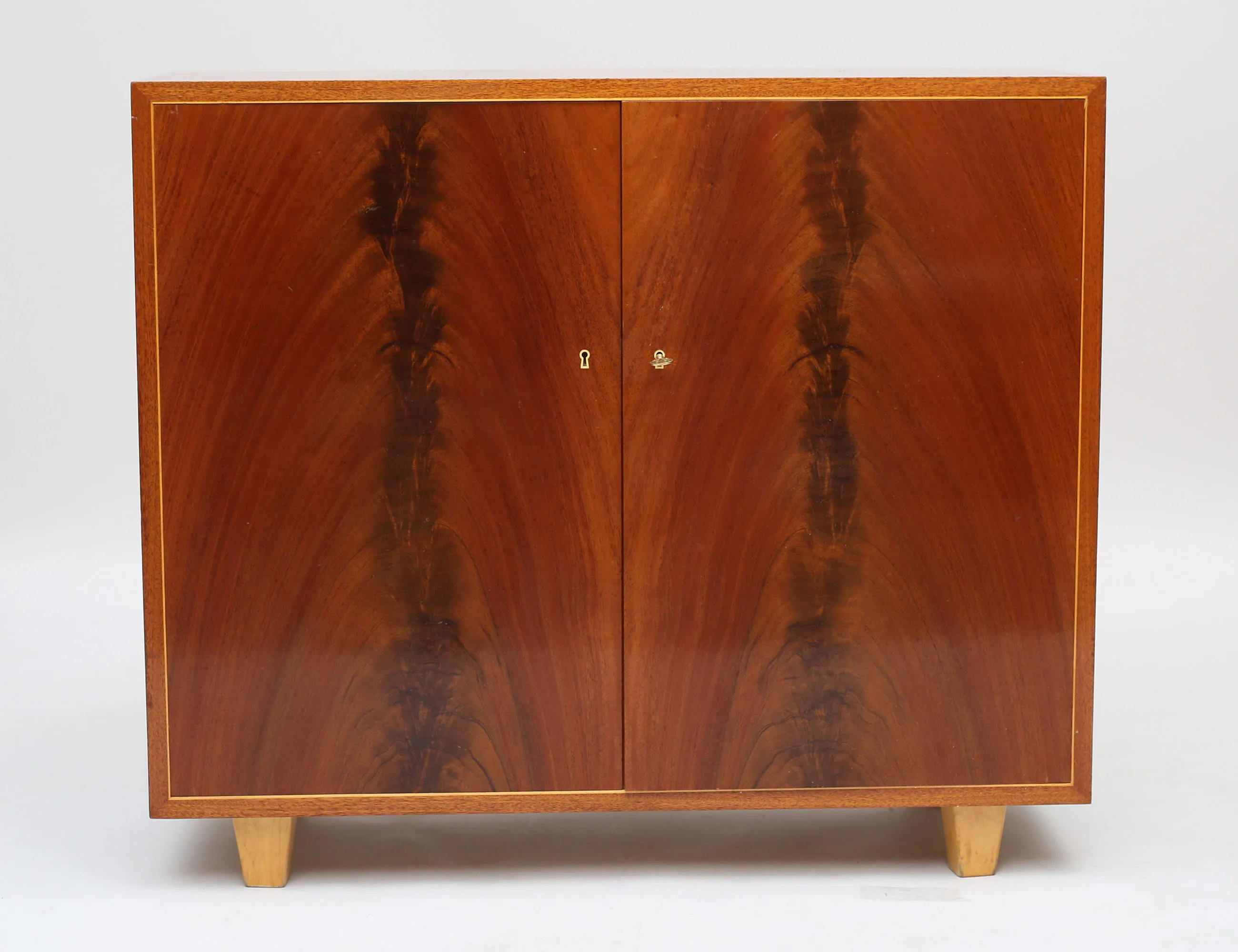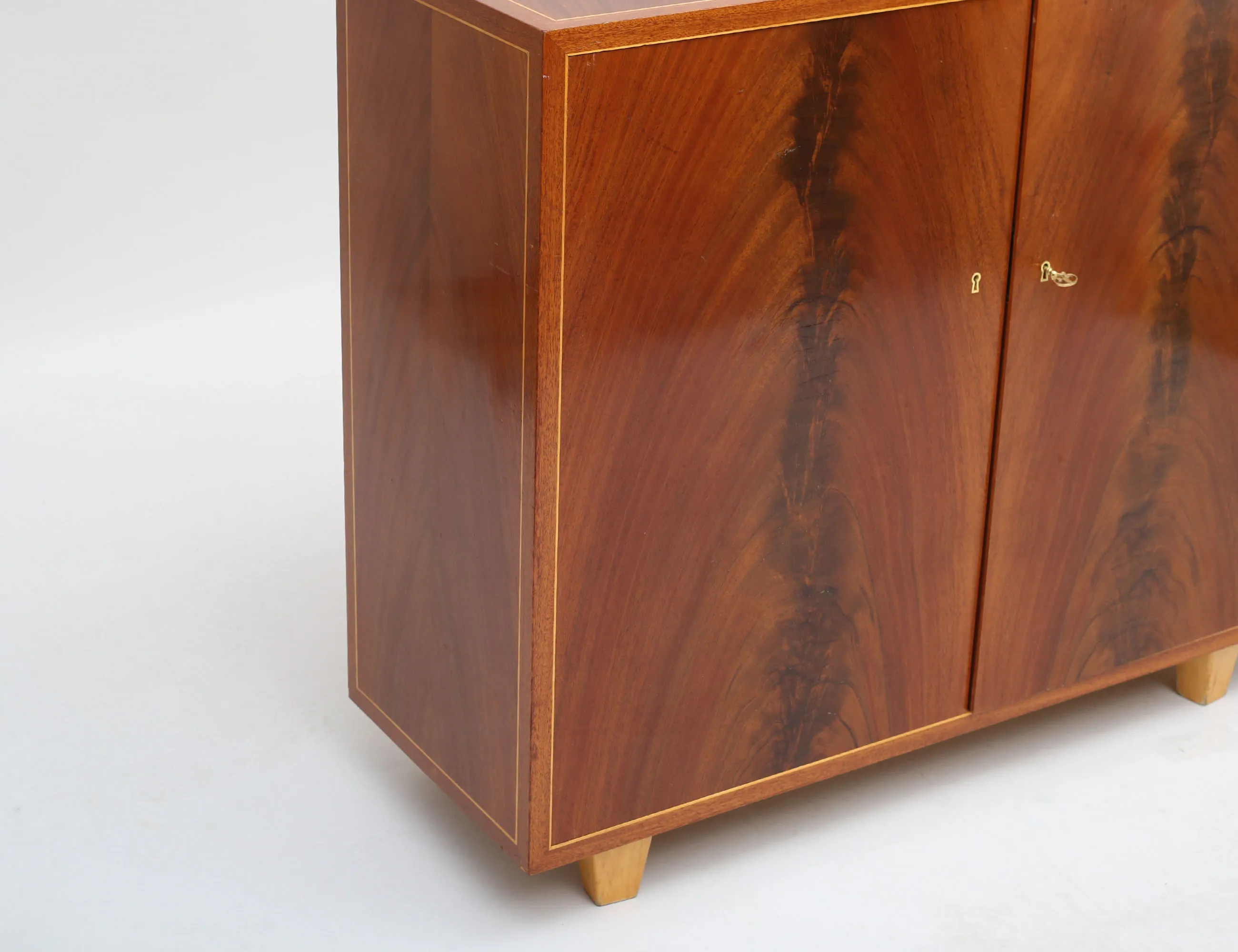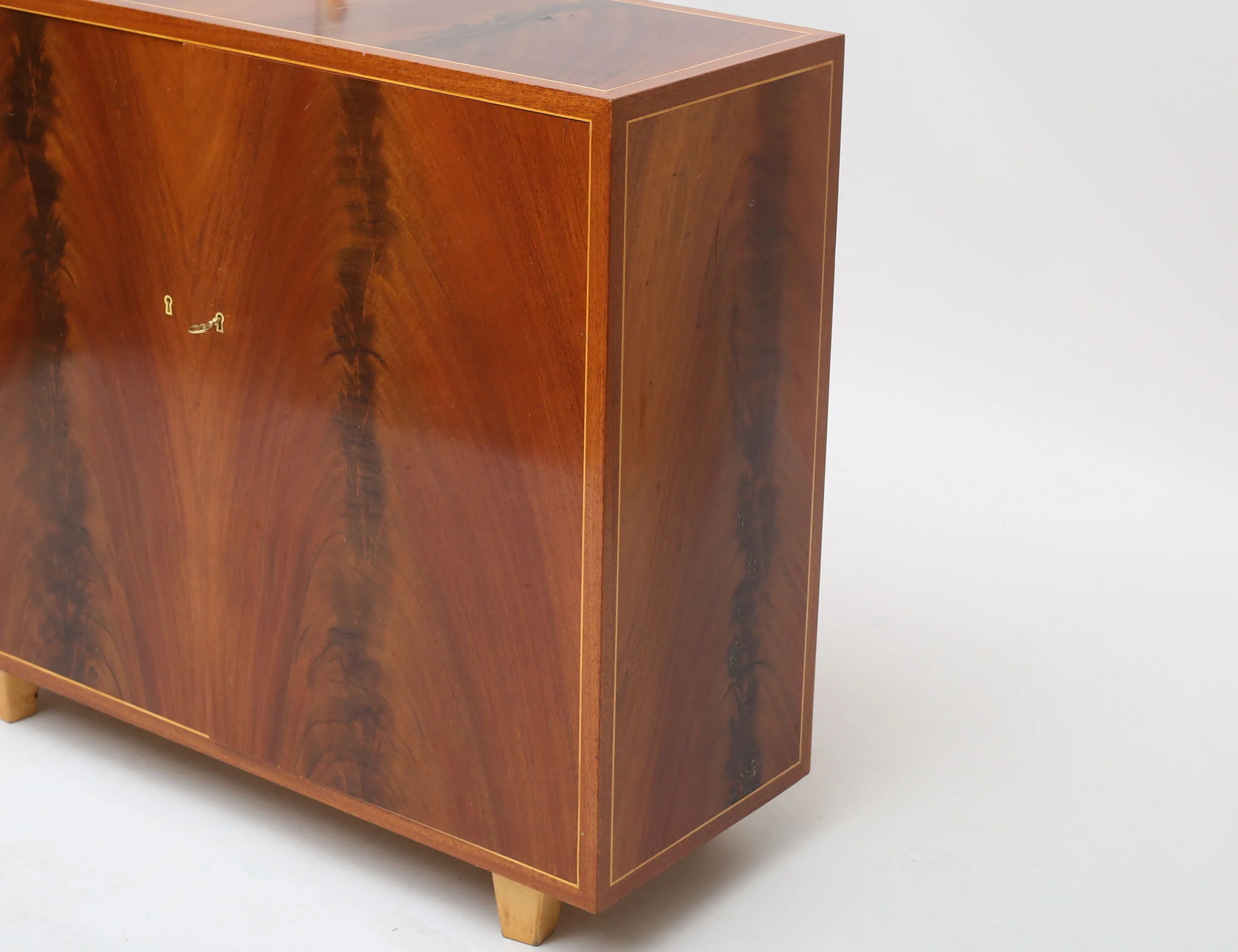 pyramidmahogny med ljusare bandintarsia, sex hyllplan, nyckelbussningar i ben, nyckel i mässing, höjd 89, bredd 103, djup 38, proveniens: Yngve Ekströms kvarlåtenskap (slitage, bakstycke med håltagning)