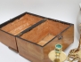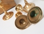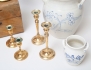 mahogny, höjd 23, bredd 29x20, blekingeljusstake 1900-tal, mässing, höjd 27, 2 krus Rörstrand tidigt 1900-tal, höjd 14/28, ljusstakar 1 par samt 1+1, mässing, varav 2 Skultuna Bruk, höjd 12-21 (skrin saknar del av nyckelbeslag och 3 mässingsstift)