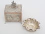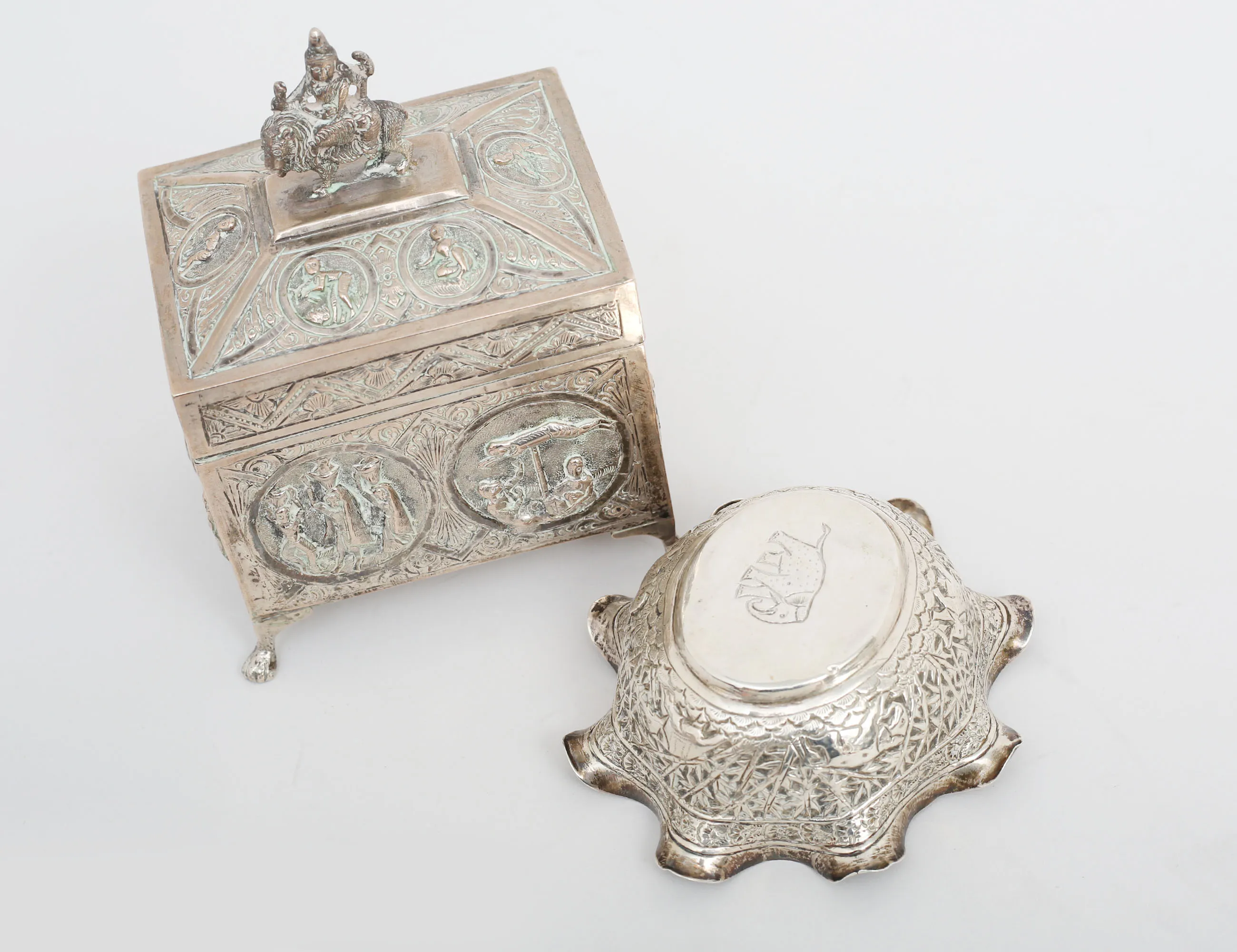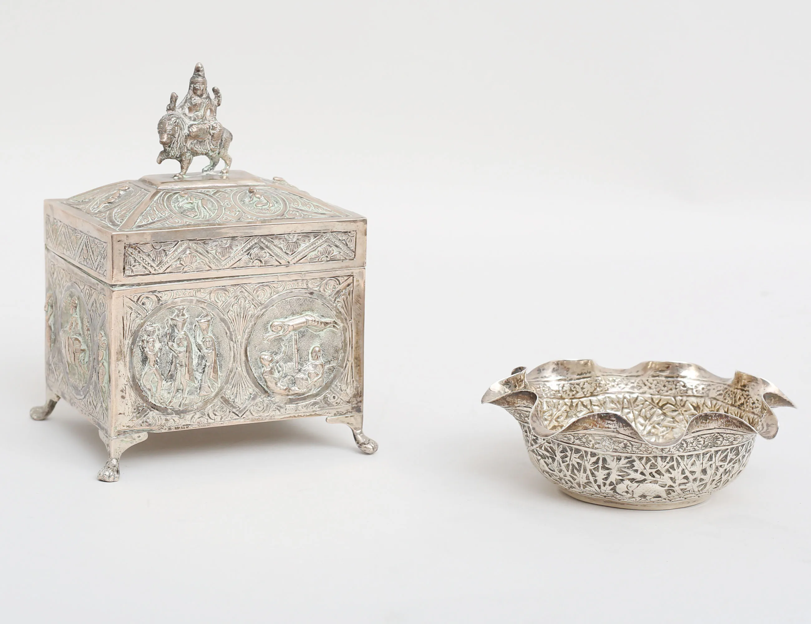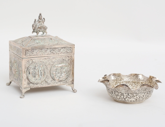 tassfötter, mytologisk reliefdekor, höjd 14, 10x8, skål veckad modell, botten ned elefantdekor, båda låghaltigt silver Indonesien, vikt 360 gram (2)