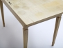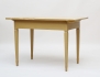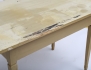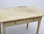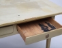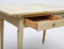 kvadratiska nedåt avsmalnande ben med kannelyrer, fristående, sargen med två lådor, bemålat, nyckelbeslag i mässing, höjd 78, bredd 119, djup 65 (bemålning med fläckar och avskav, lås saknas)