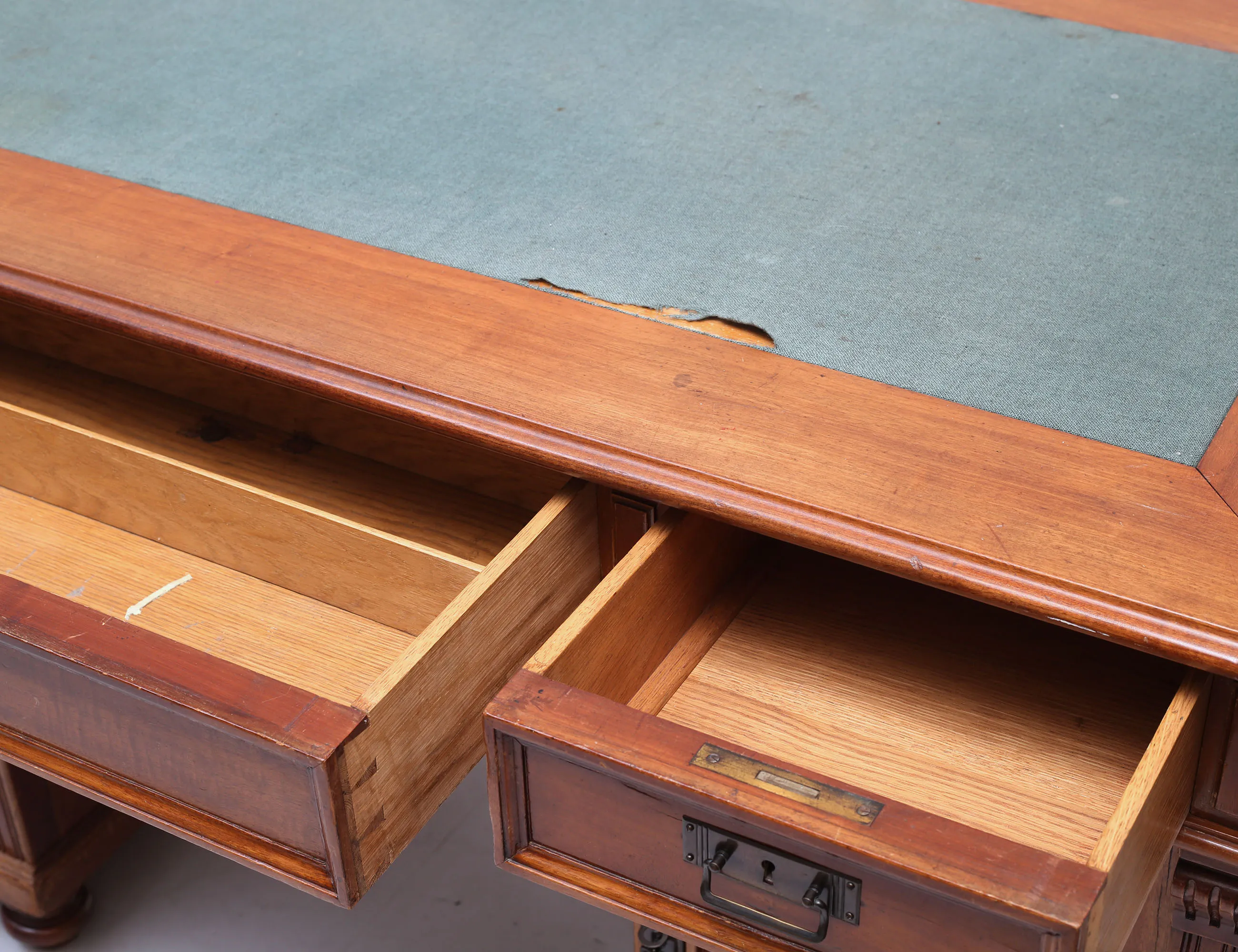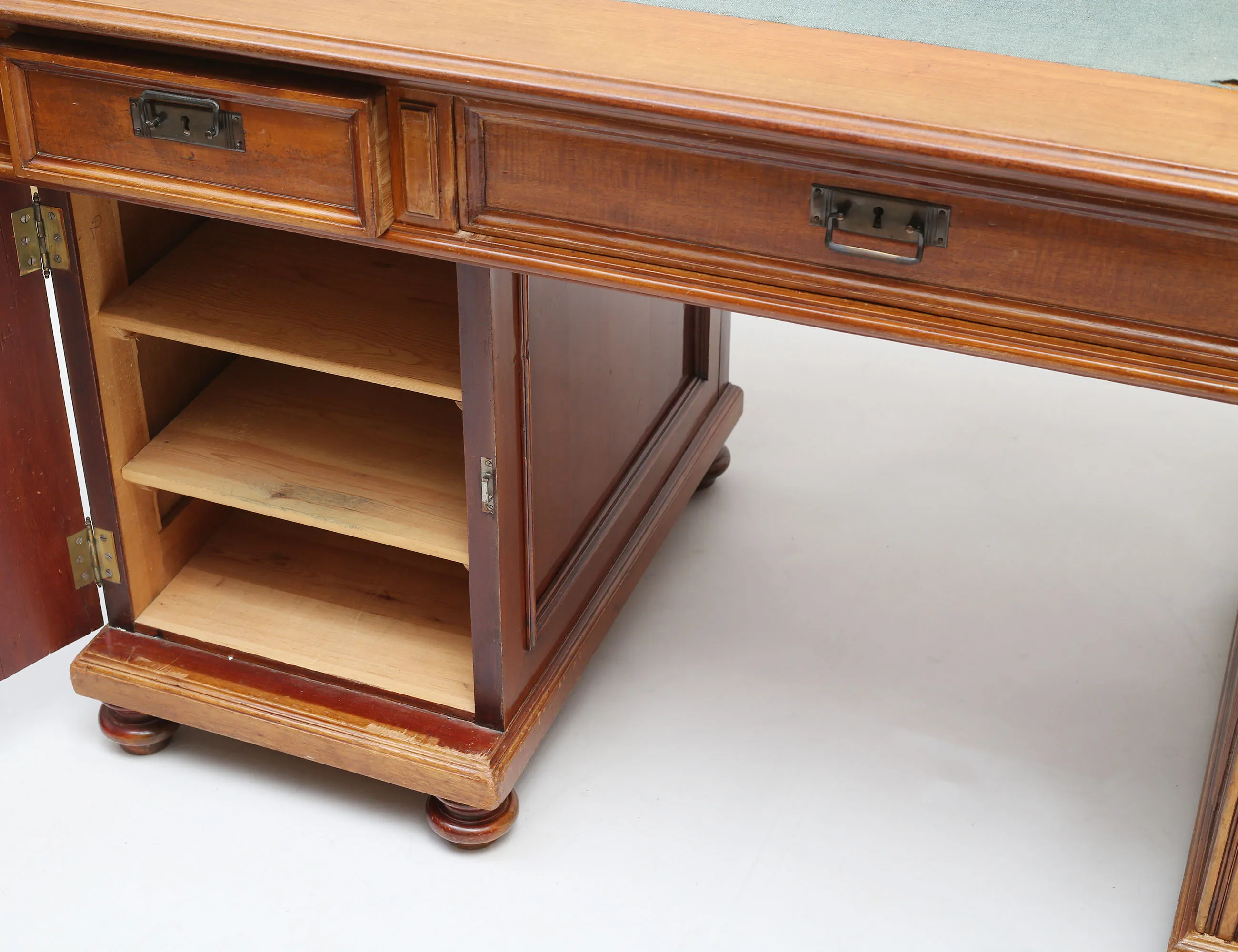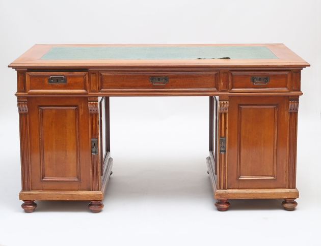 mahogny, skivan med infälld textil, tre lådor i sargen, två hurtsar med lådor respektive hyllplan, beslag i mässing, fristående, höjd 80, bredd 150, djup 80 (bruksslitage, textil med skada)