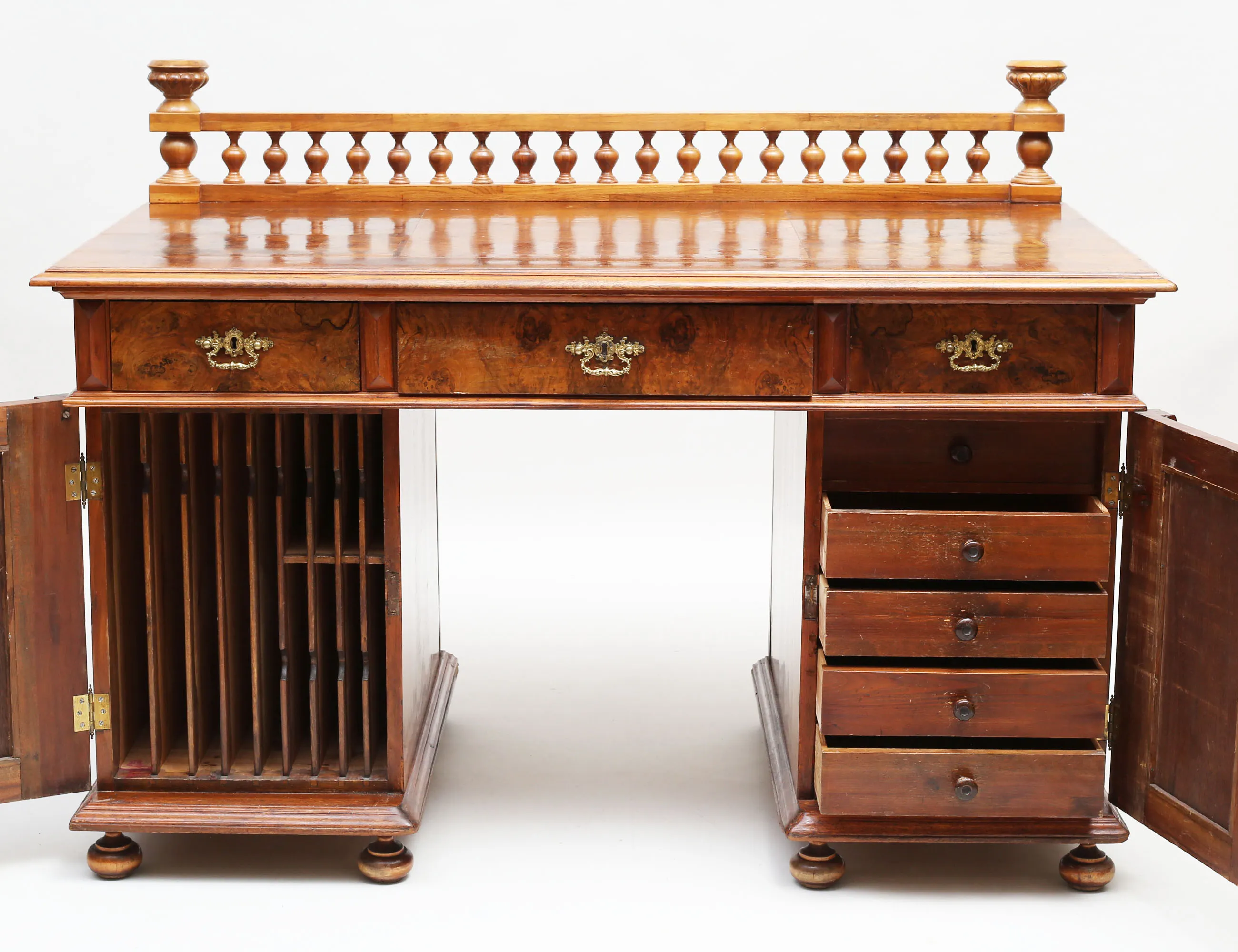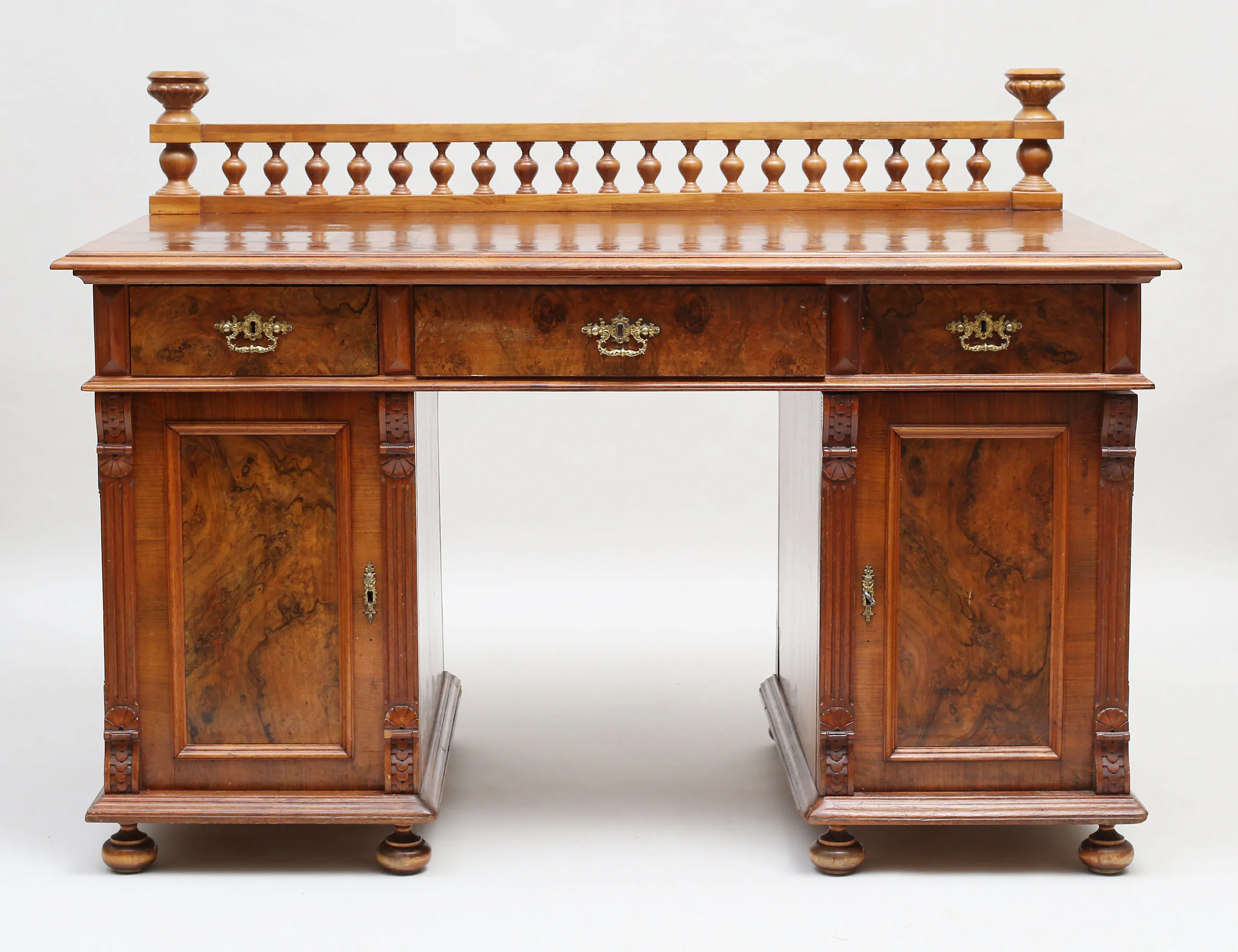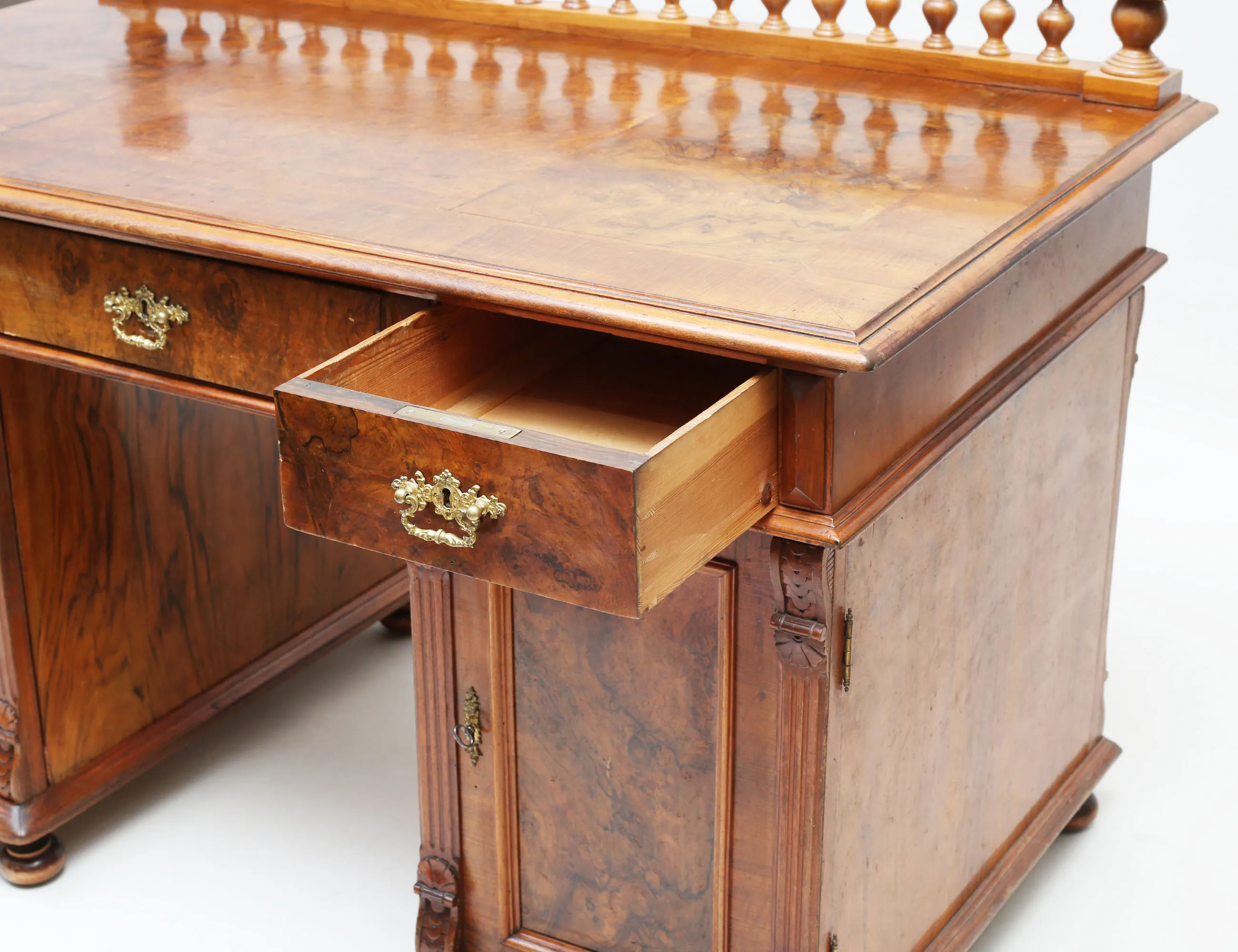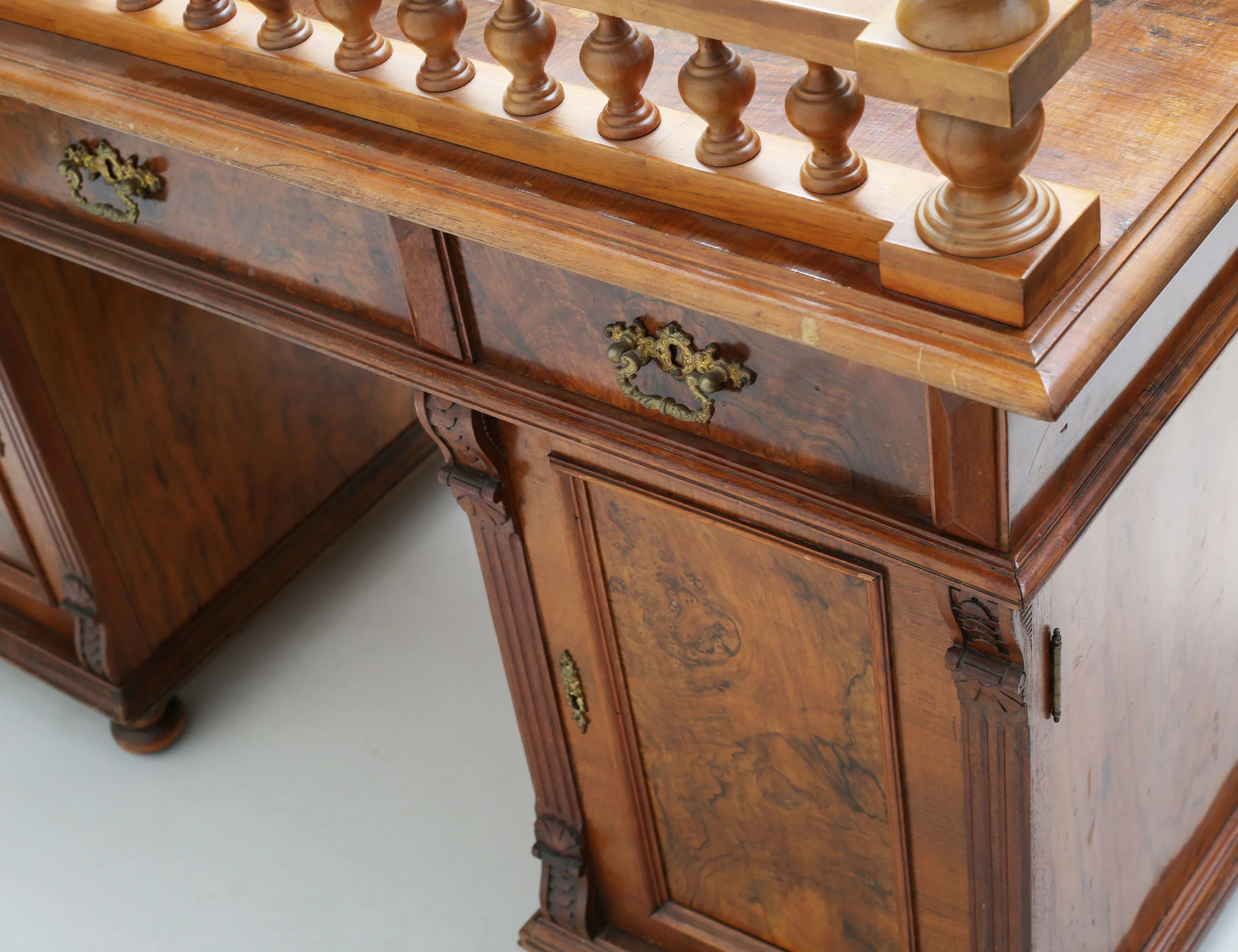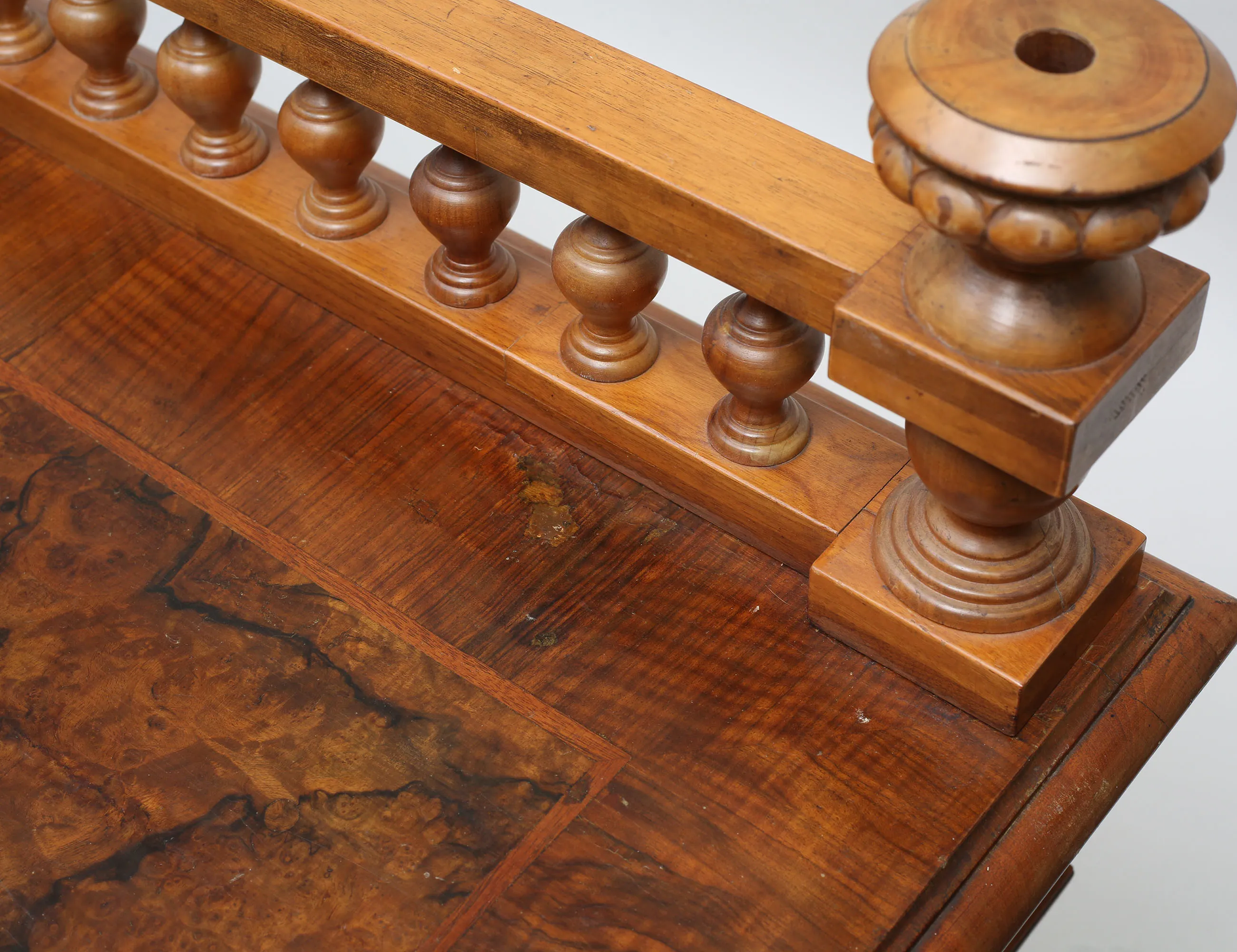 med balustrad, valnöt och valnötsrot, draghandtag i ornamenterad mässing, lådor och fack, fristående, frånsidan med blindfront, höjd 85 (107), bre3dd 148, djup 85 (smärre bruksslitage/fläckar)