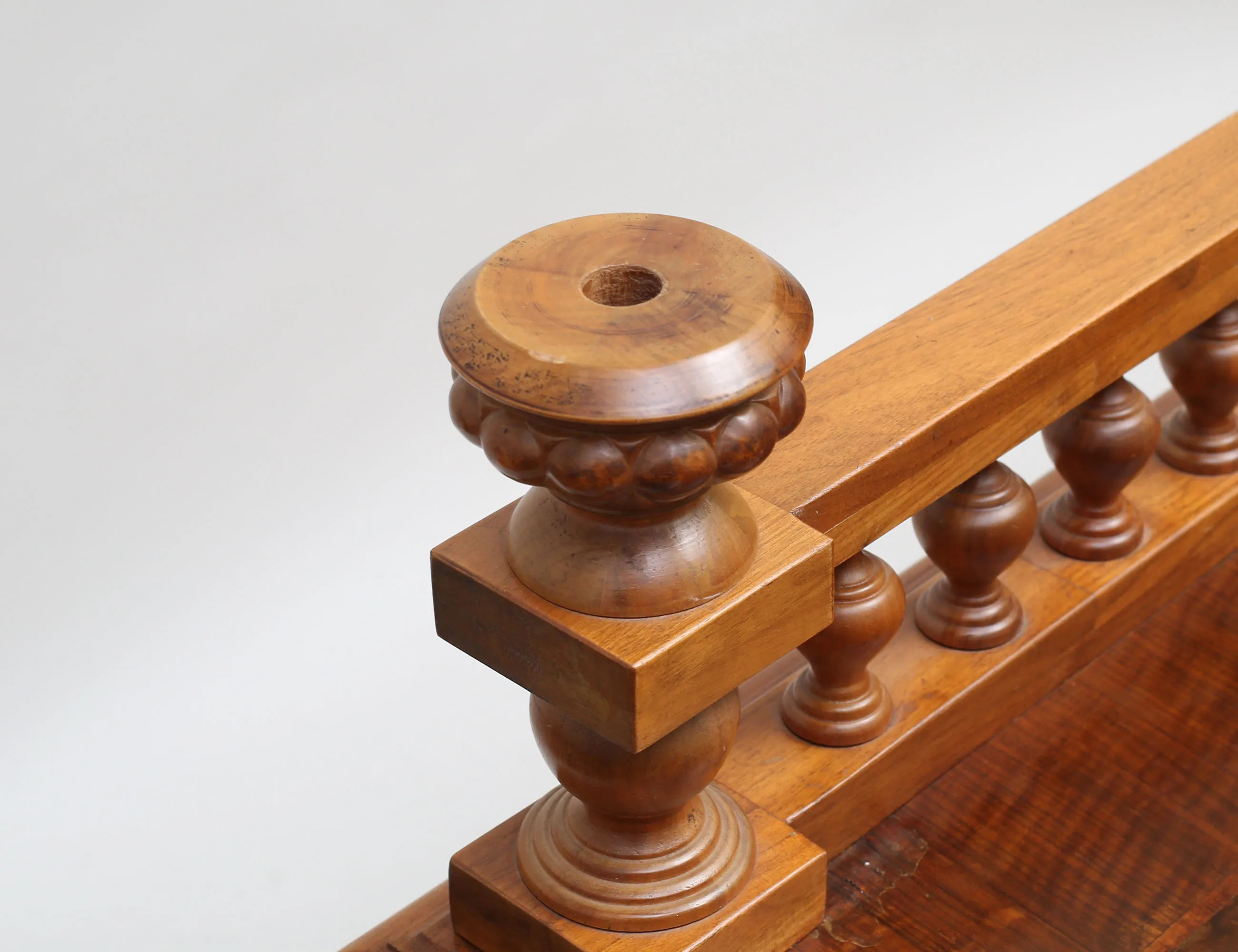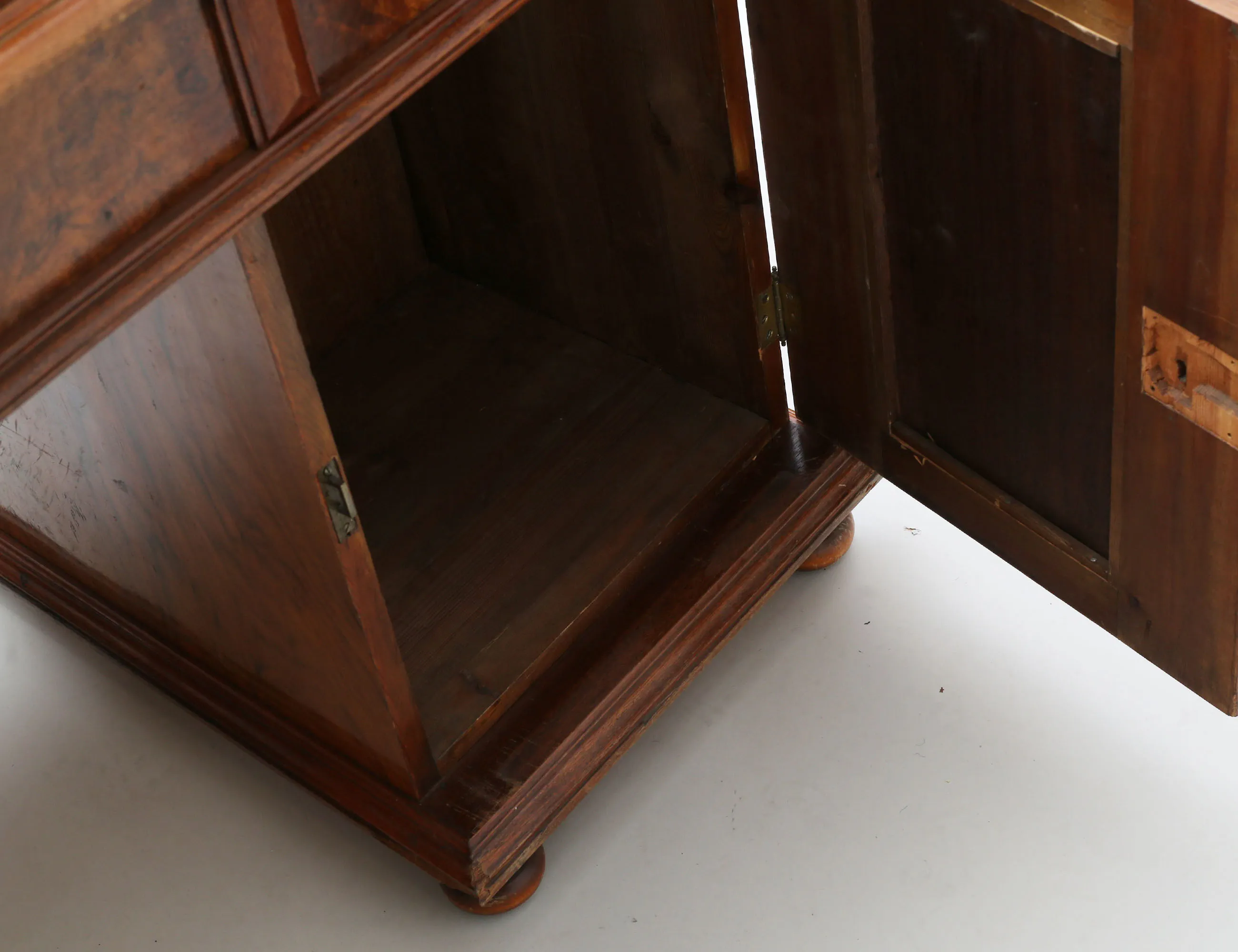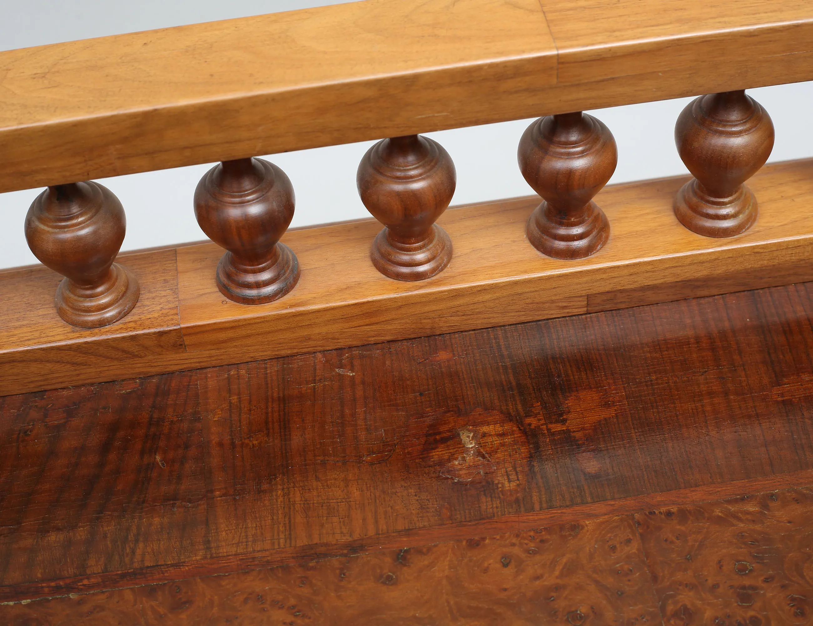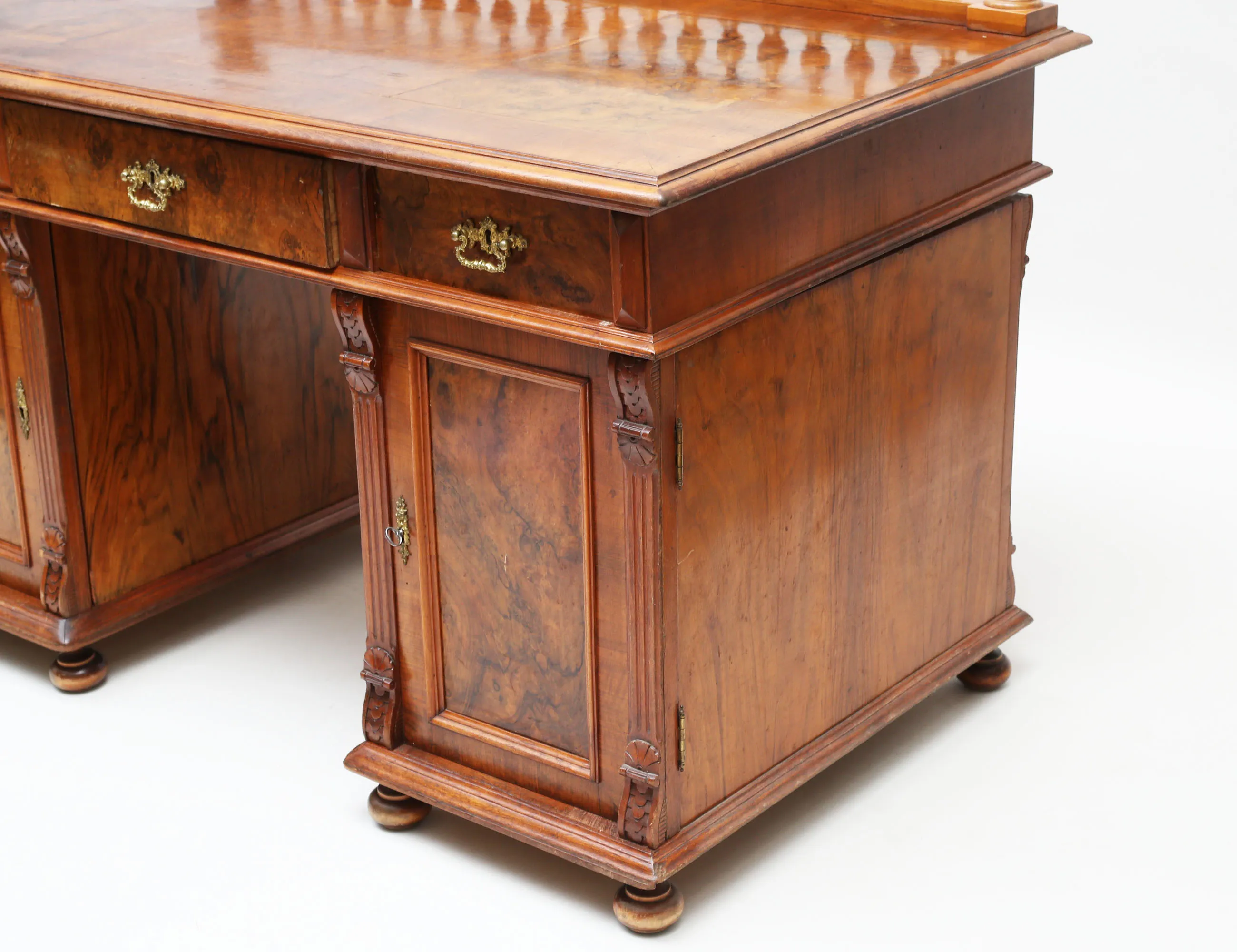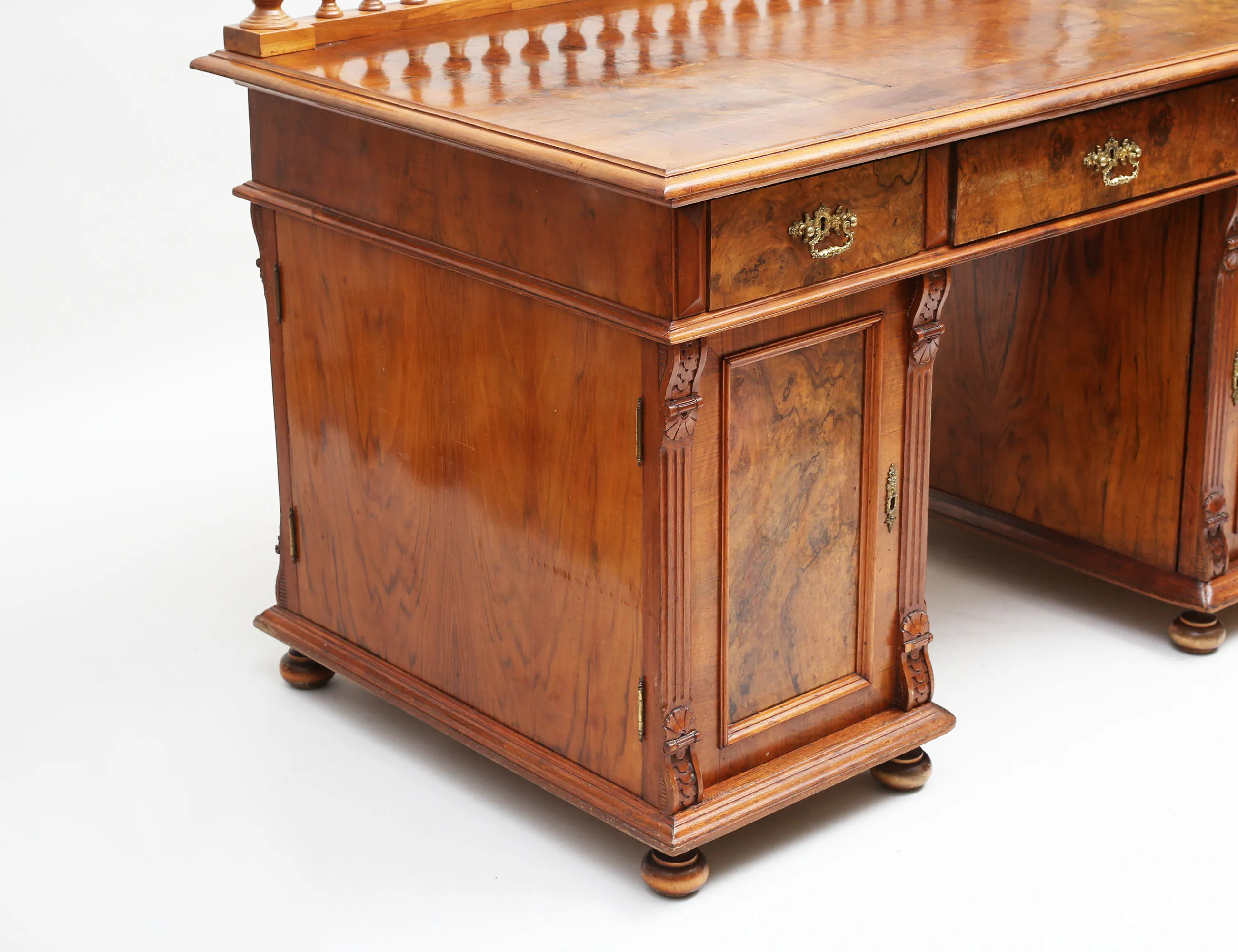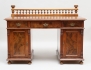 med balustrad, valnöt och valnötsrot, draghandtag i ornamenterad mässing, lådor och fack, fristående, frånsidan med blindfront, höjd 85 (107), bre3dd 148, djup 85 (smärre bruksslitage/fläckar)