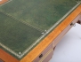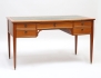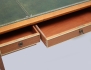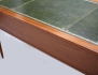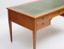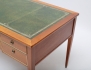 fristående, mahogny, skiva med infällt grönt läder med stansad dekor, fem lådor, lister, beslag och fotavslut i mässing, höjd 75, bredd 135, djup 75