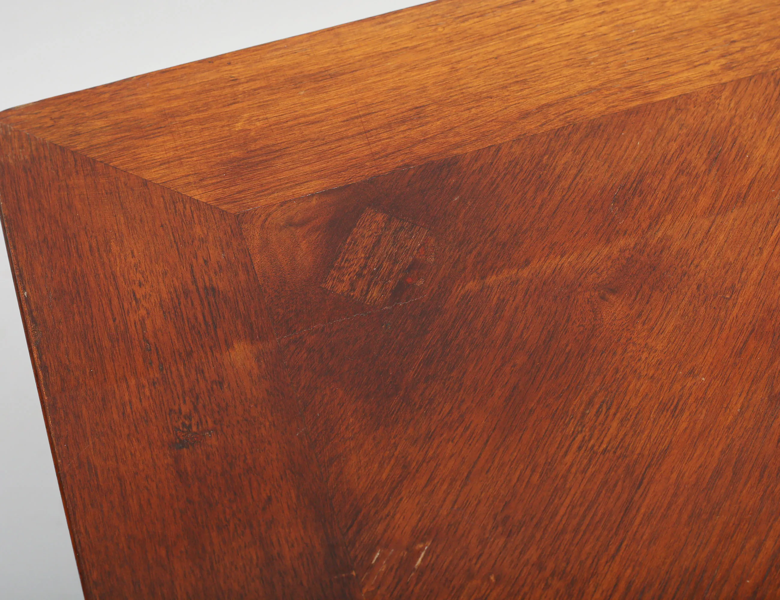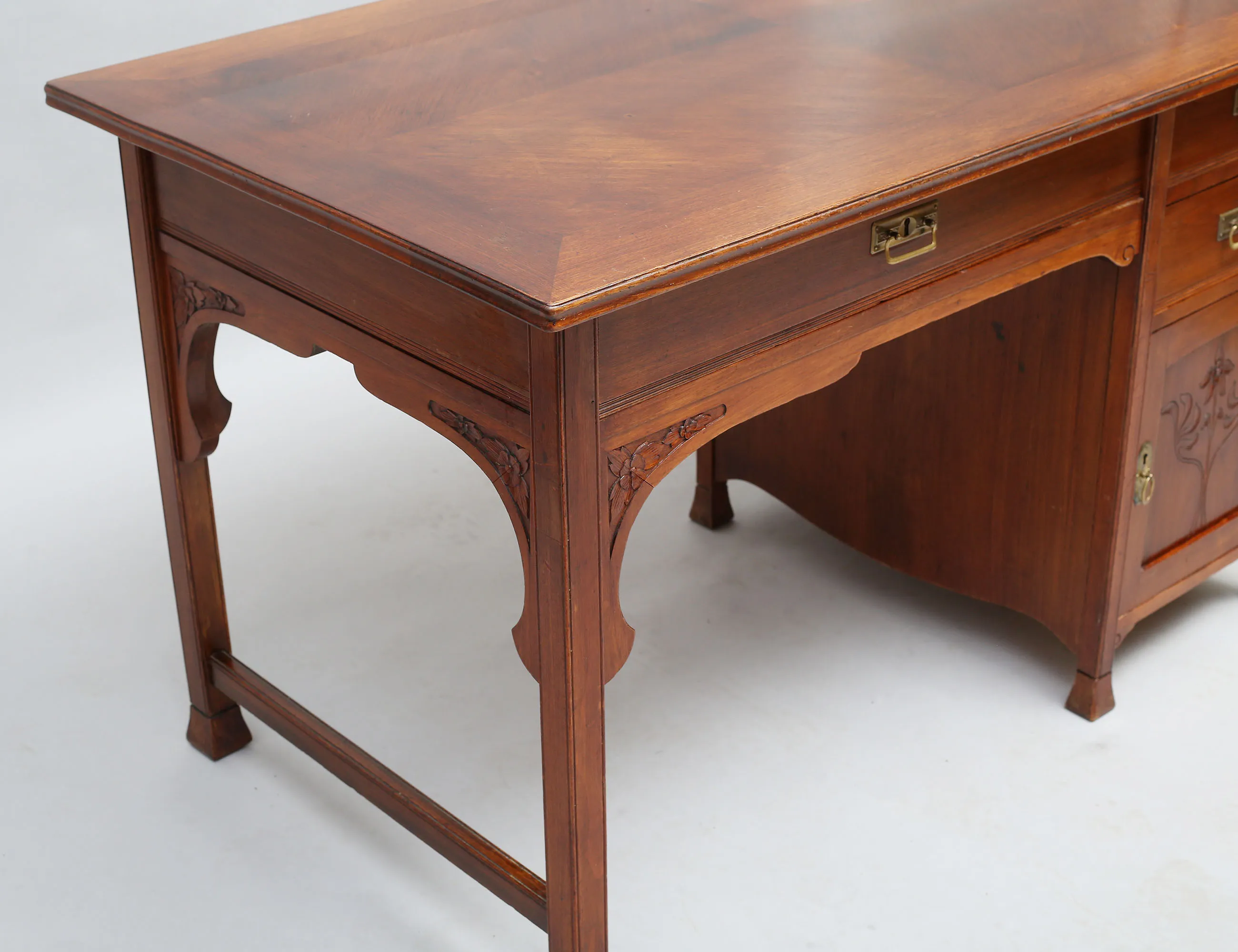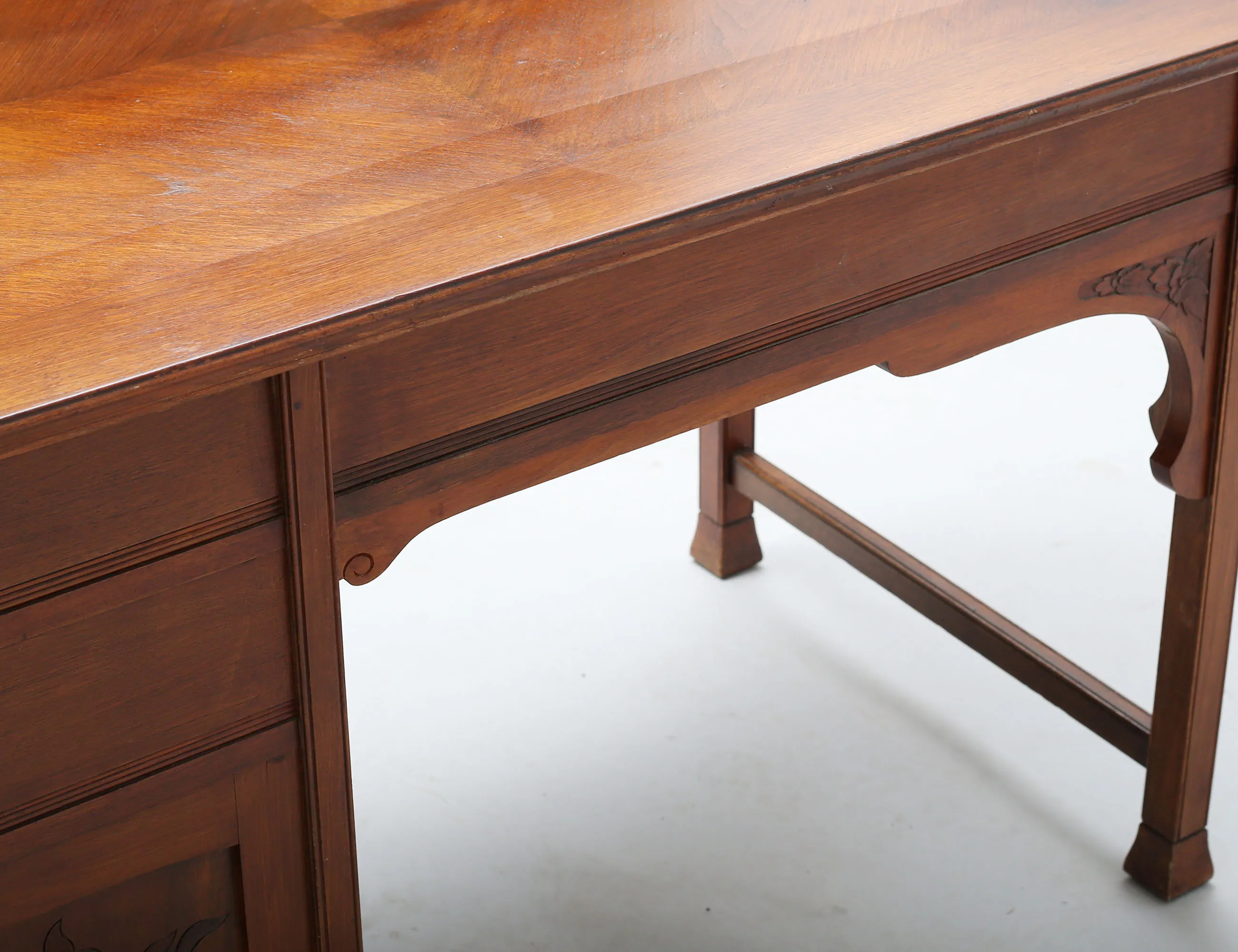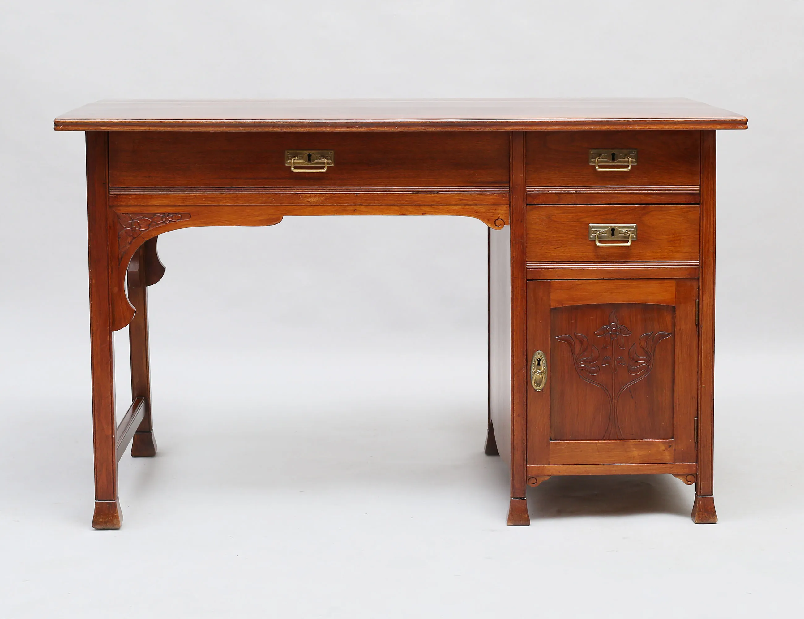 mahogny, träskuren dekor av stiliserande blommor, tre lådor, en skåpsdörr, beslag i mässing, fristående, höjd 78, bredd 125, djup 75 (skivan med fanérkomplettering)