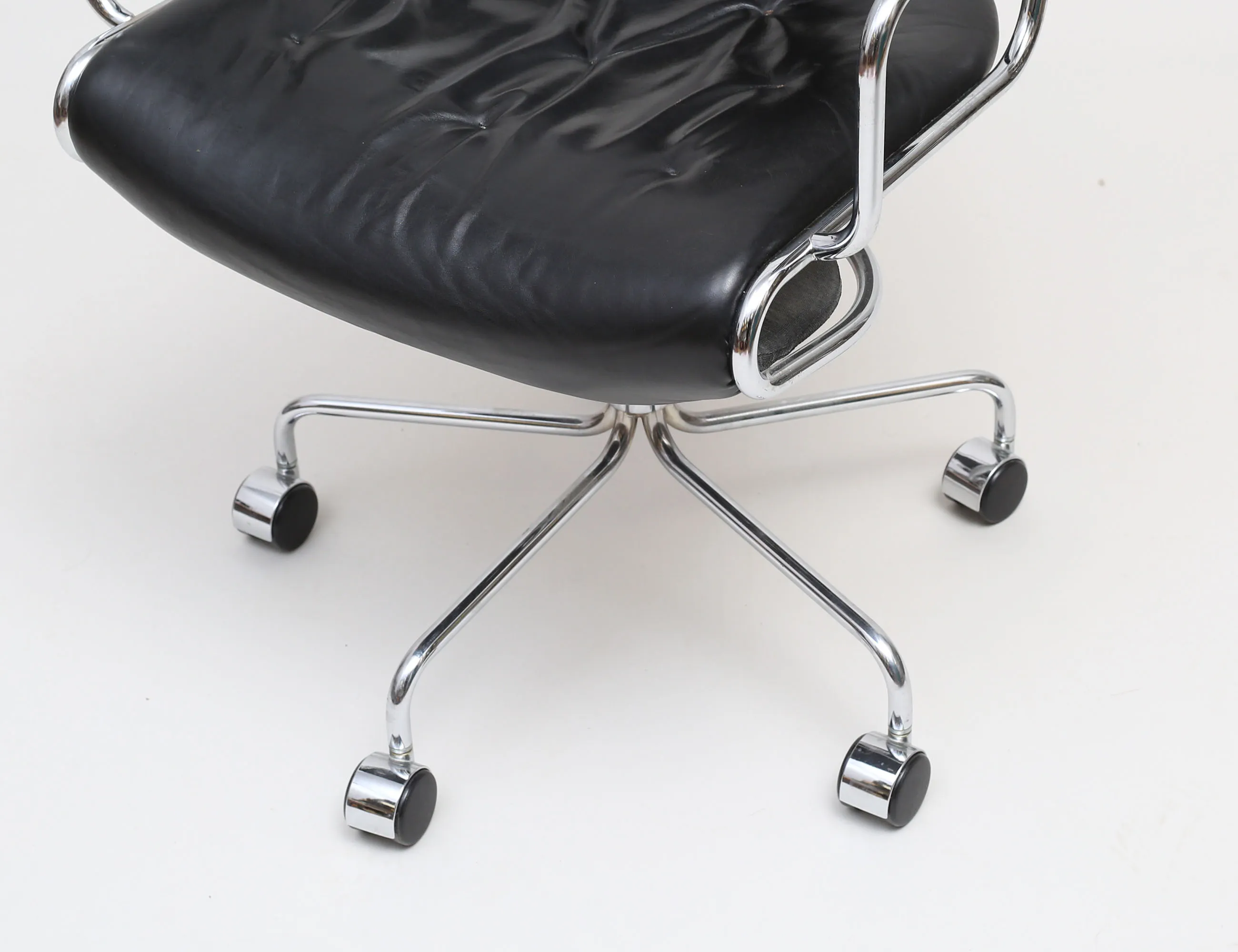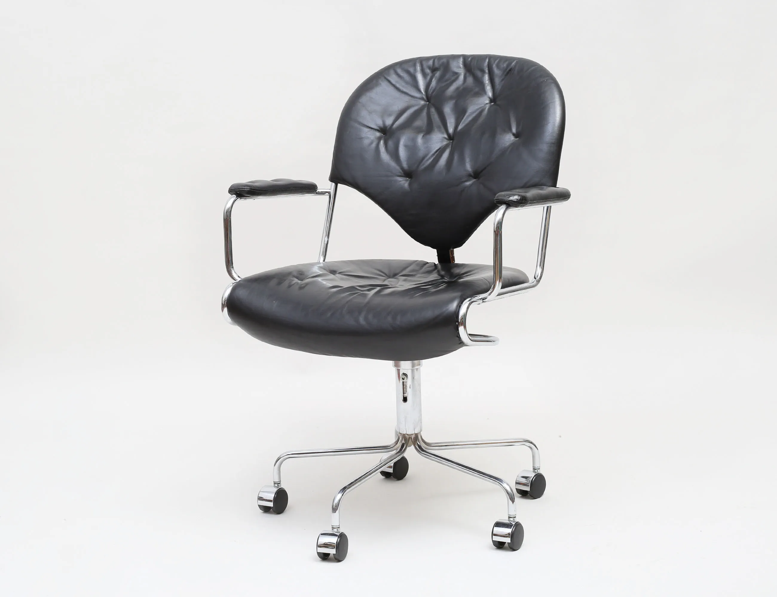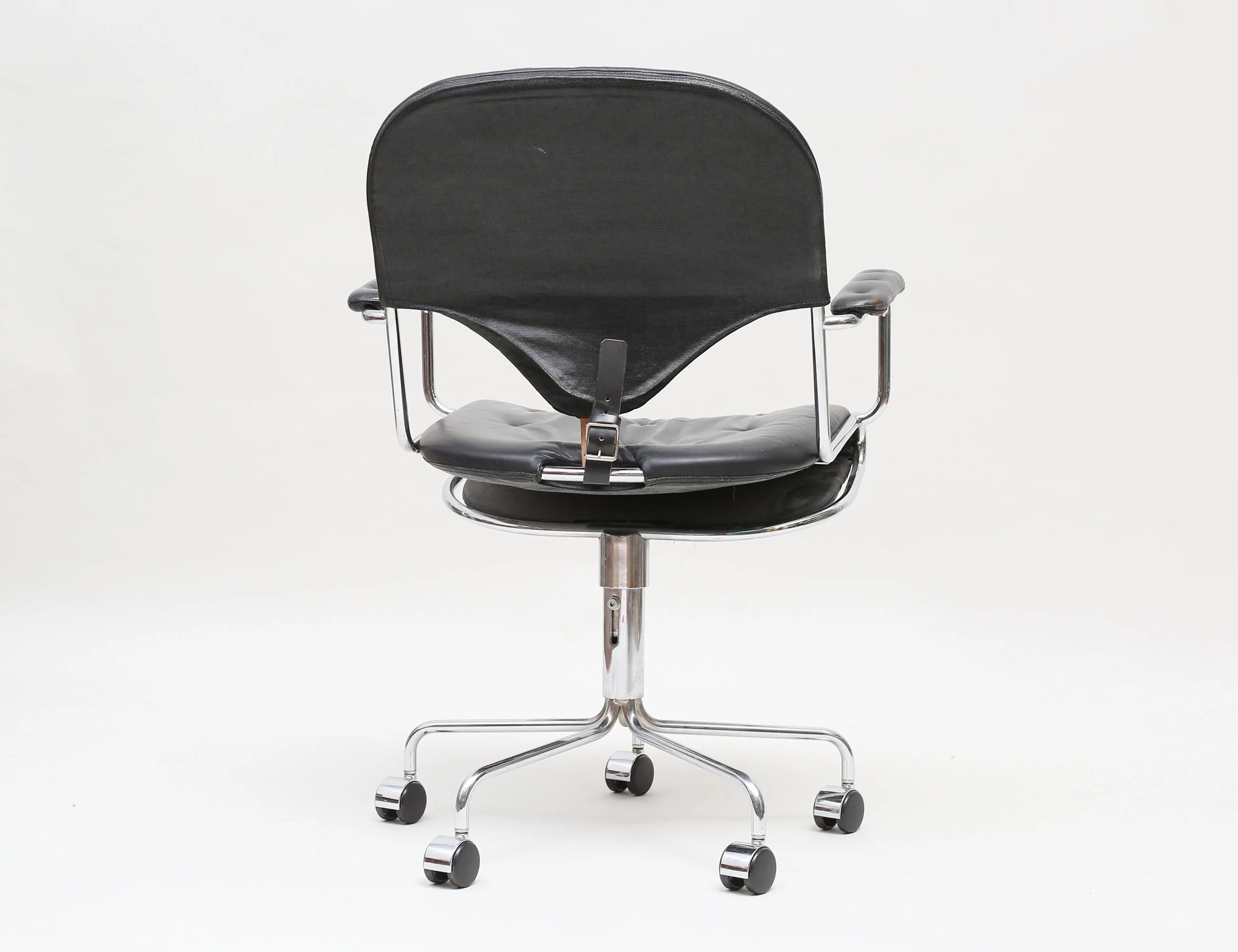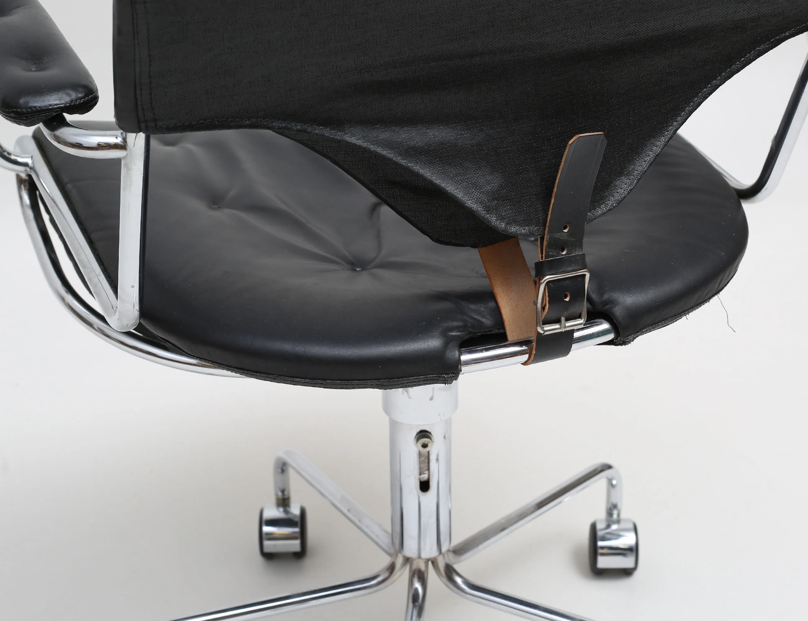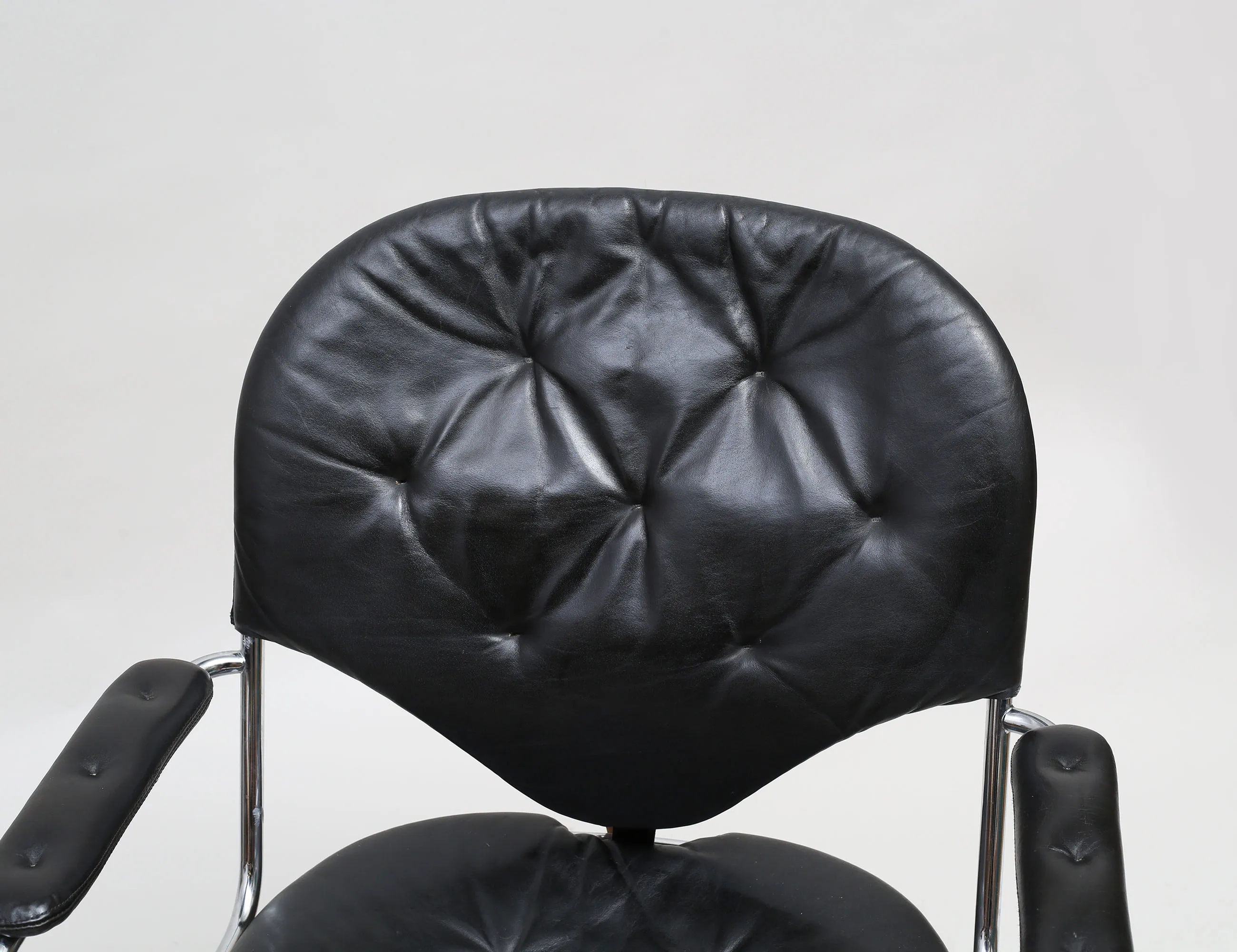 DUX, stomme i kromad metall, fast stoppad sits och rygg, svart skinnklädsel, sitthöjd 50, höjd 90, bredd 62 (smärre bruksslitage)