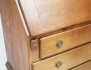 ek, uppsvängt krön, överdel med två hyllplan och skedhylla, nederdel med framåtöppnad skrivklaff, lådinredning, tre lådor, beslag i mässing, höjd 200, bredd 116, djup 53 (omarbetat, renoverat, torkspricka, en dragknopp med skada)