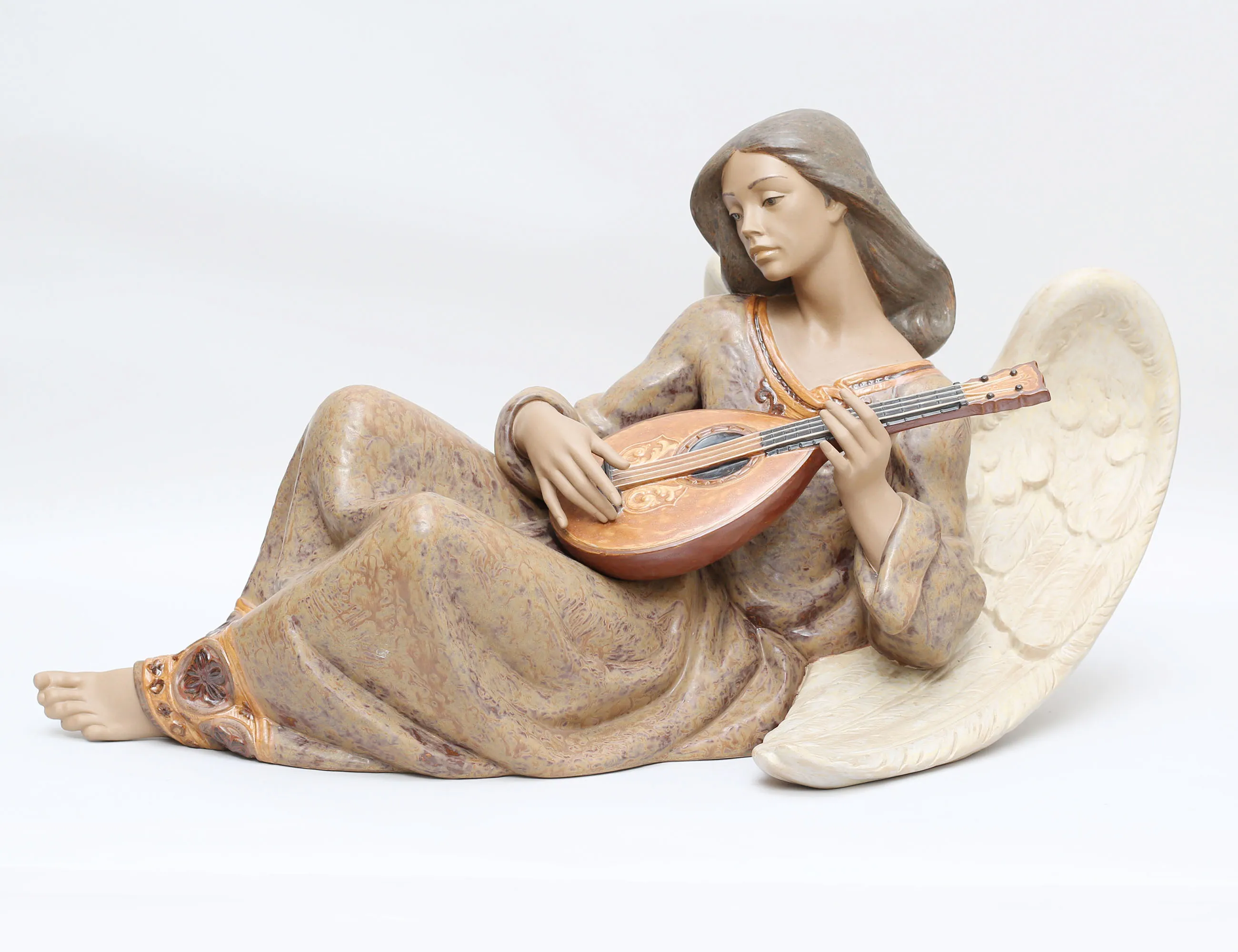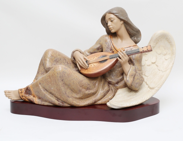 José Puche Lladro, ängel med mandolin, nummer 192, signerad, dekor av Consuelo Bauset, certifikat medföljer, lös sockel, höjd 37, bredd 60x32