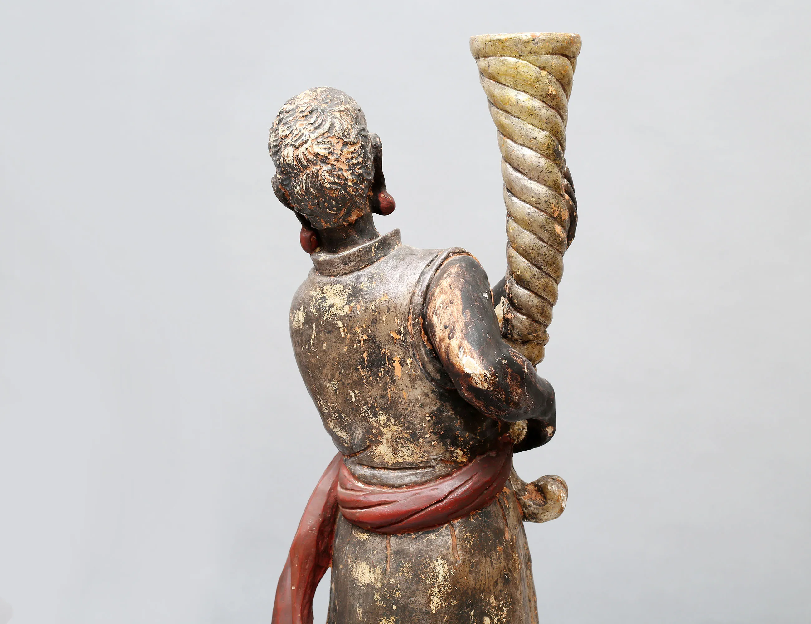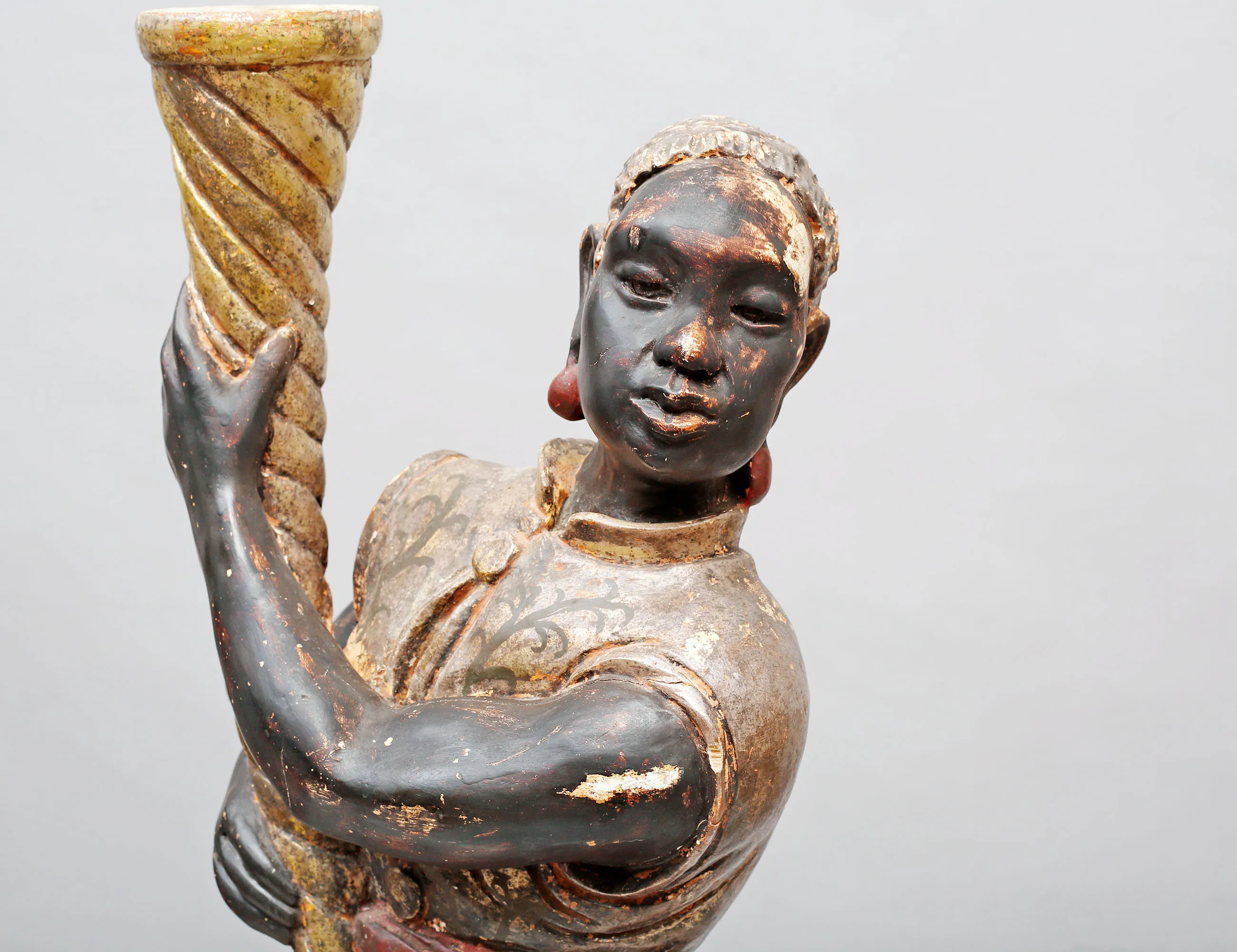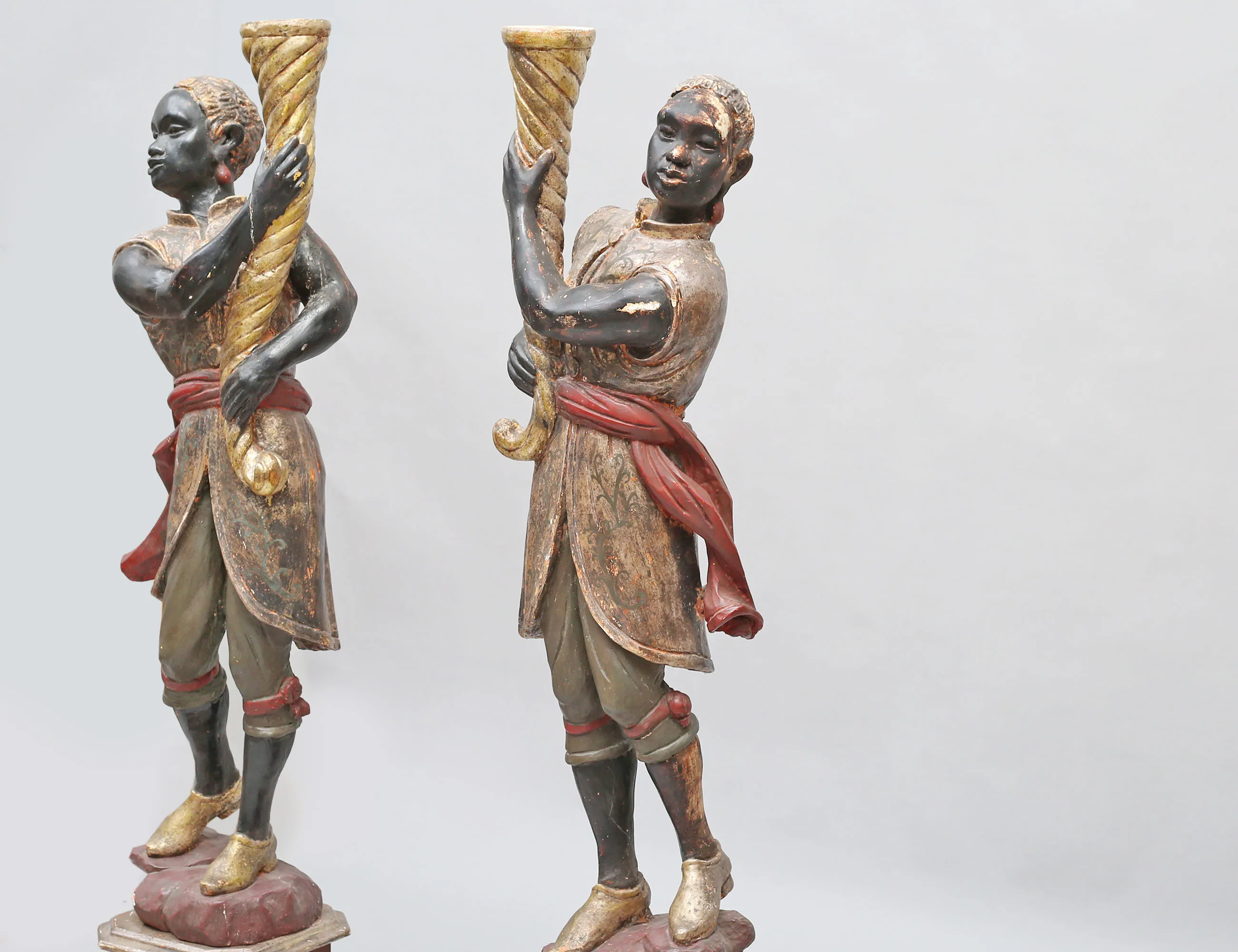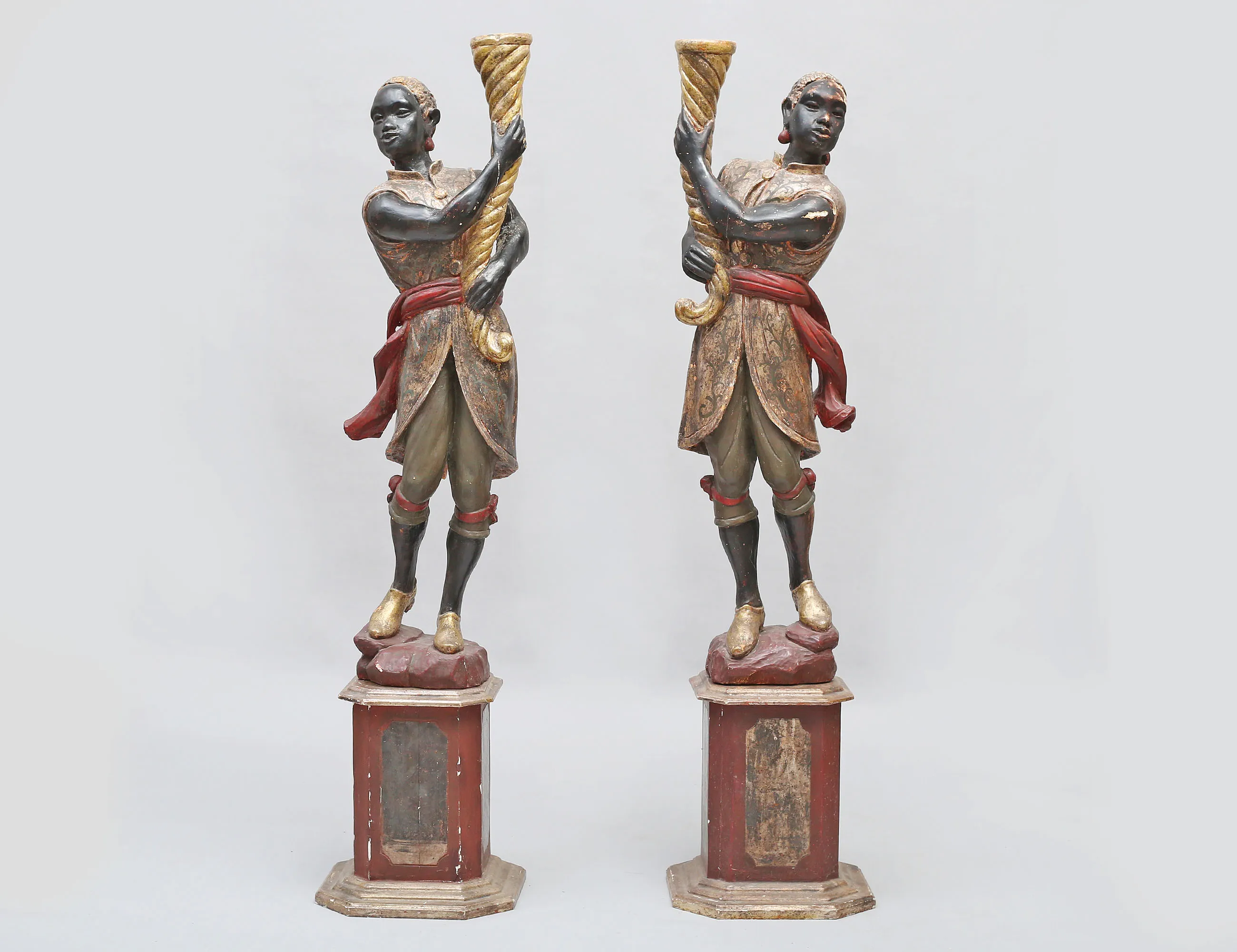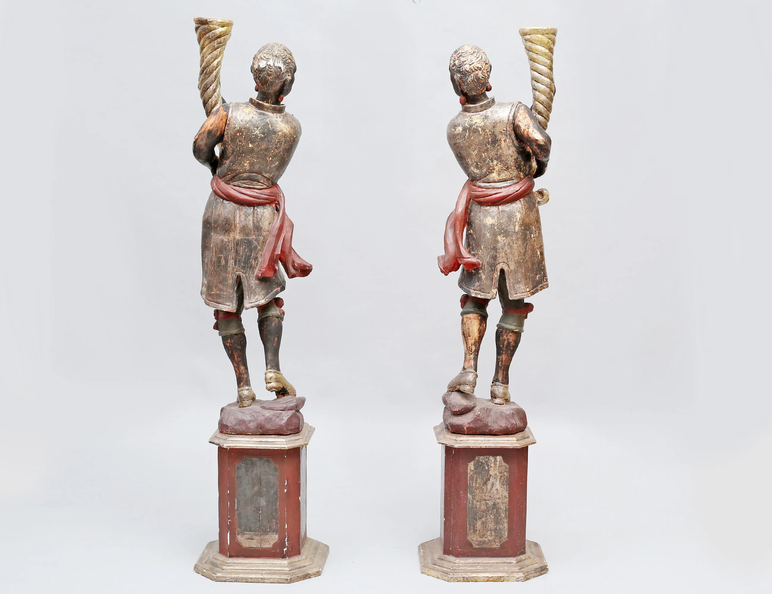 fackelbärare i form av morianer, skulpterat förgyllt och polykromt bemålat trä med gipsgrundering, monterade på oktagonalt fundament, höjd 153 (dekorbortfall, sprickor, en arm med bräckage)