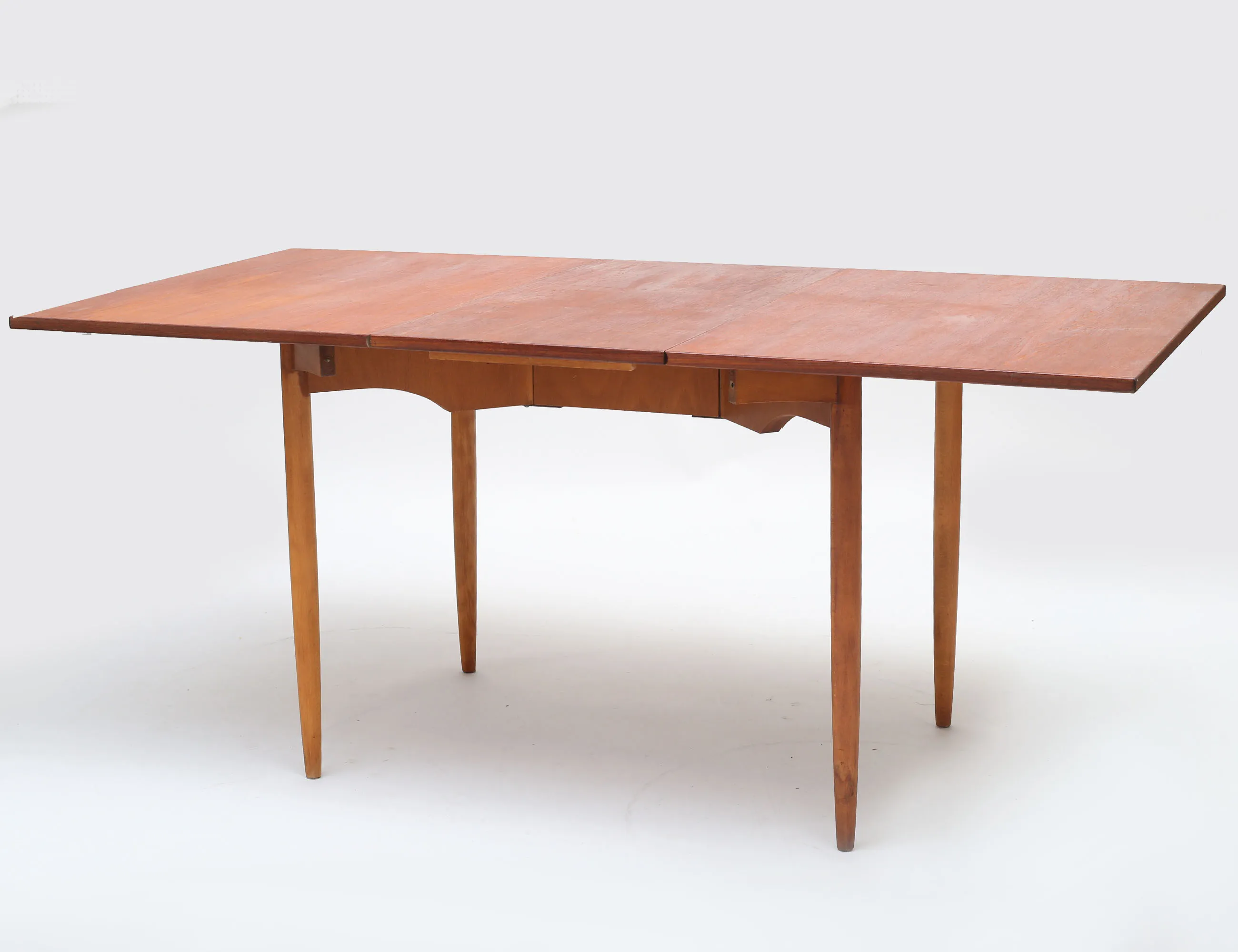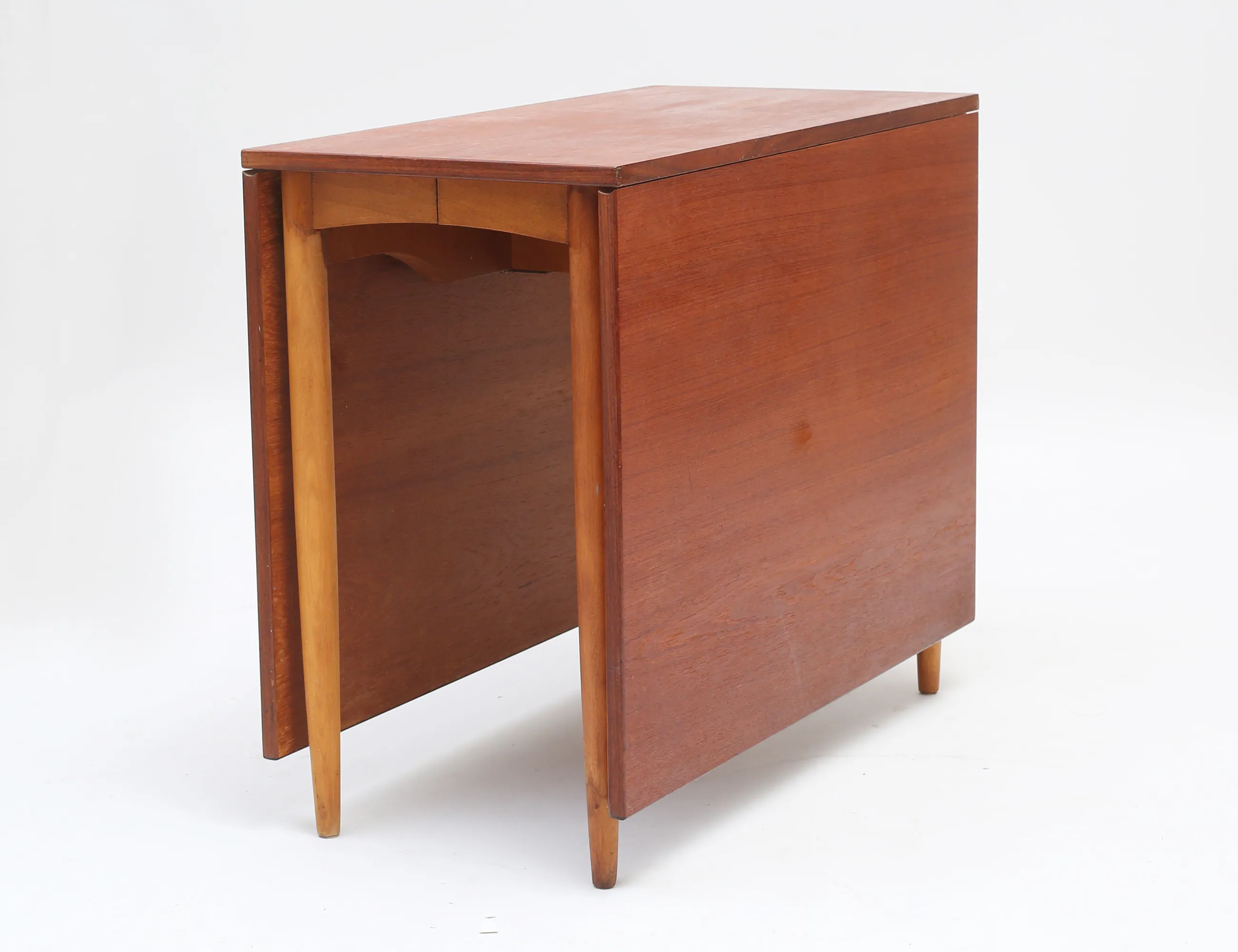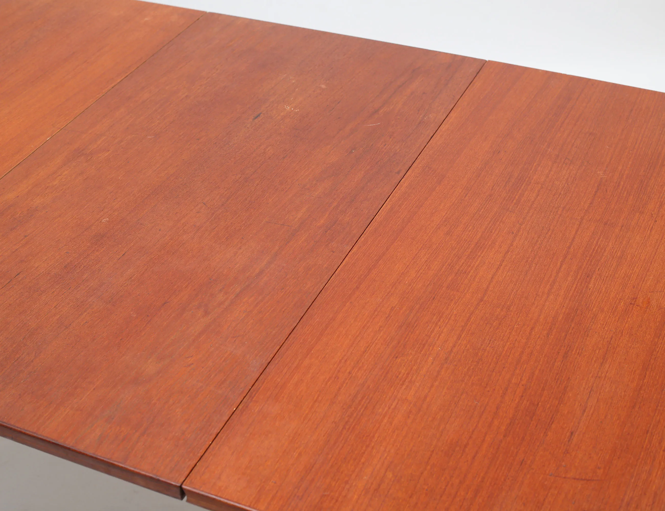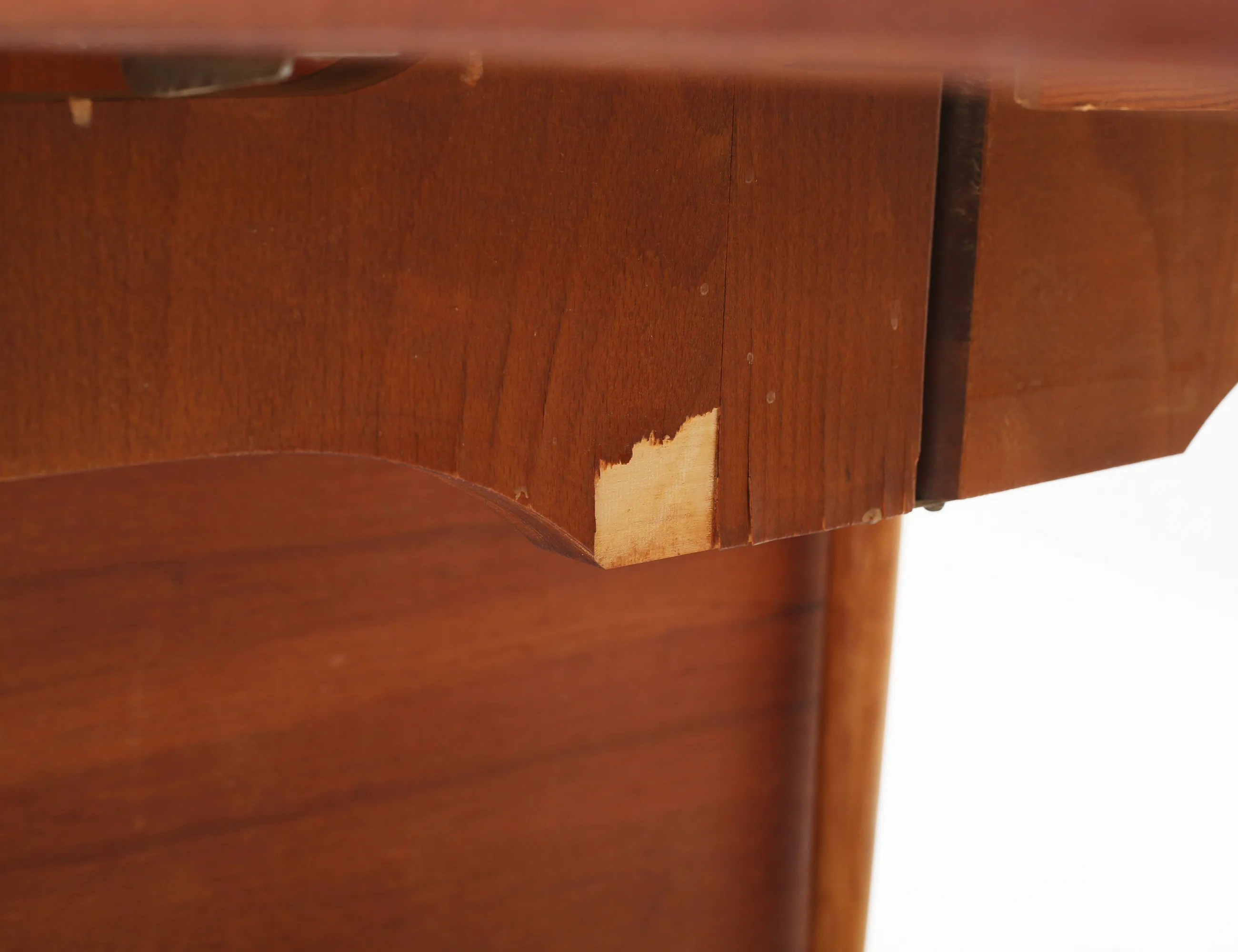 Skaraborgs Möbelindustri Tibro, teak, plakettmärkt, höjd 73, total längd 168, längd 43 (smärre bruksslitage, fläckar, märken, fanerskada undertill)