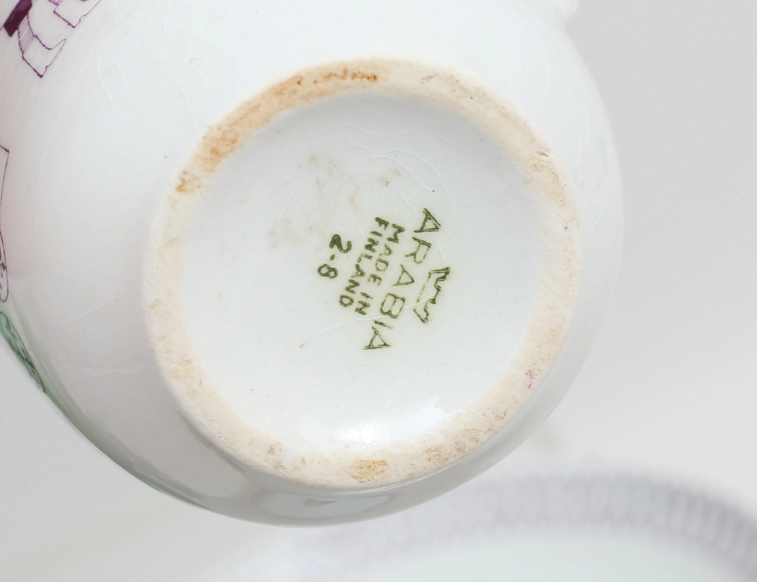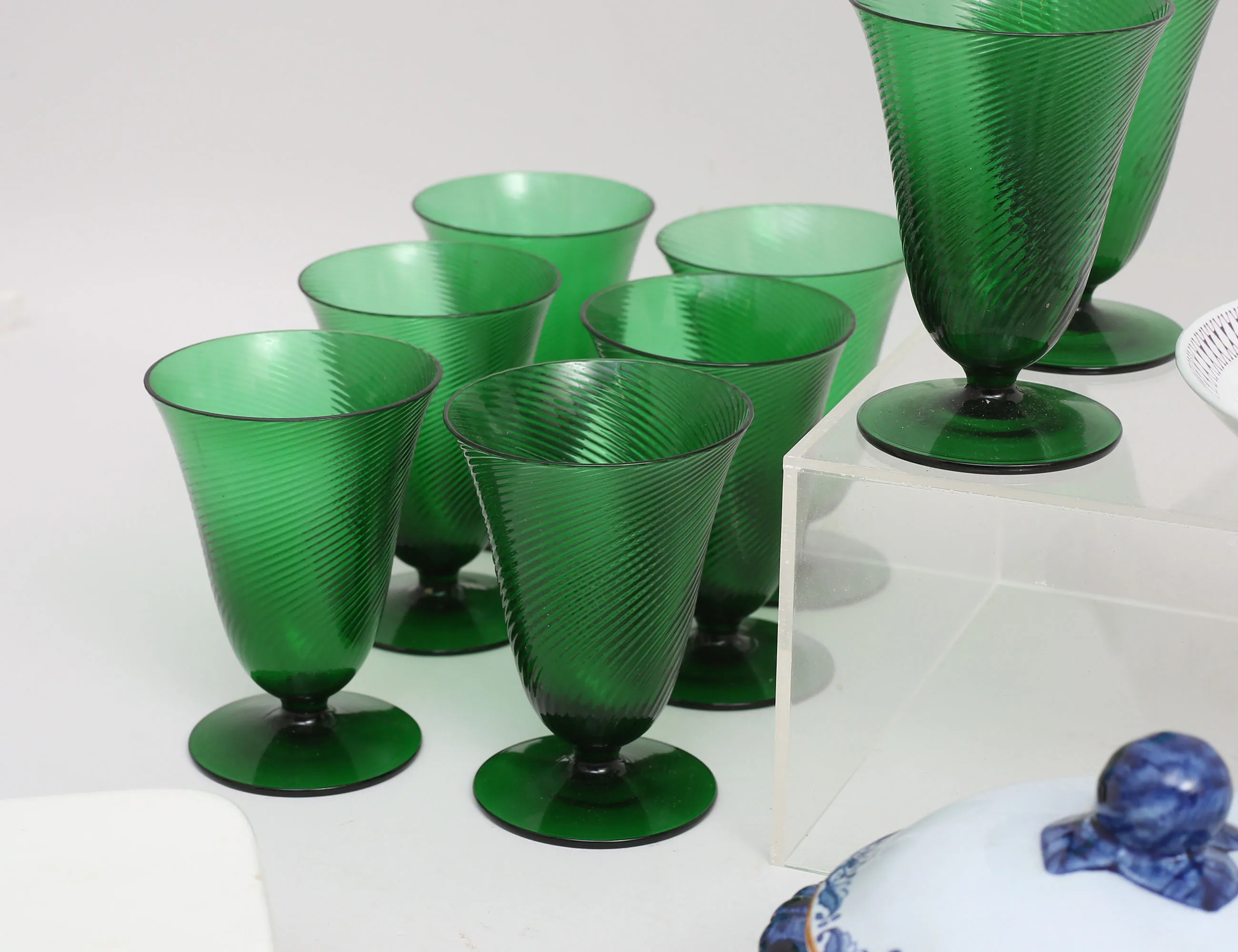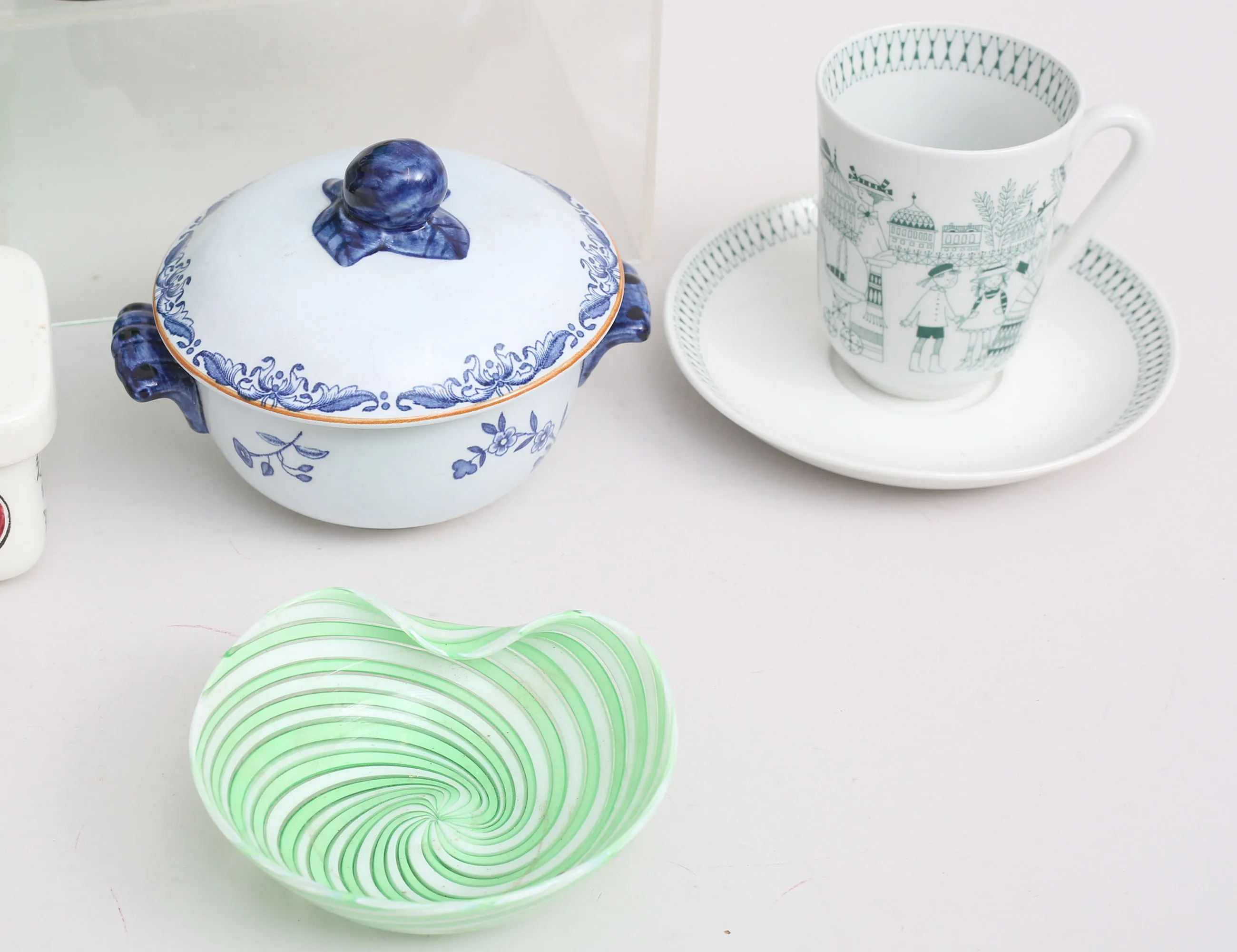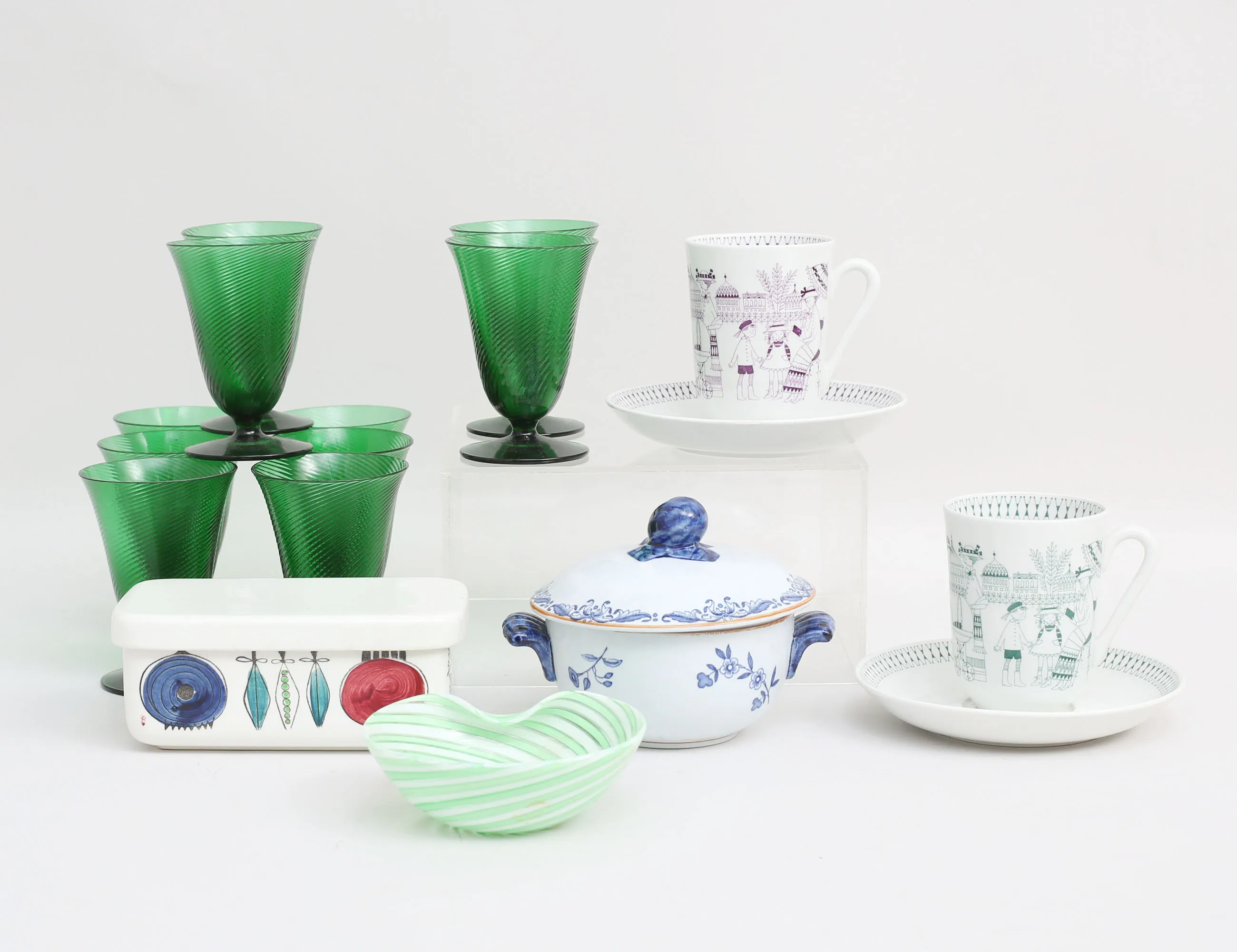 Marianne Westman Rörstrand, 15x8,5, skål med lock "Ostindia", höjd 10, diameter 11, 2 koppar med fat "Emilia" Arabia, höjd 9,5, 10 gröna gas höjd 10, skål troligen Murano Italien, diameter 11