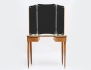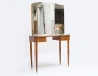 mahognyfanér, två lådor, beslag och fotavslut i mässing, lös skiva i glas, spegel med vikbara sidospeglar, höjd 72/70, bredd 84/86 (glasskivan med mindre nagg)