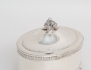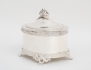 Guldsmeds AB Stockholm 1909, genombrutna tassfötter, lock med pärlstav och knopp i form av blomma, vikt 429 gram, höjd 12, bredd 13 (lockkanten med gåvoinskription)