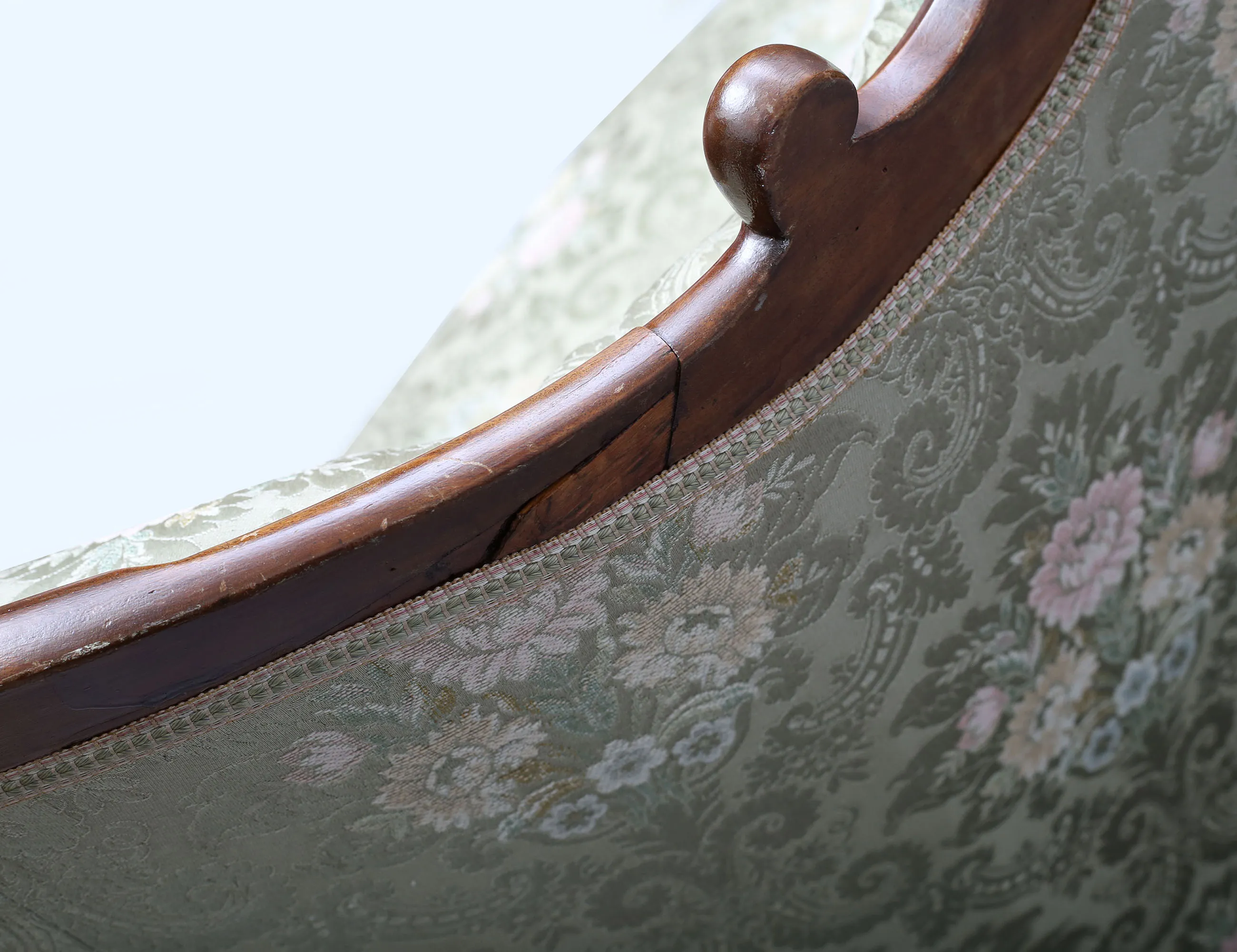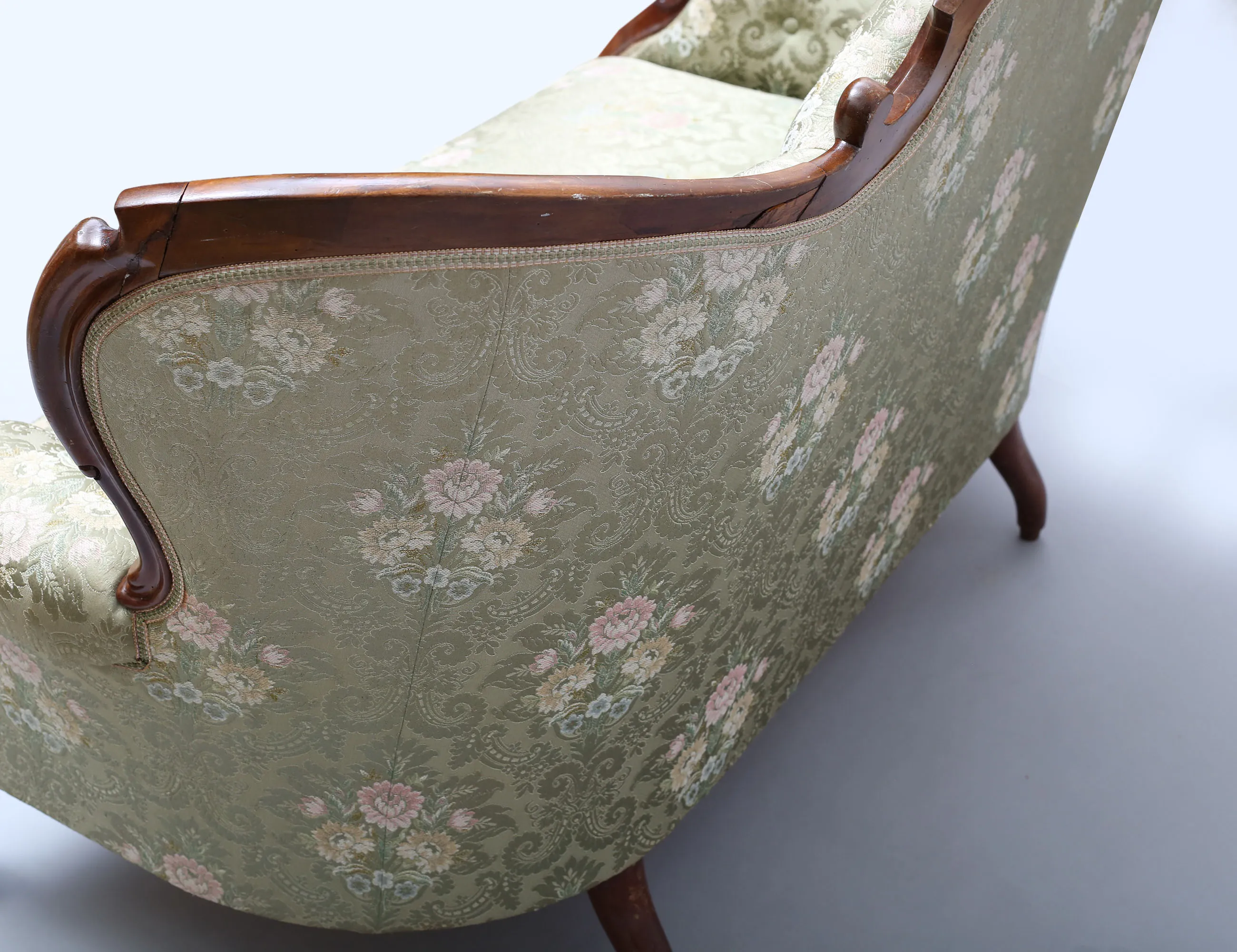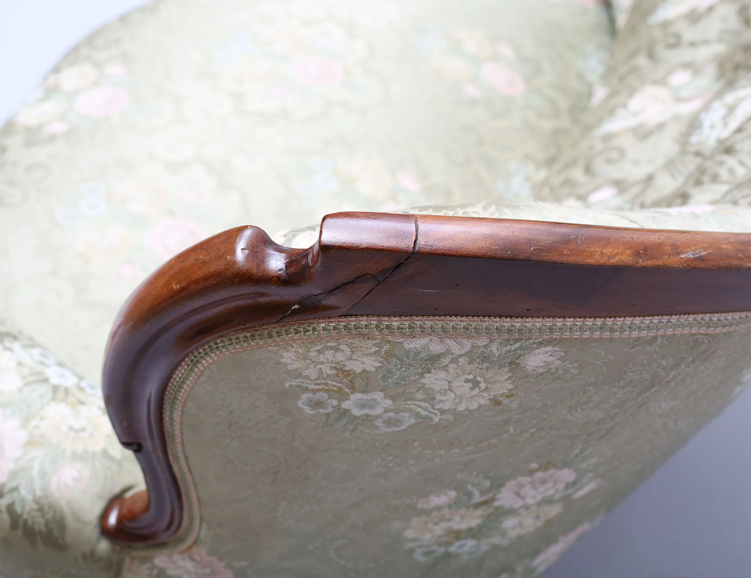 mörkbetsad träskuren stomme, djuphäftad rygg, klädsel i grönblommigt tyg, fristående, höjd 105, bredd 145 (baksidan med mindre lagningar)