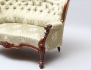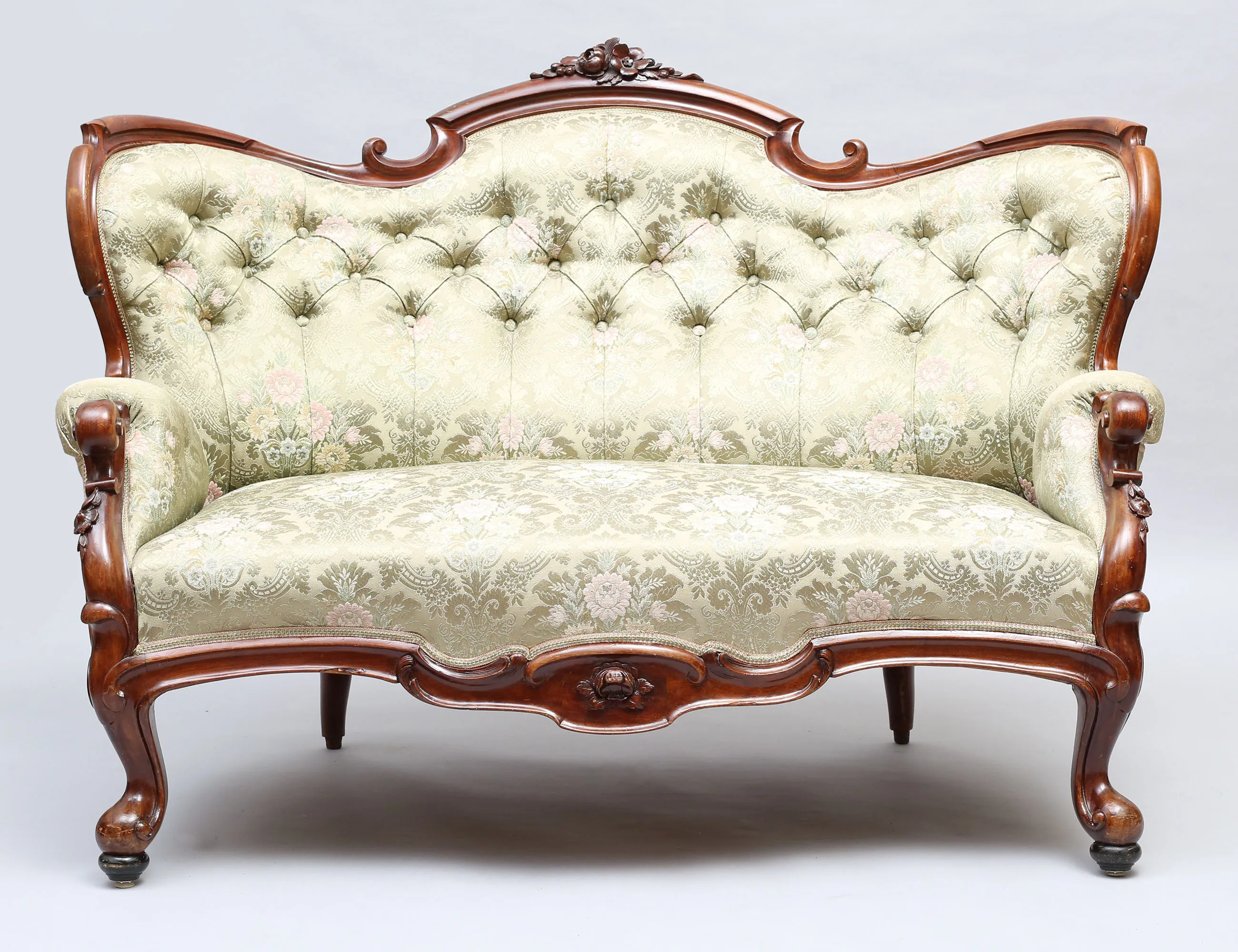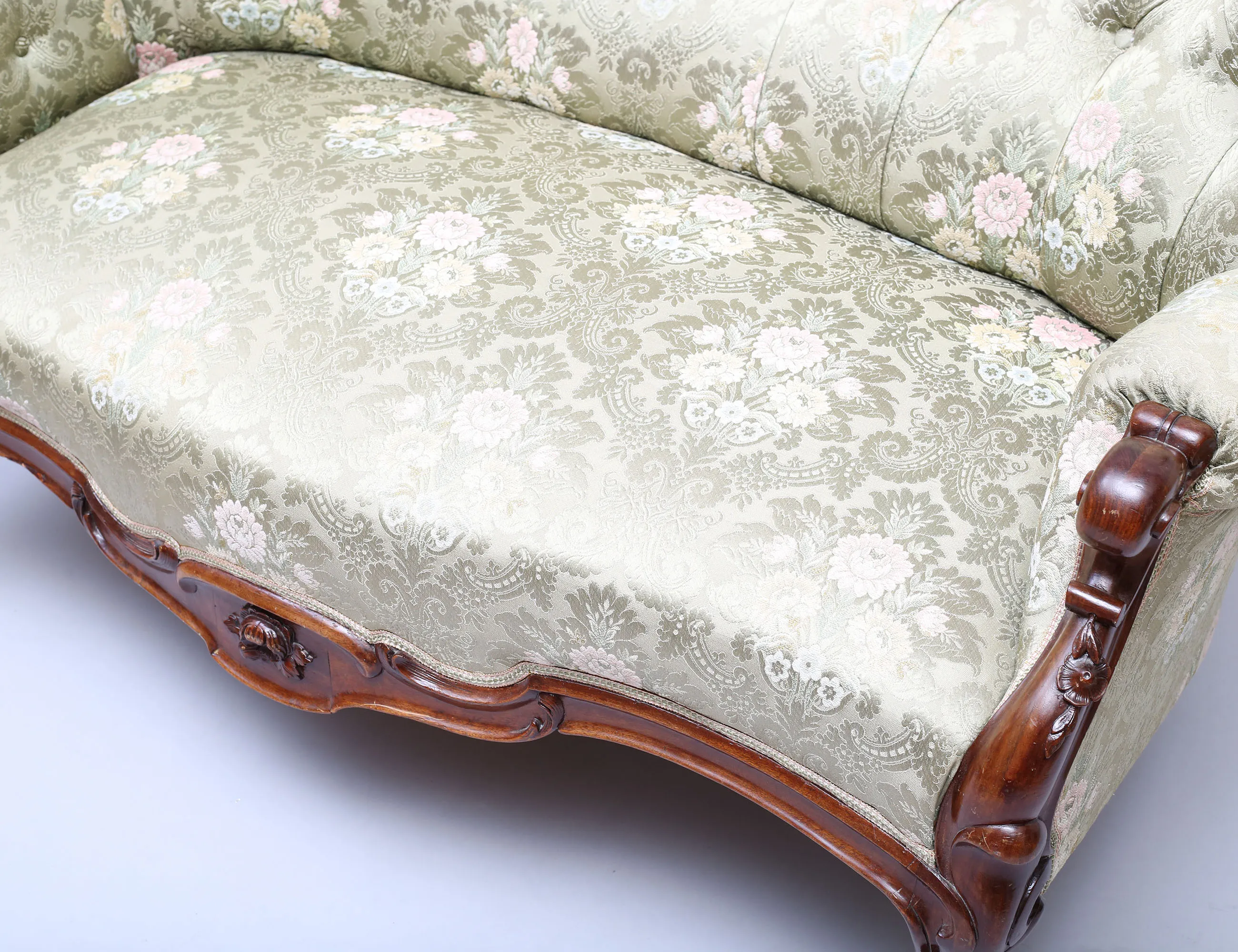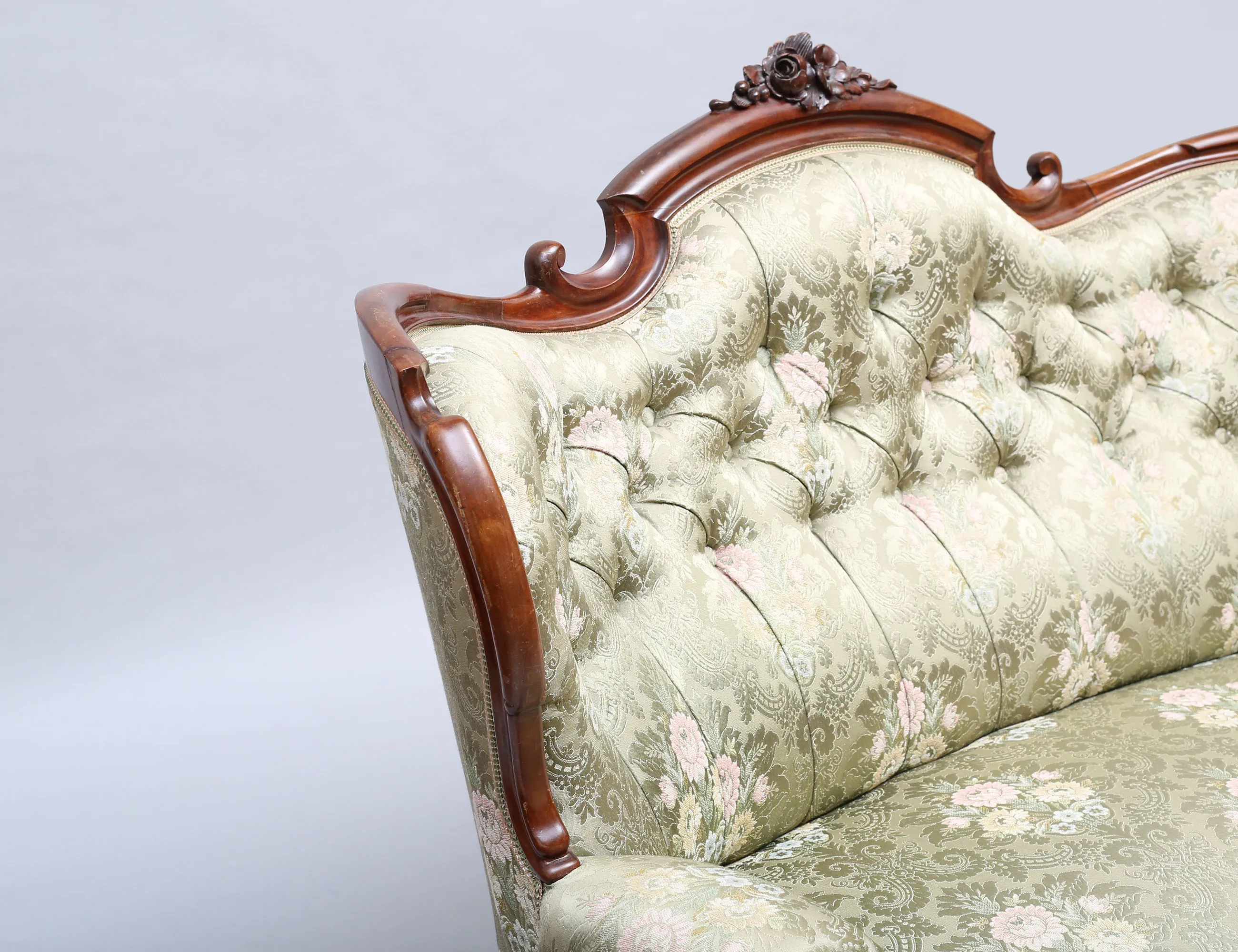mörkbetsad träskuren stomme, djuphäftad rygg, klädsel i grönblommigt tyg, fristående, höjd 105, bredd 145 (baksidan med mindre lagningar)