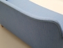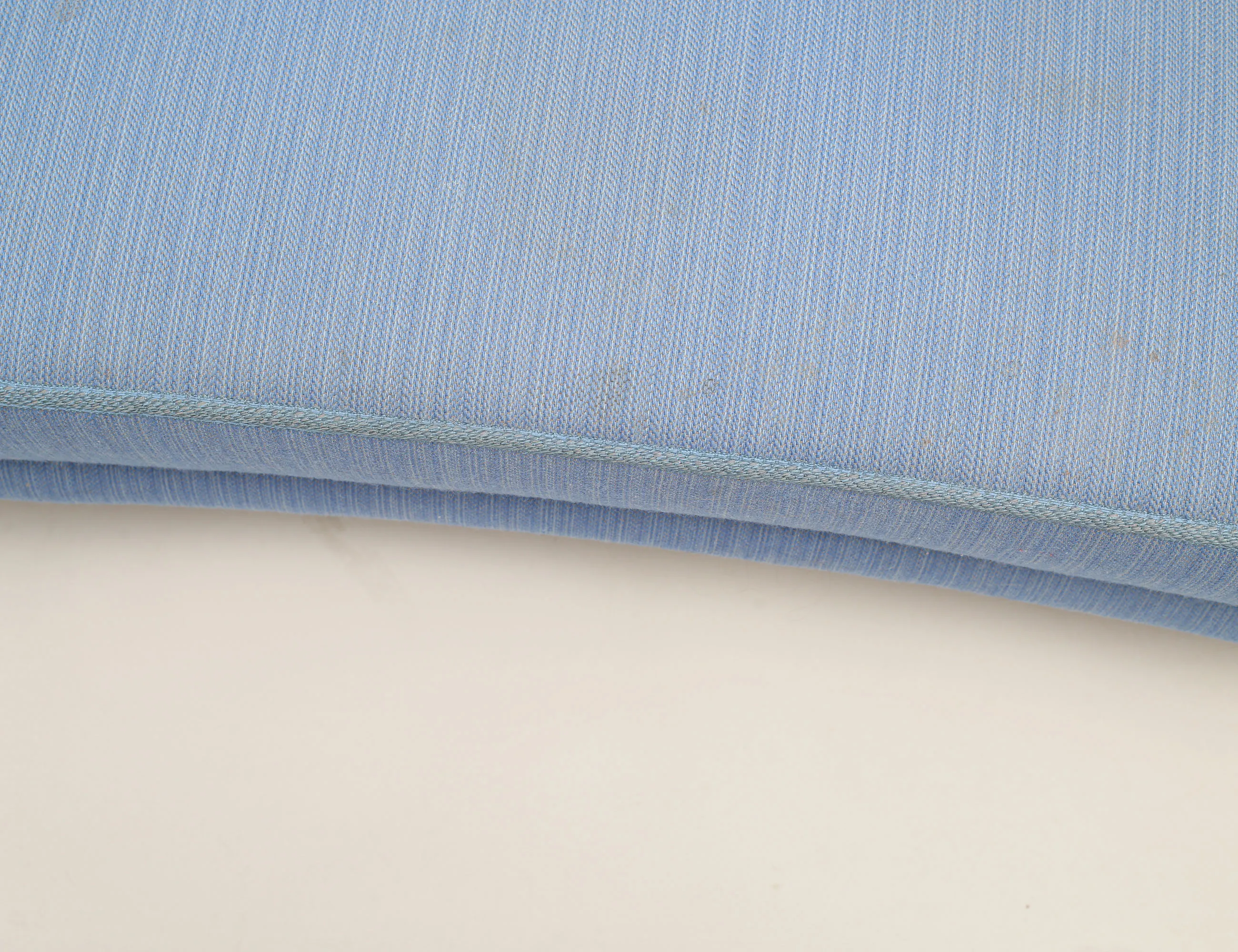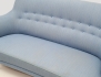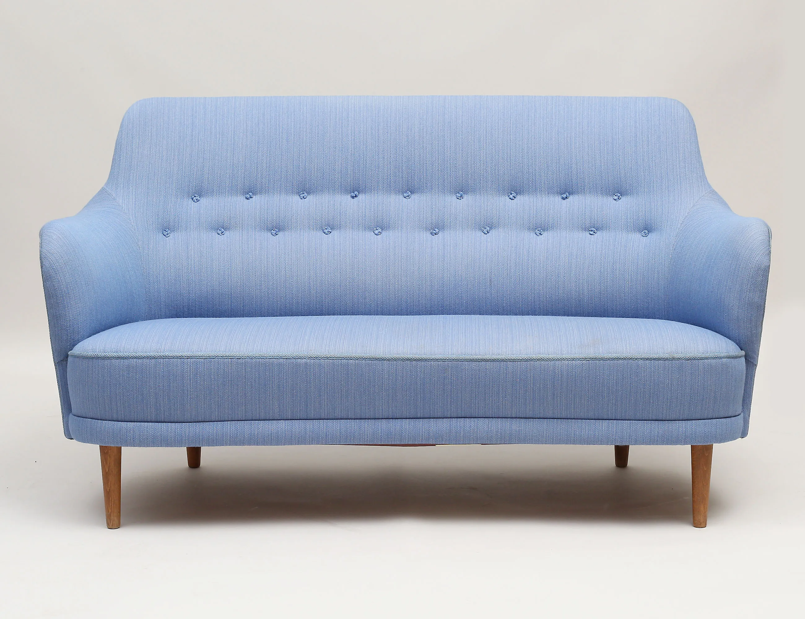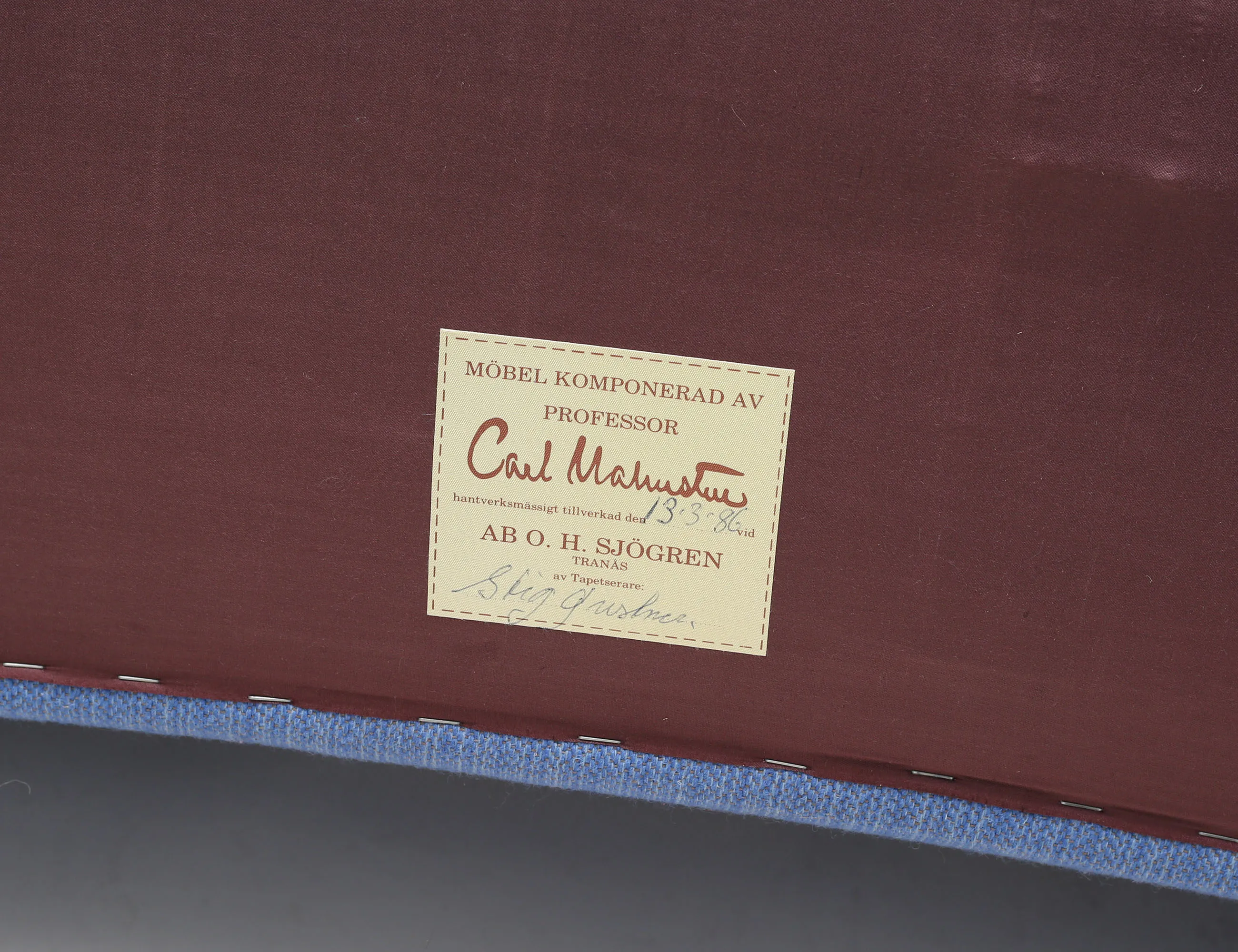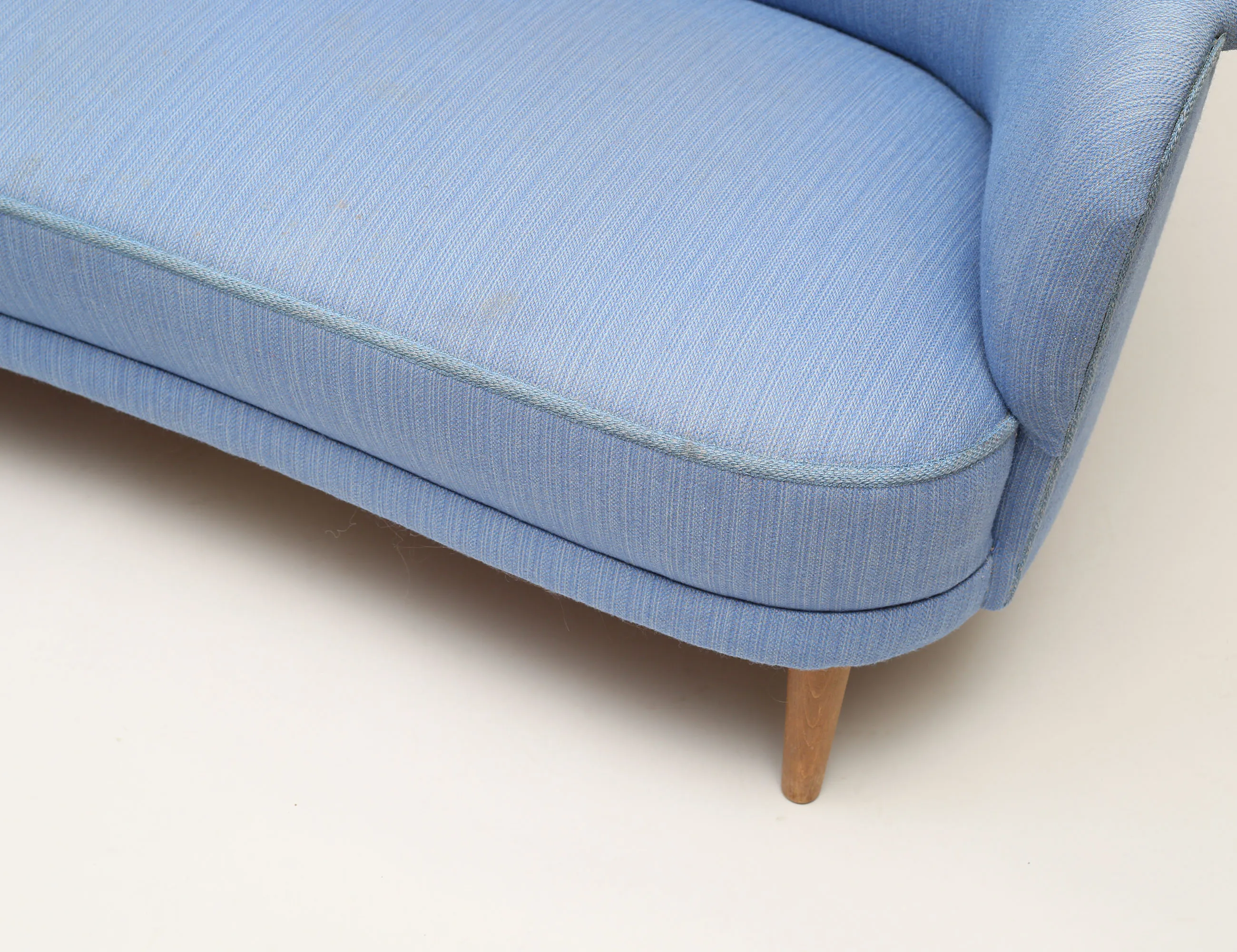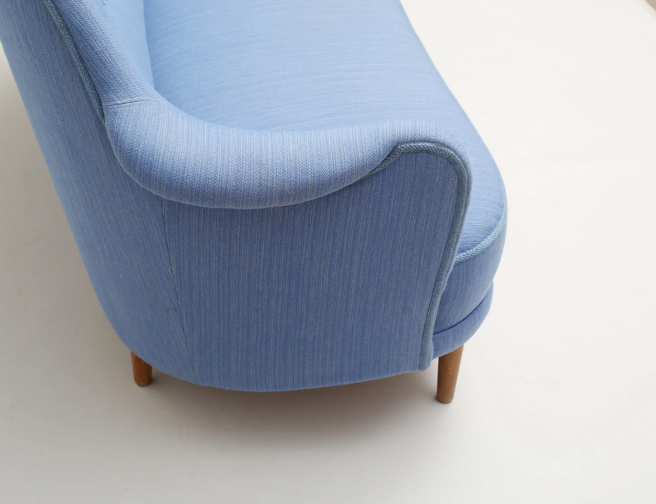 helstoppad med blått ulltyg, knapphäftad rygg, ben i bok, AB OH Sjögren etikettmärkt, höjd 85, bredd 160, djup 78 (smärre fläckar)