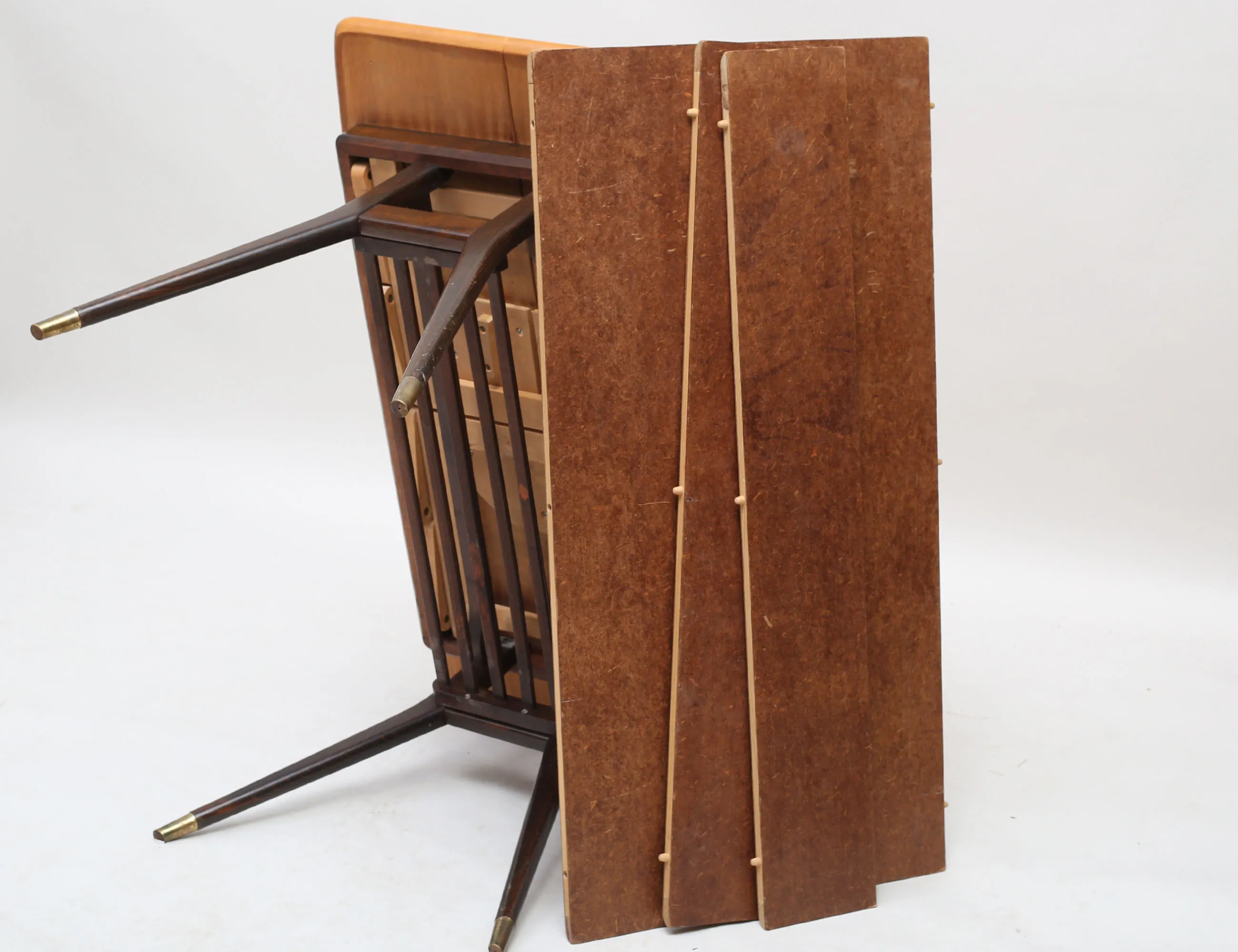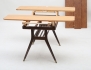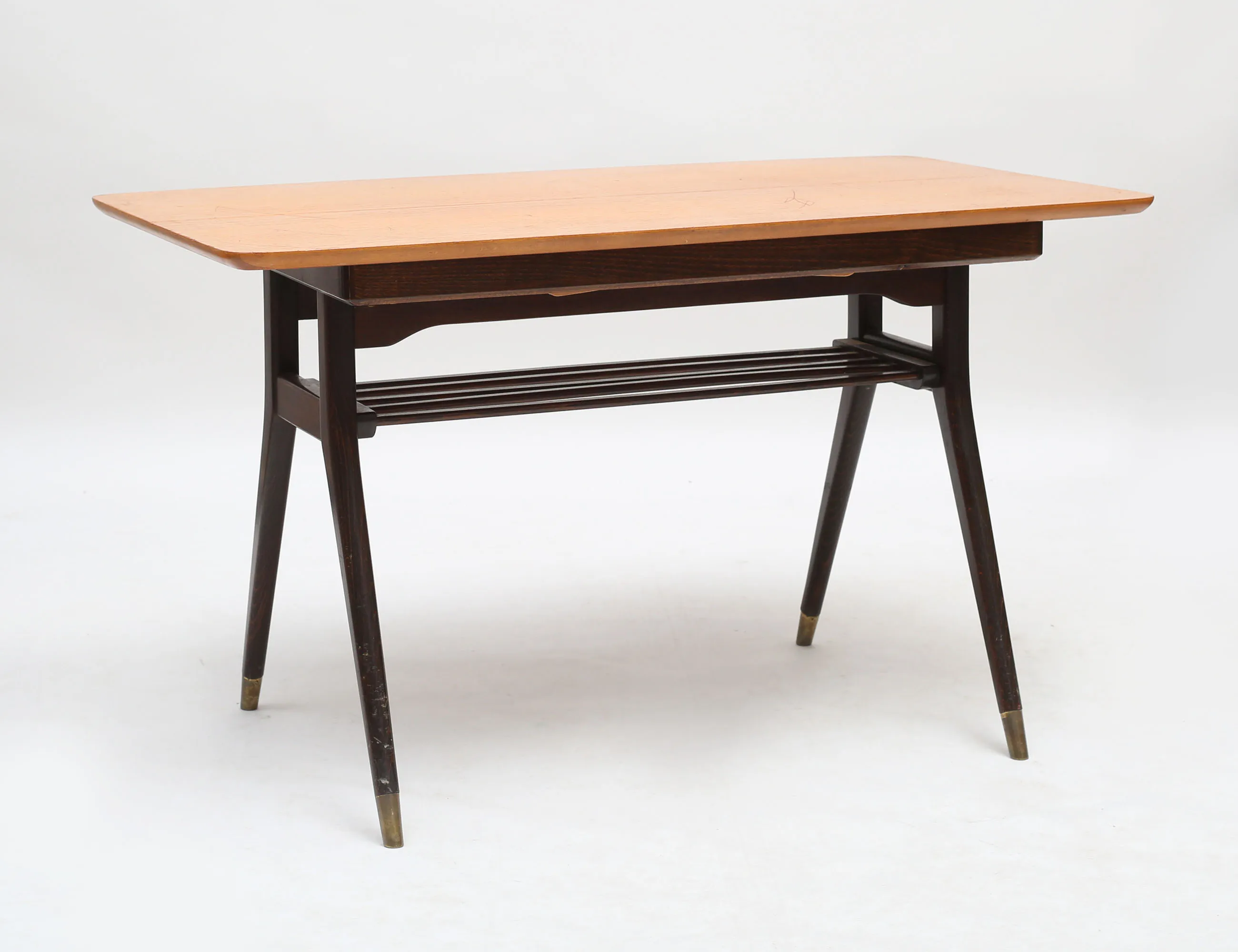 teak, fottrissor i mässing, kan höjas till matbord, tre iläggsskivor, höjd 60, längd 105, bredd 60 (+53, 16, 16)