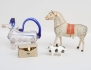 längd 13 (klövar med nagg), "Fyllehund" karaff i glas, längd 25 (dekoravslag), häst tovad textil, höjd 25, längd 26 (ett hjul saknas), teaterkikare mässing och pärlemor i fodral, "Beli", längd 10