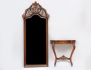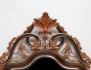 valnöt, träskuren dekor, uppsvängt genombrutet krön, profilerad skiva, höjd 192/79, bredd 82/79, djup 32