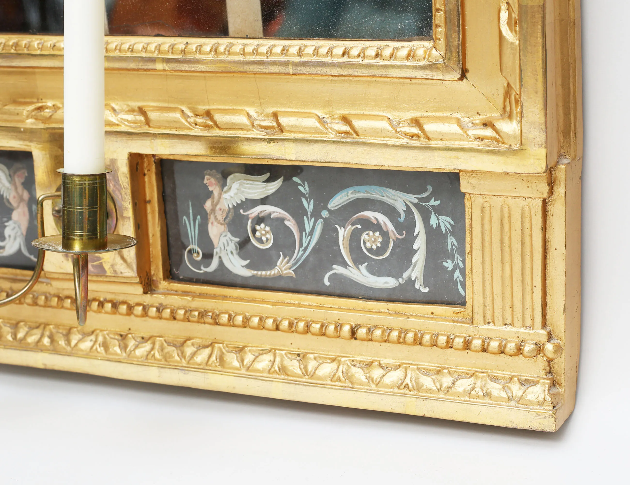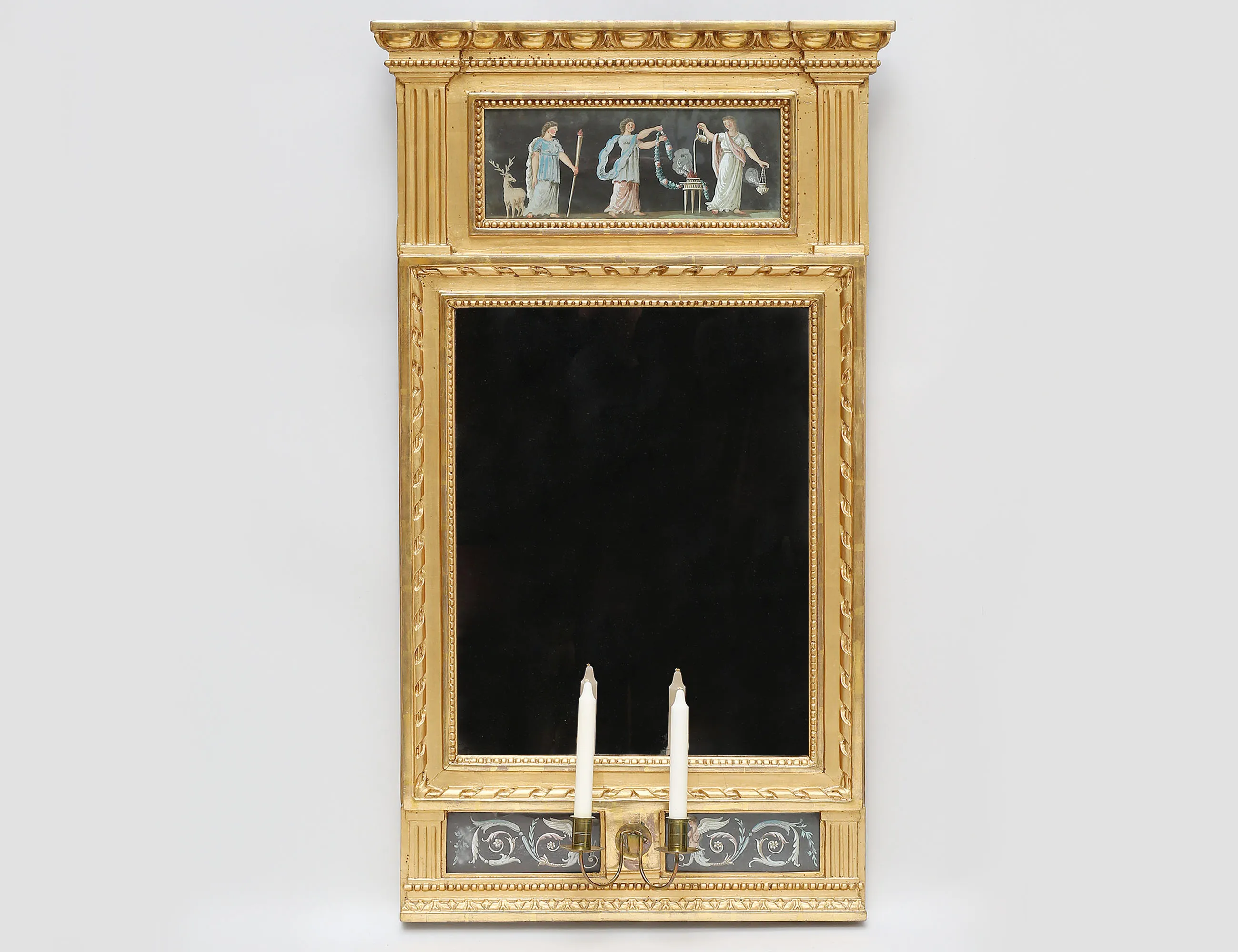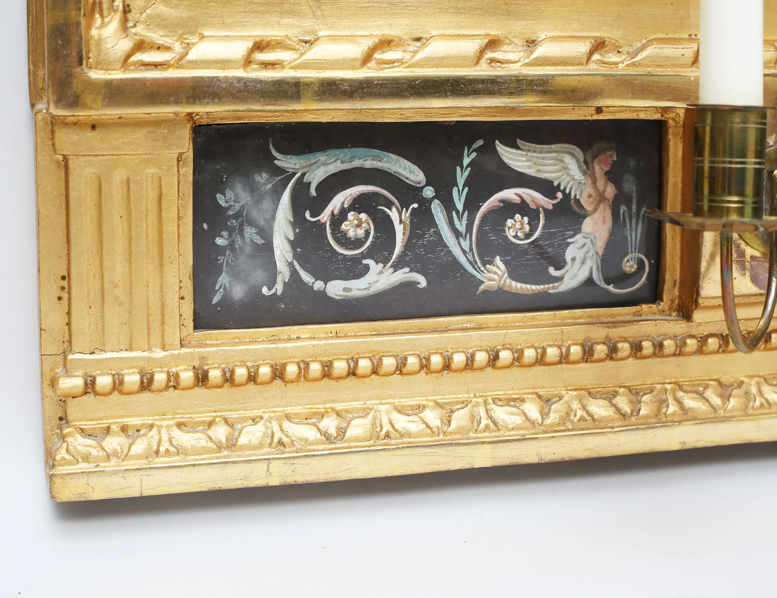 Lago Lundén Stockholms Hallstämpel 1790, träskuren dekor, förgylld med bladguld och slagmetall, övre och nedre fältet med gouachemålningar, samtida kvicksilverfolierat spegelglas, senare ljusarm i mässing för två ljus, 102x58