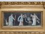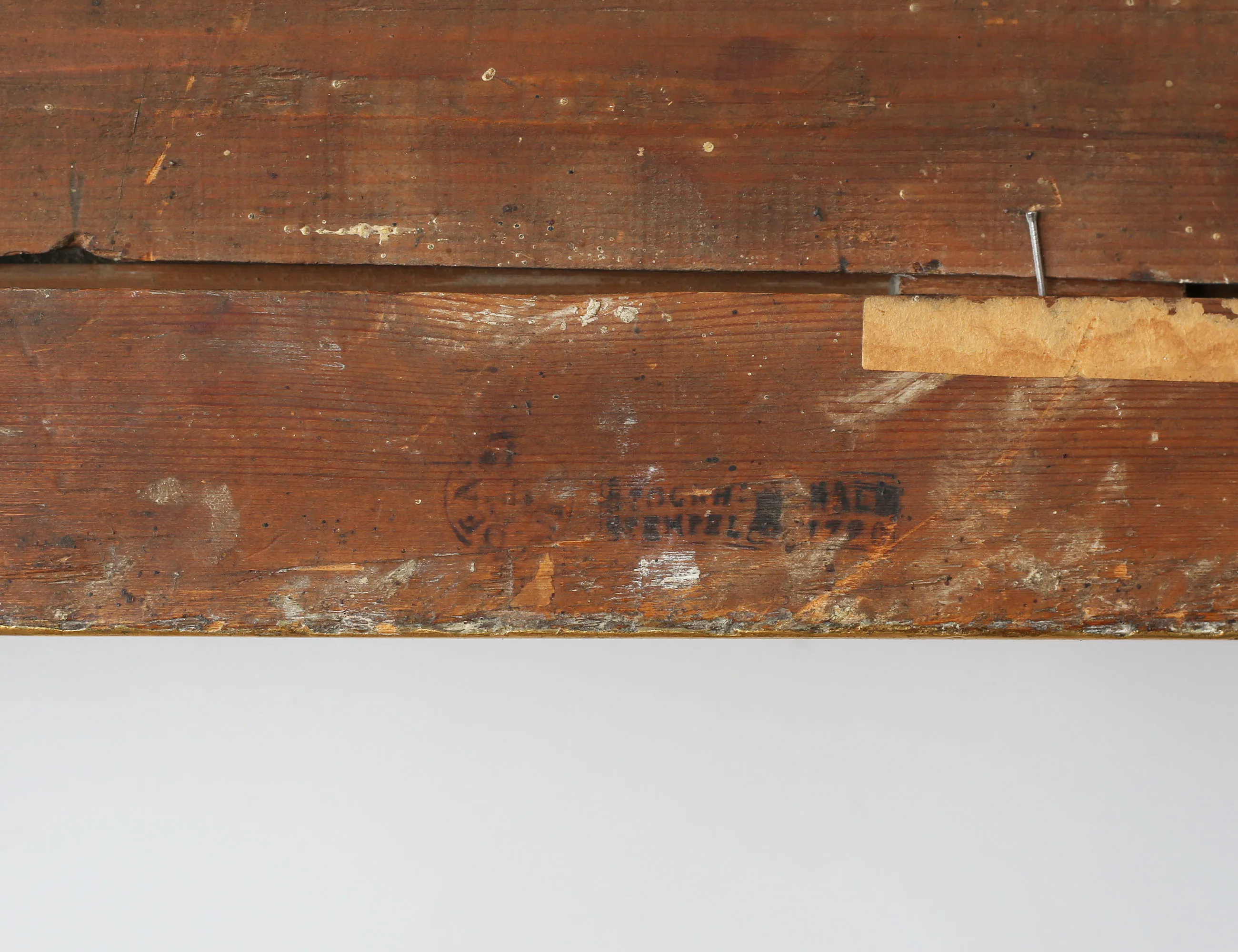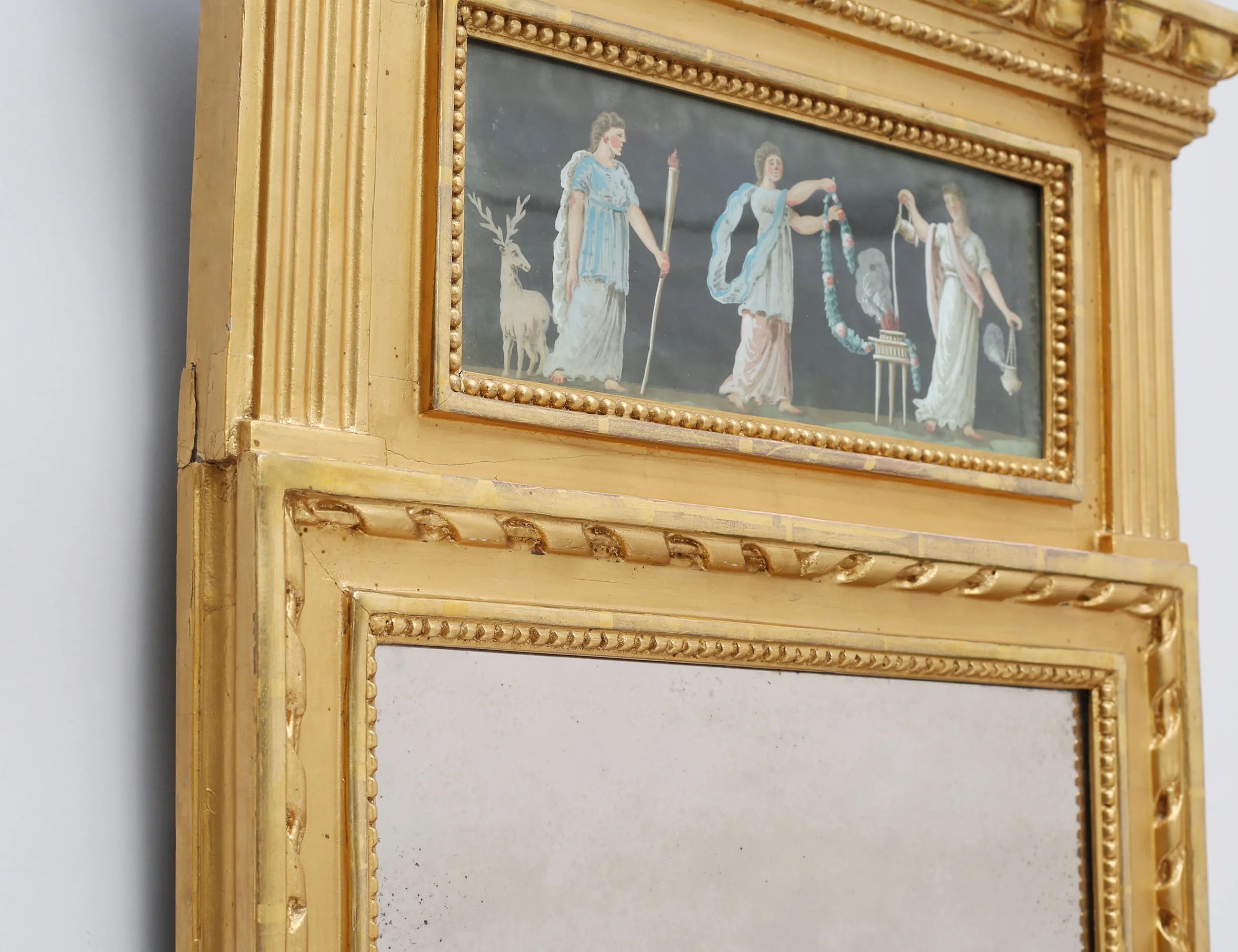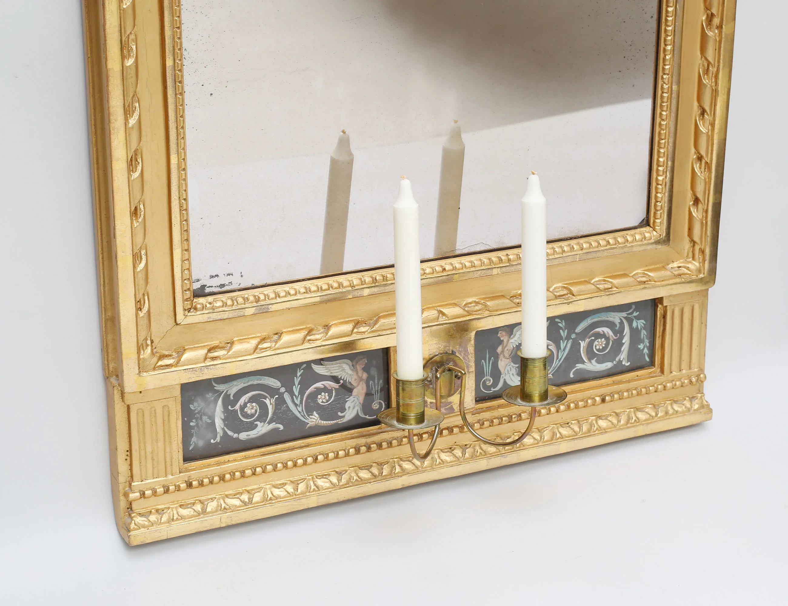 Lago Lundén Stockholms Hallstämpel 1790, träskuren dekor, förgylld med bladguld och slagmetall, övre och nedre fältet med gouachemålningar, samtida kvicksilverfolierat spegelglas, senare ljusarm i mässing för två ljus, 102x58