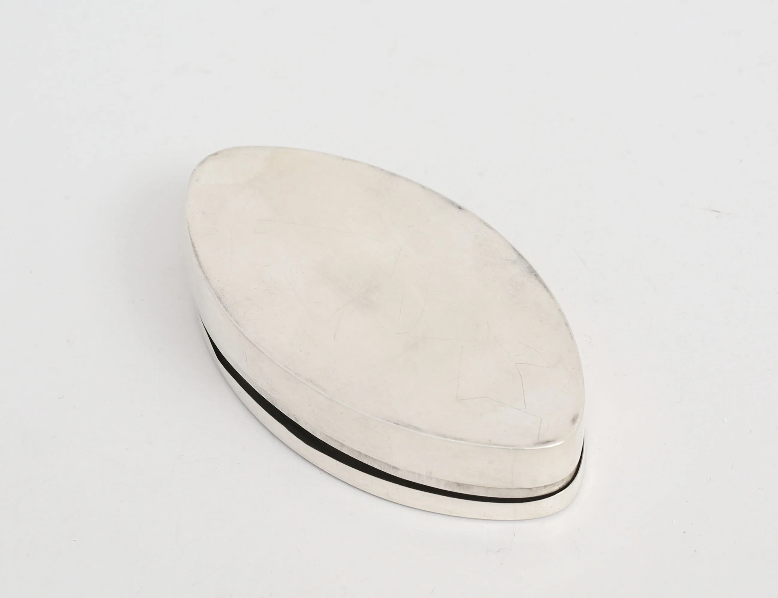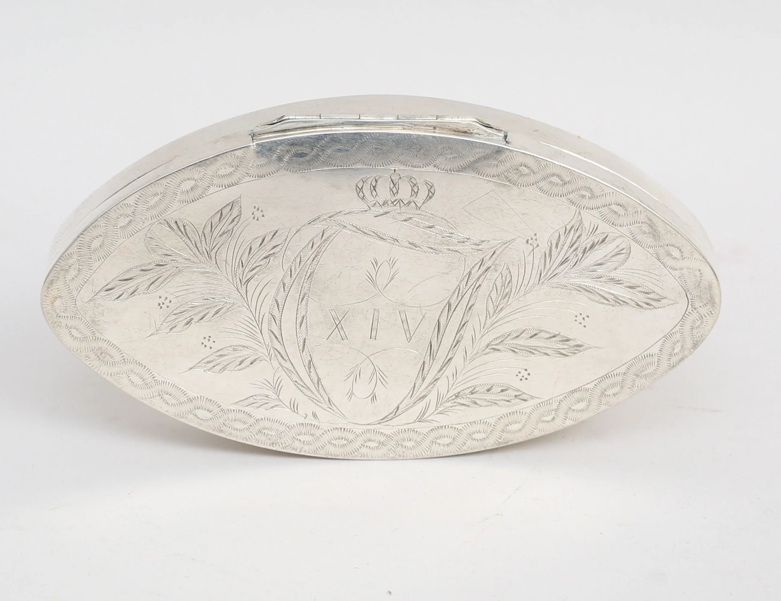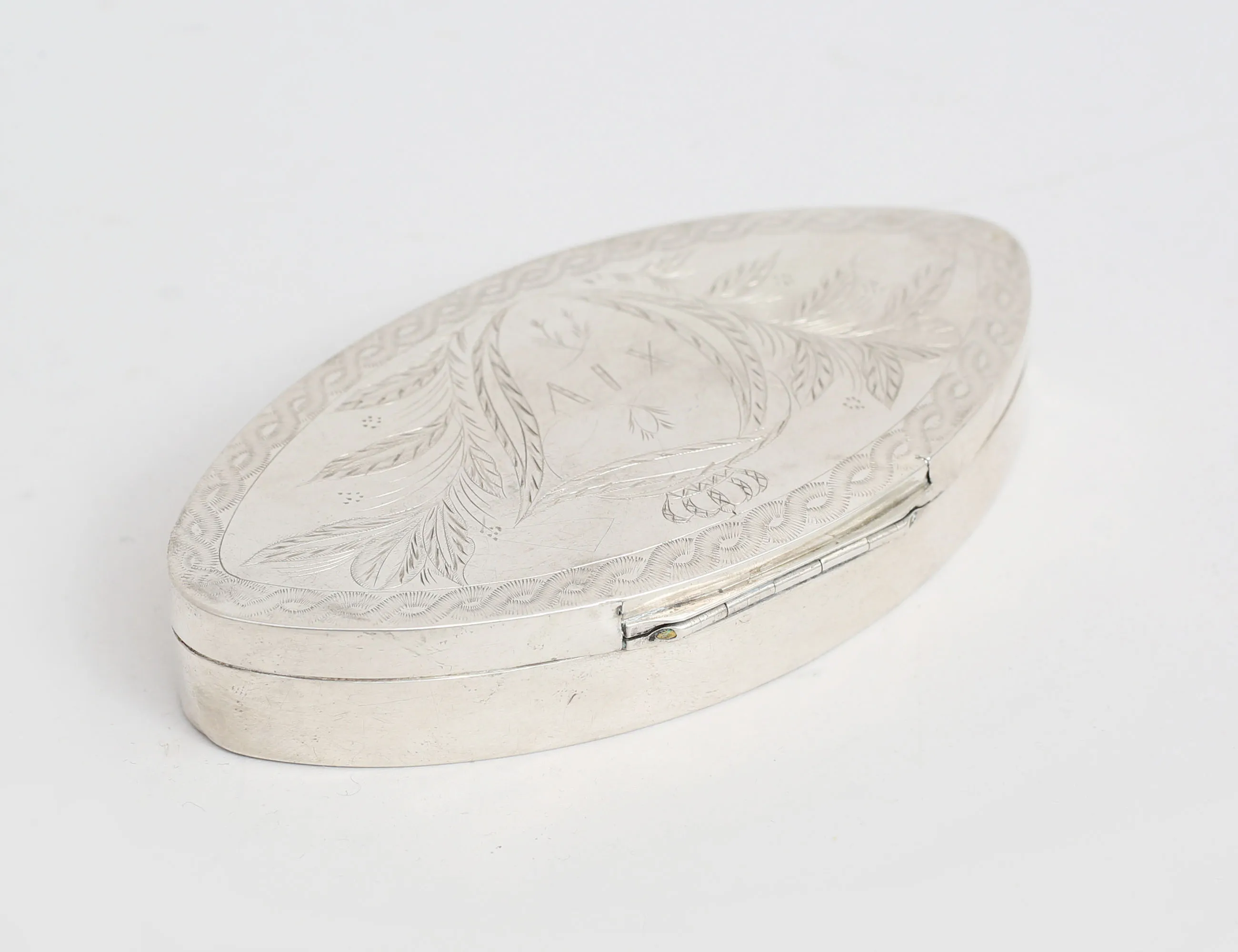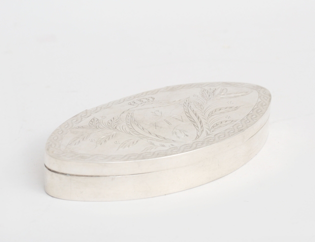 Nils Johan Åström Sundsvall 1842, ciselerad dekor, XIV under kunglig krona, samt bårder och bladslingor, vikt 57 gram, höjd 2, bredd 11x6 (locket med smärre bristningar vid gångjärnet)