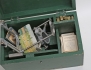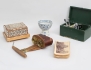 träschatull med kikarsikten och tillbehör Aluminabolaget, cigarettschatull med speldosa, intarsia med inslag av pärlemor, 17x14, skål på fot stemcup 1900-tal, mingtyp, Kina/Asien, höjd 11