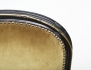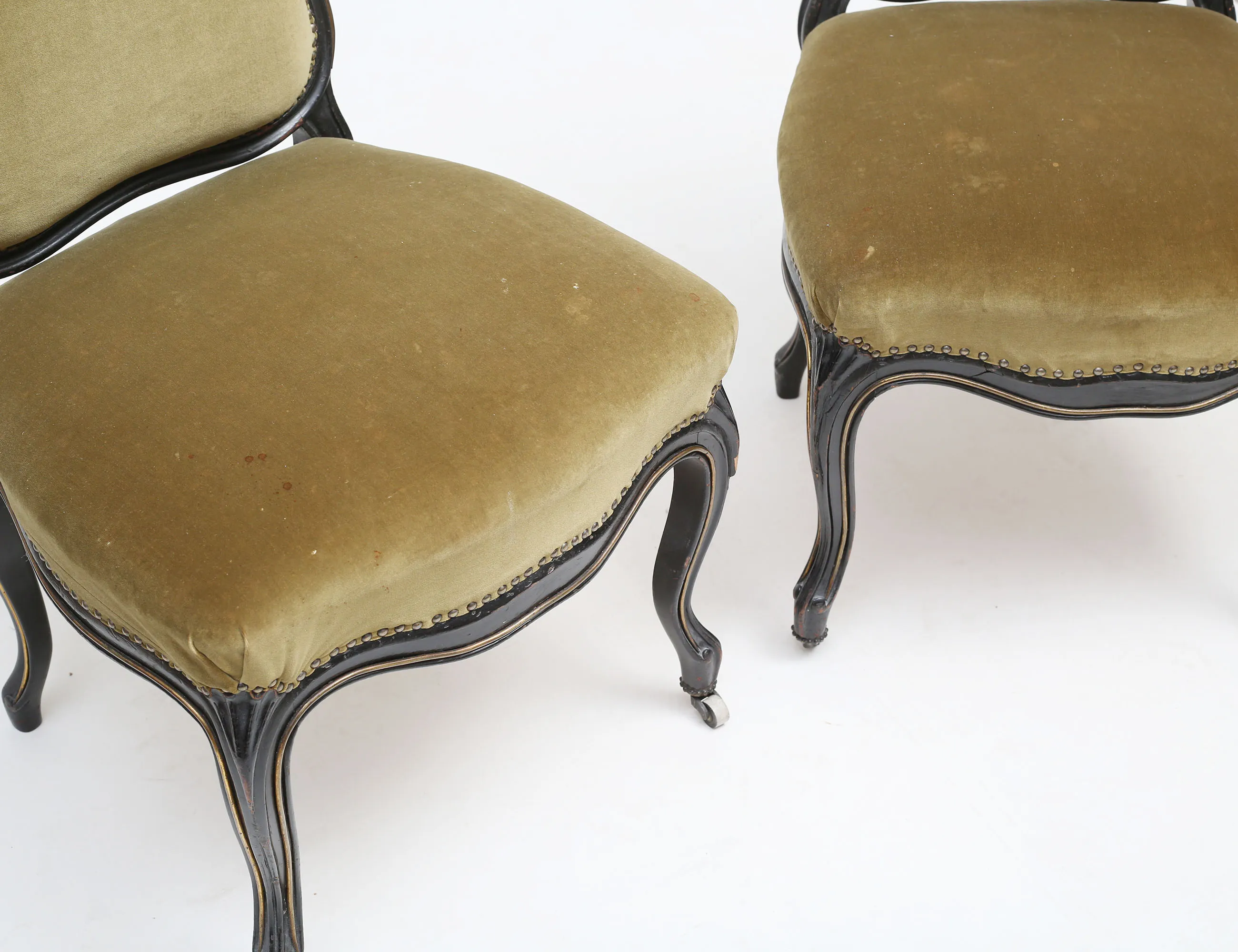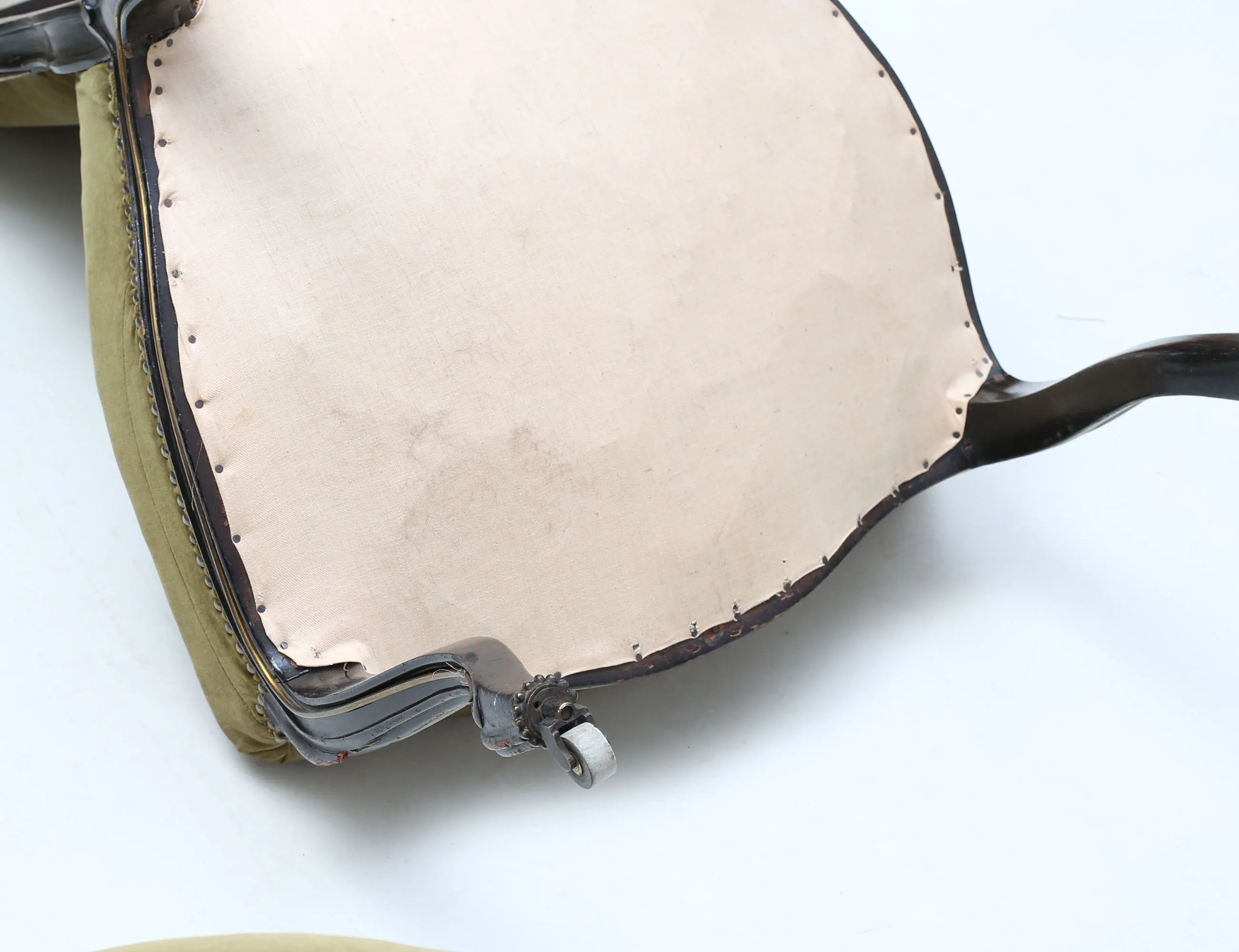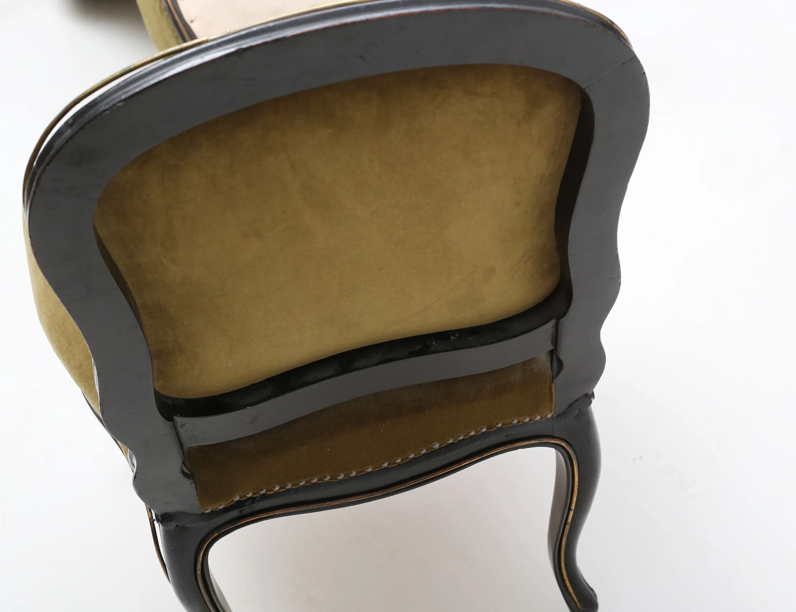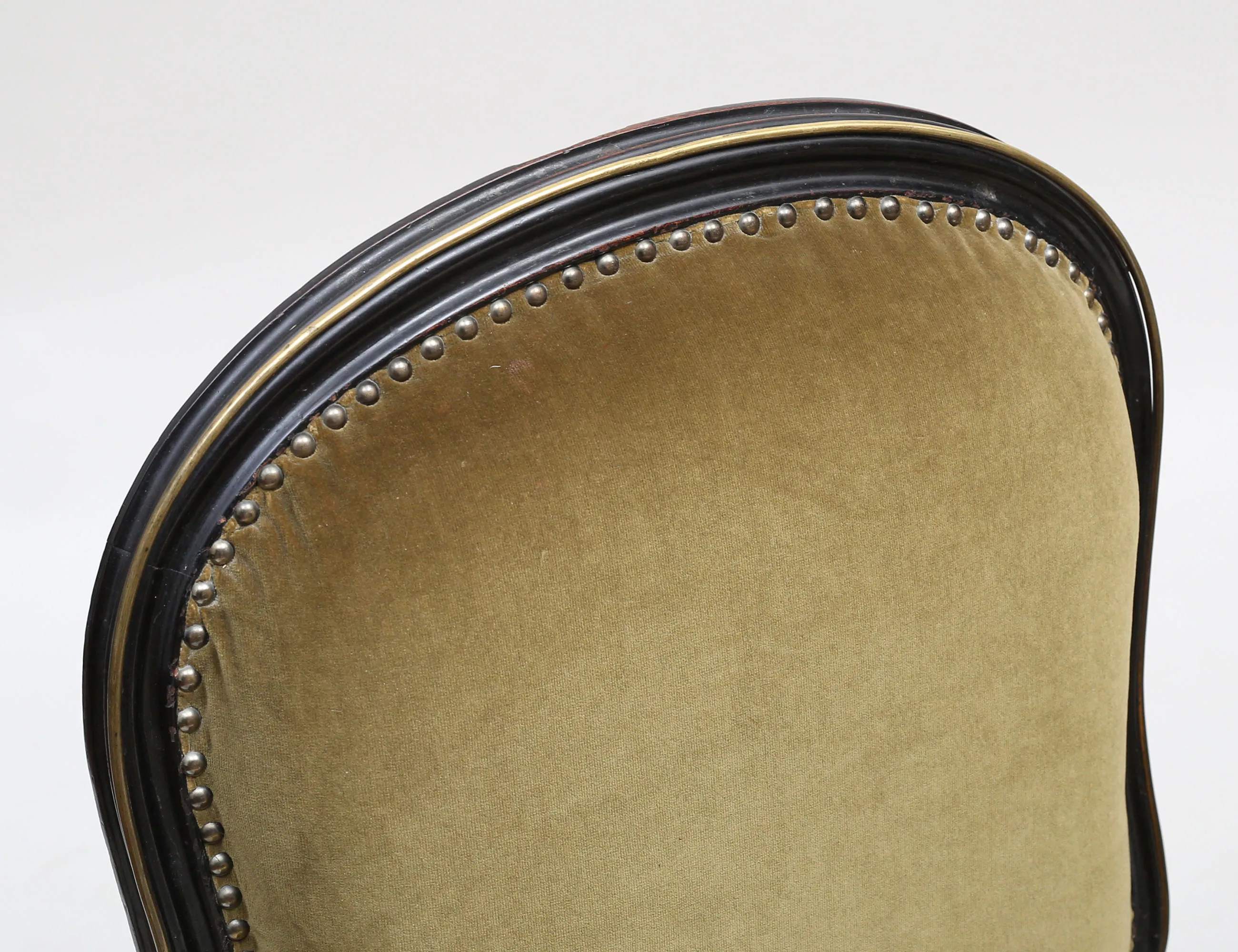 svärtat trä, dekor av lister i mässing, framben med hjultrissor, fast stoppad rygg och sits i grön sammet (bruksslitage/fläckar, en list något lös i rygg)