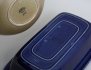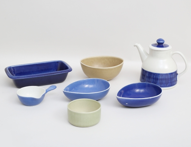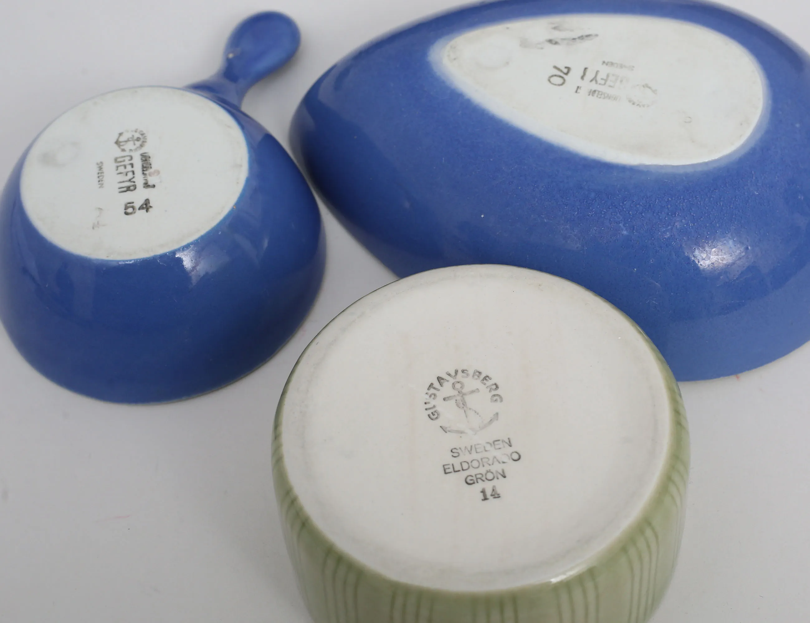 2 skålar samt såssnipa "Gefyr", Stig Lindberg Gustavsberg (skålar med tillverkningsdefekter), skål "Eldorado", Wilhelm Kåge Gustavsberg, tekanna "Koka Blå", Hertha Bengtsson, skål "Eldorado" Carl Harry Stålhane (7)