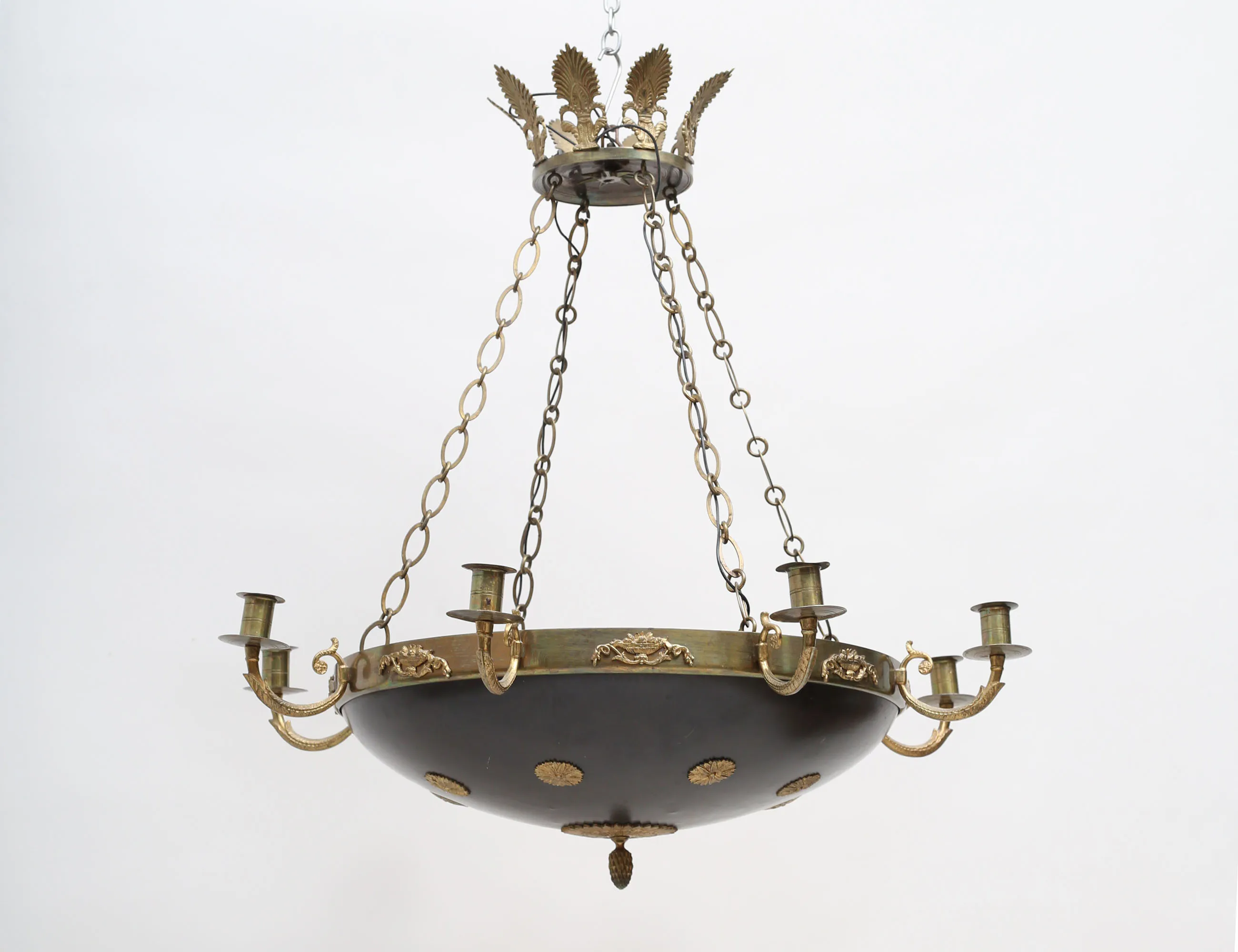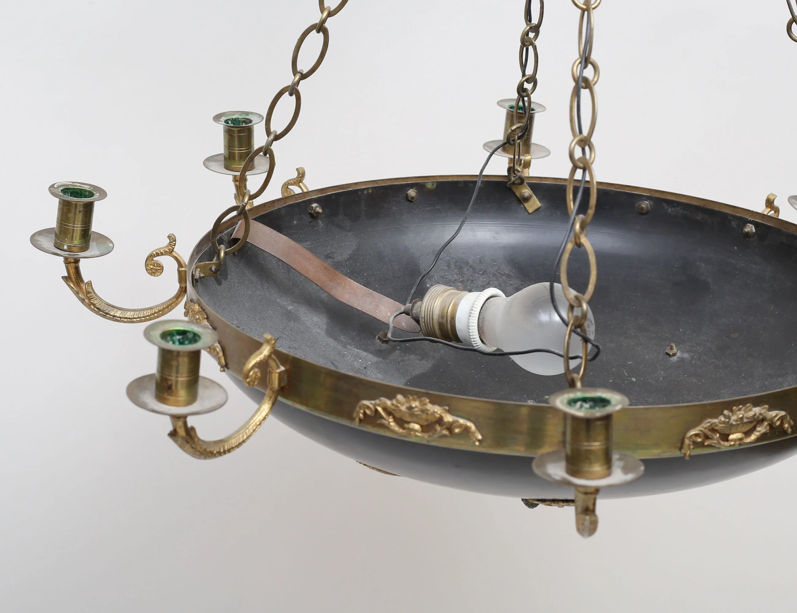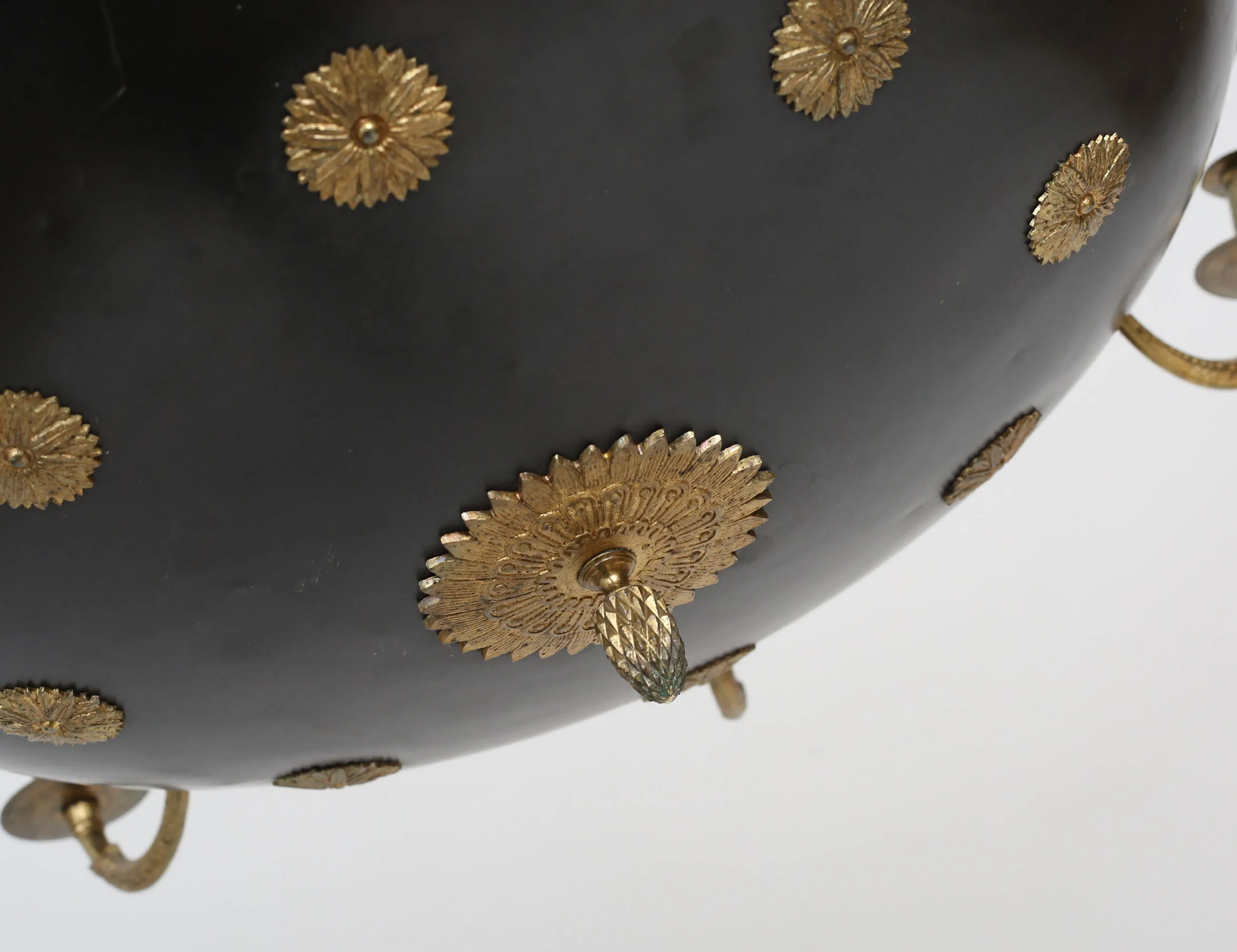 mässing, skål i svärtad metall, för åtta ljus, en ljuspunkt i skålen, höjd 70, diameter 65