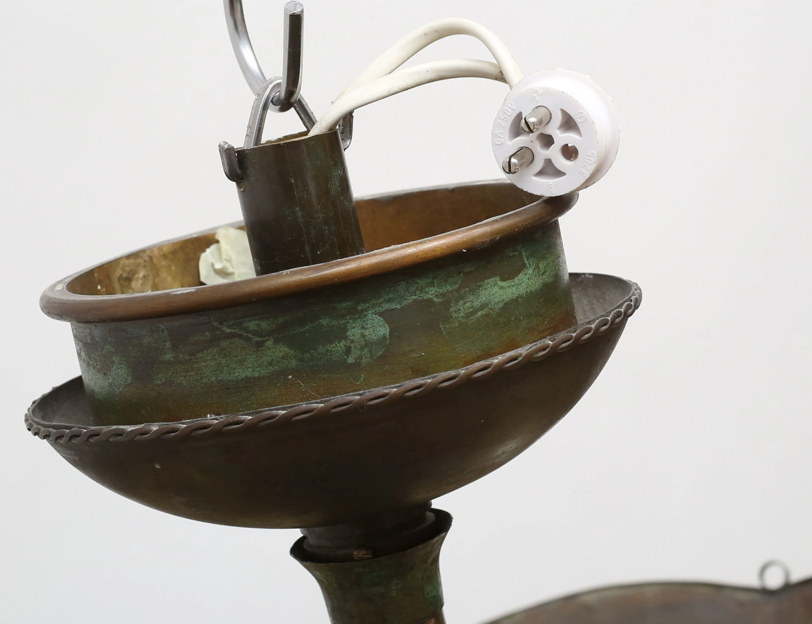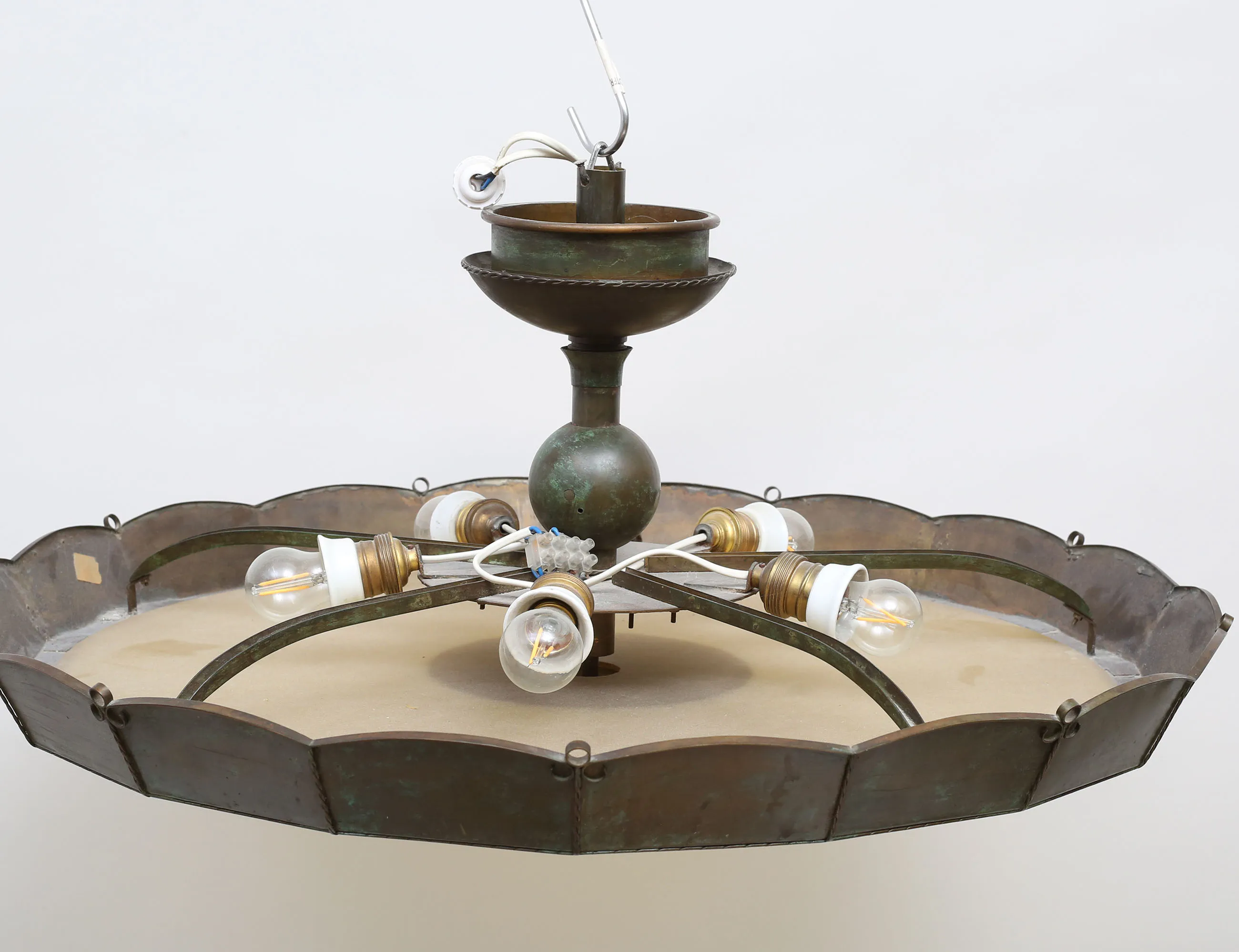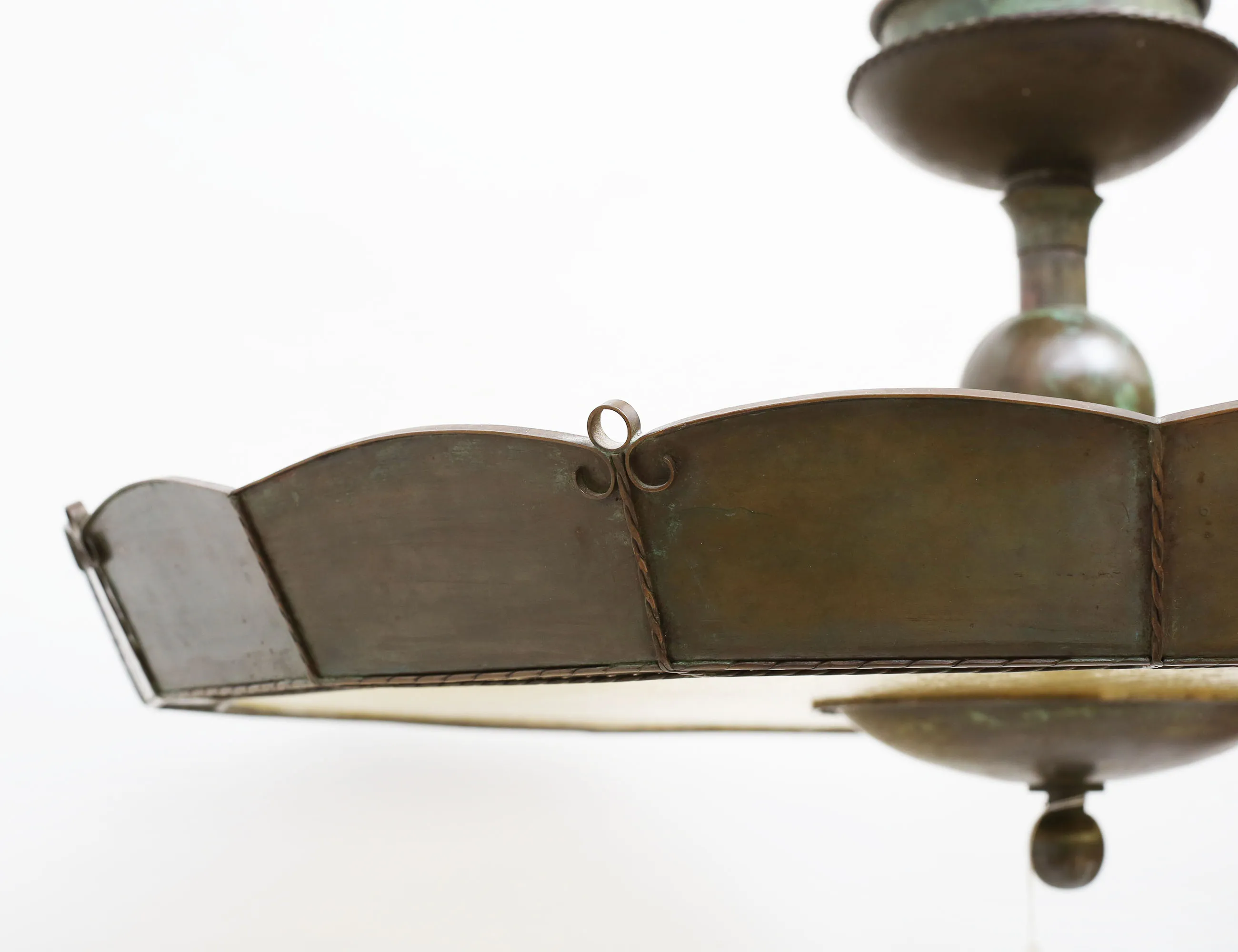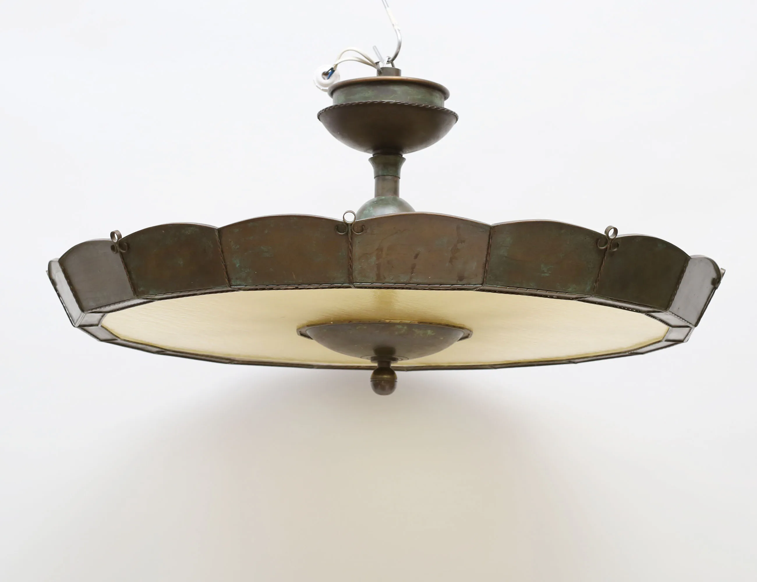 grönpatinerad koppar, gultonad glasskiva, höjd 35, diameter 75