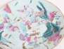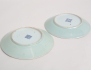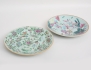 polykrom dekor, motiv av krigsscener respektive fjärilar, blommor och fågel, båda mot celadonfärgad fond, diameter 22 (en med fotringsnagg samt nedslipat brätte)