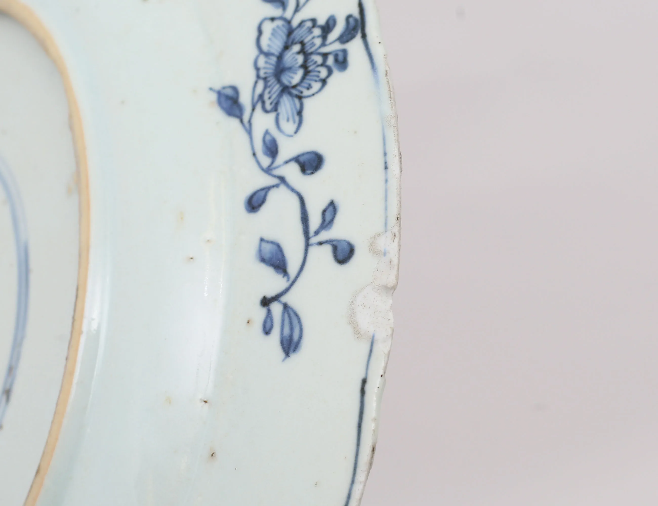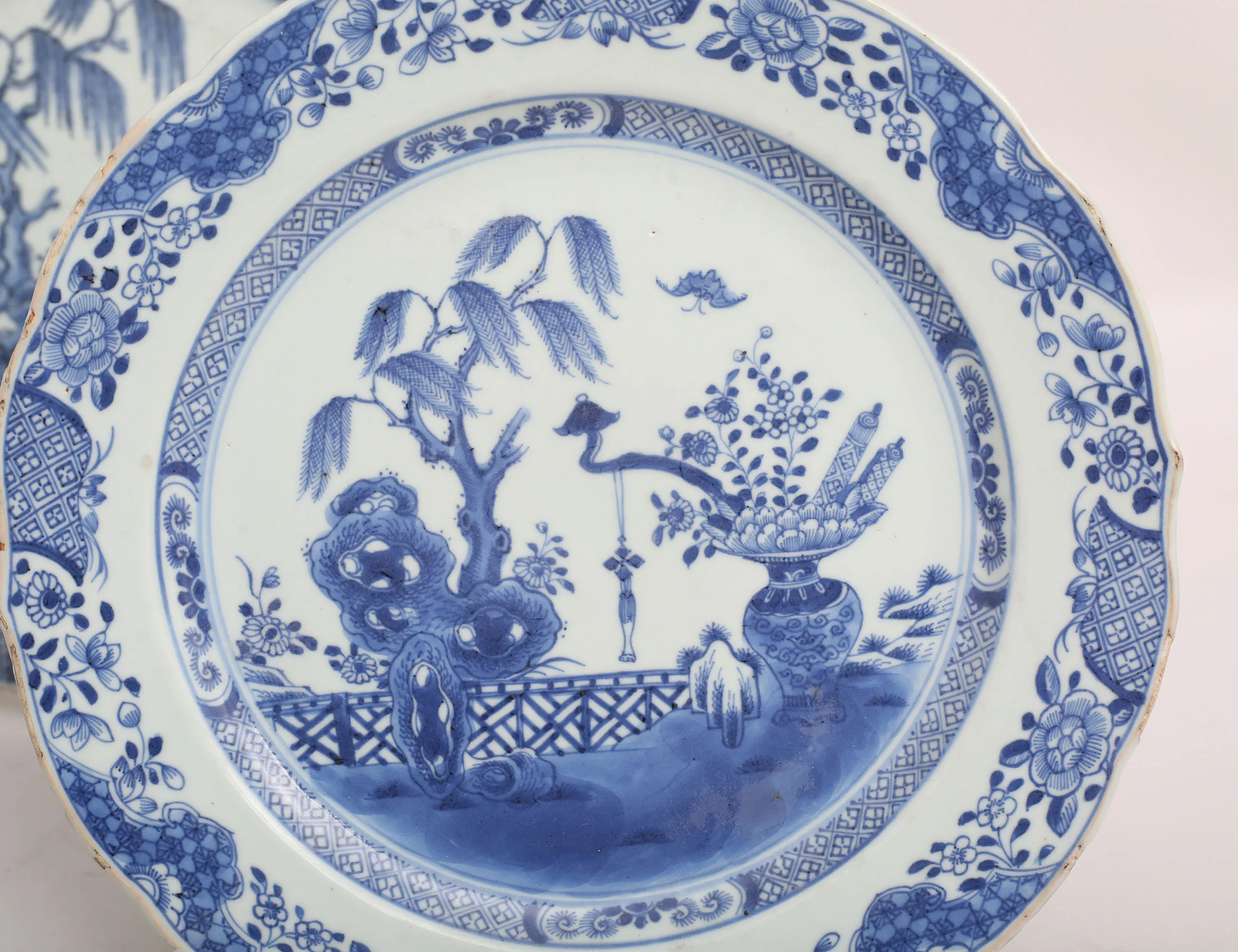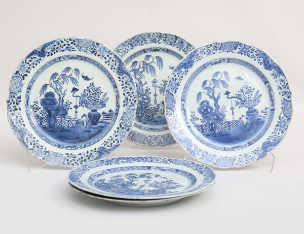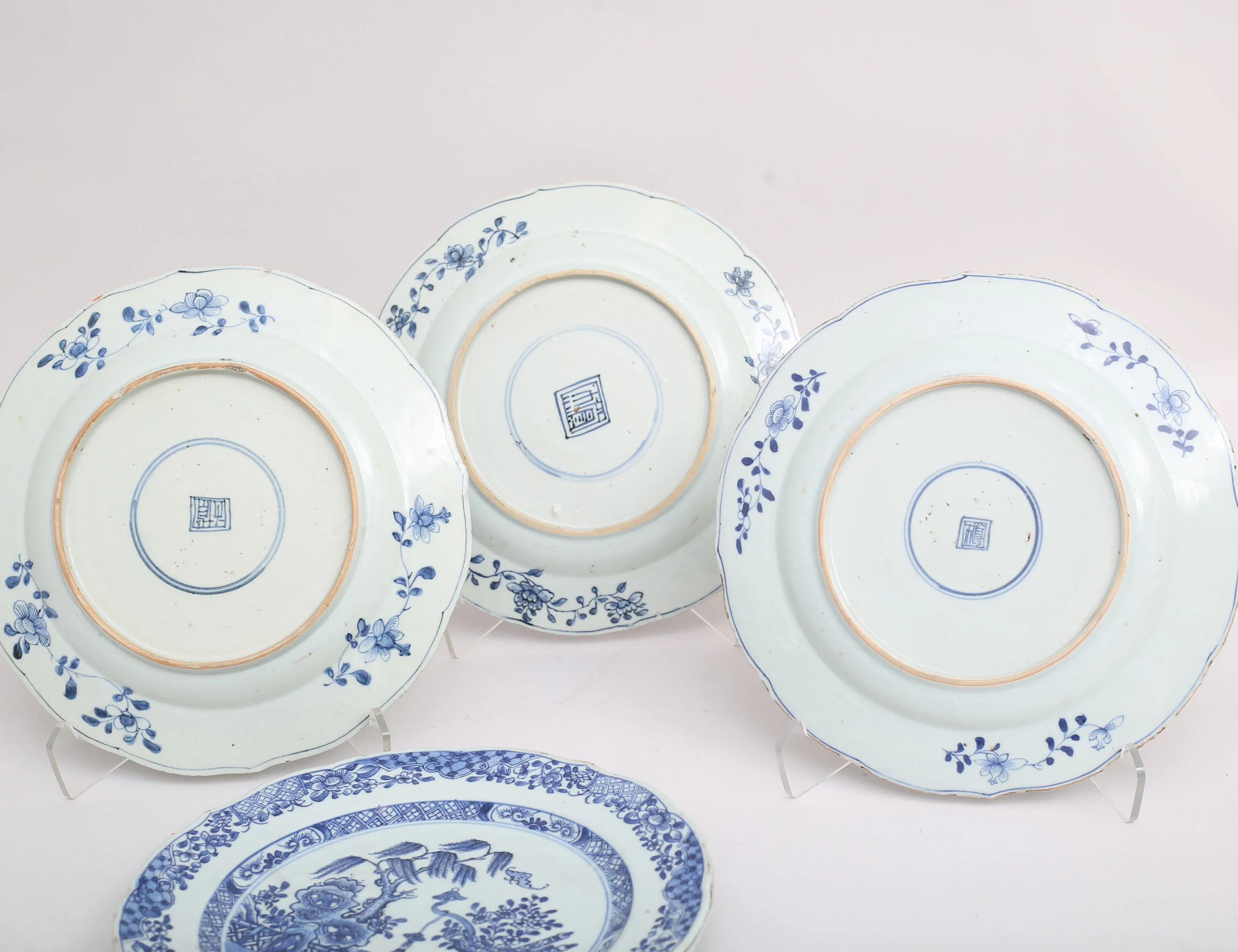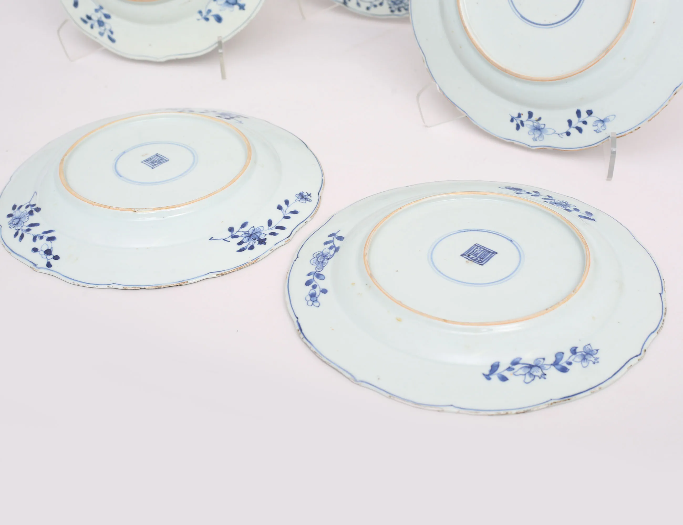 Qianlong 1736-1795, blåvit underglasyrdekor, konturerad kant, diameter 25 (2 med nagg, samtliga med smärre kantglasyrslitage)