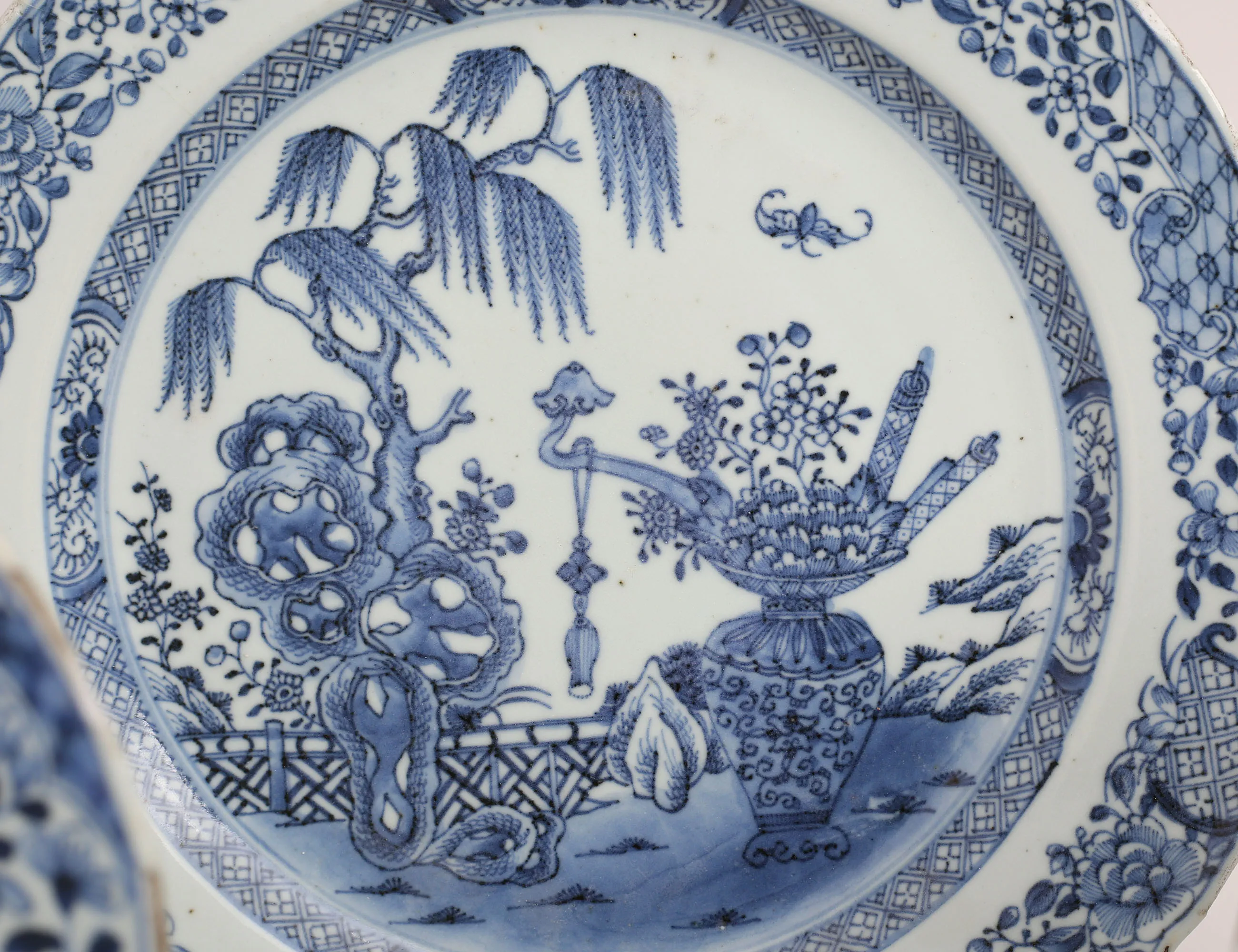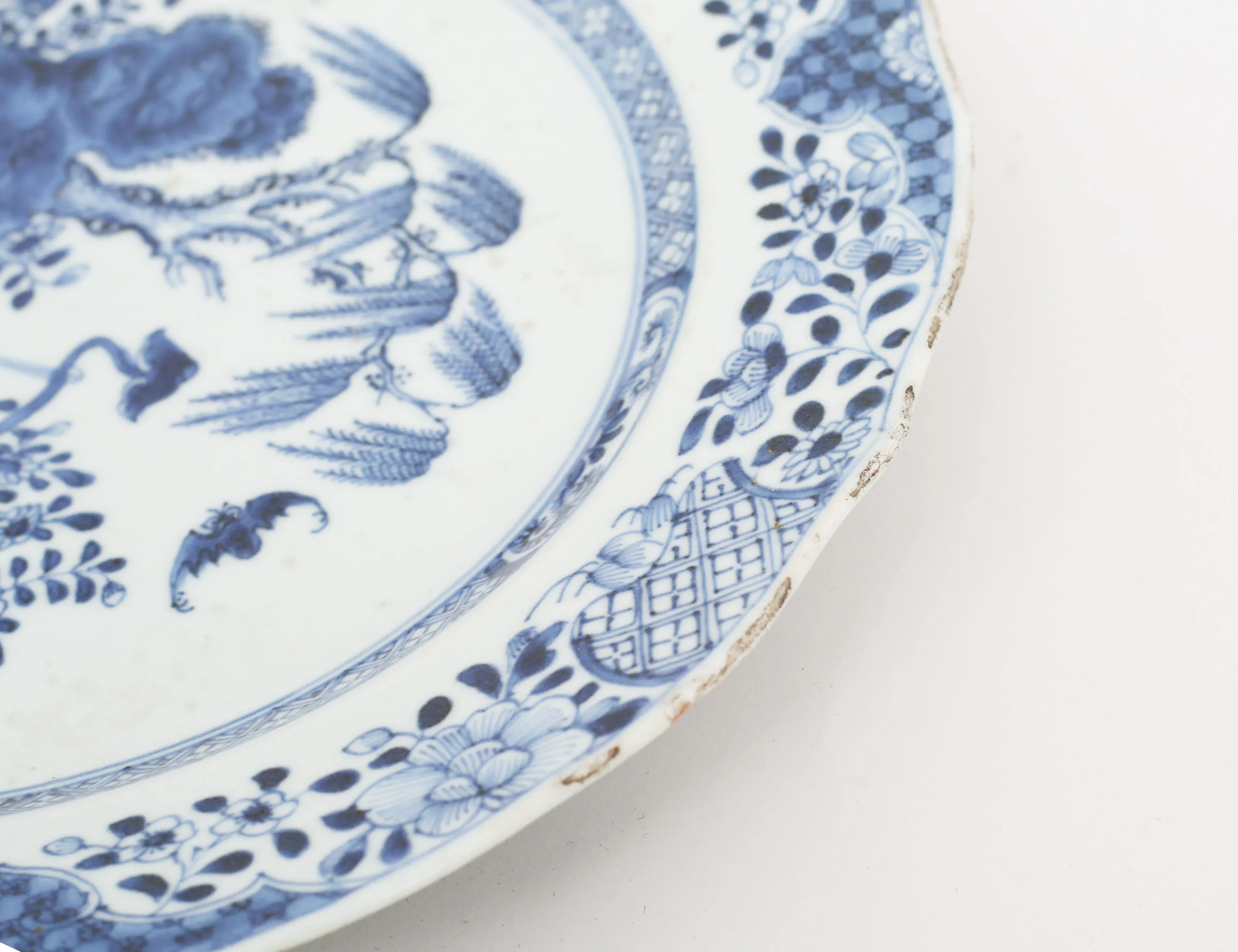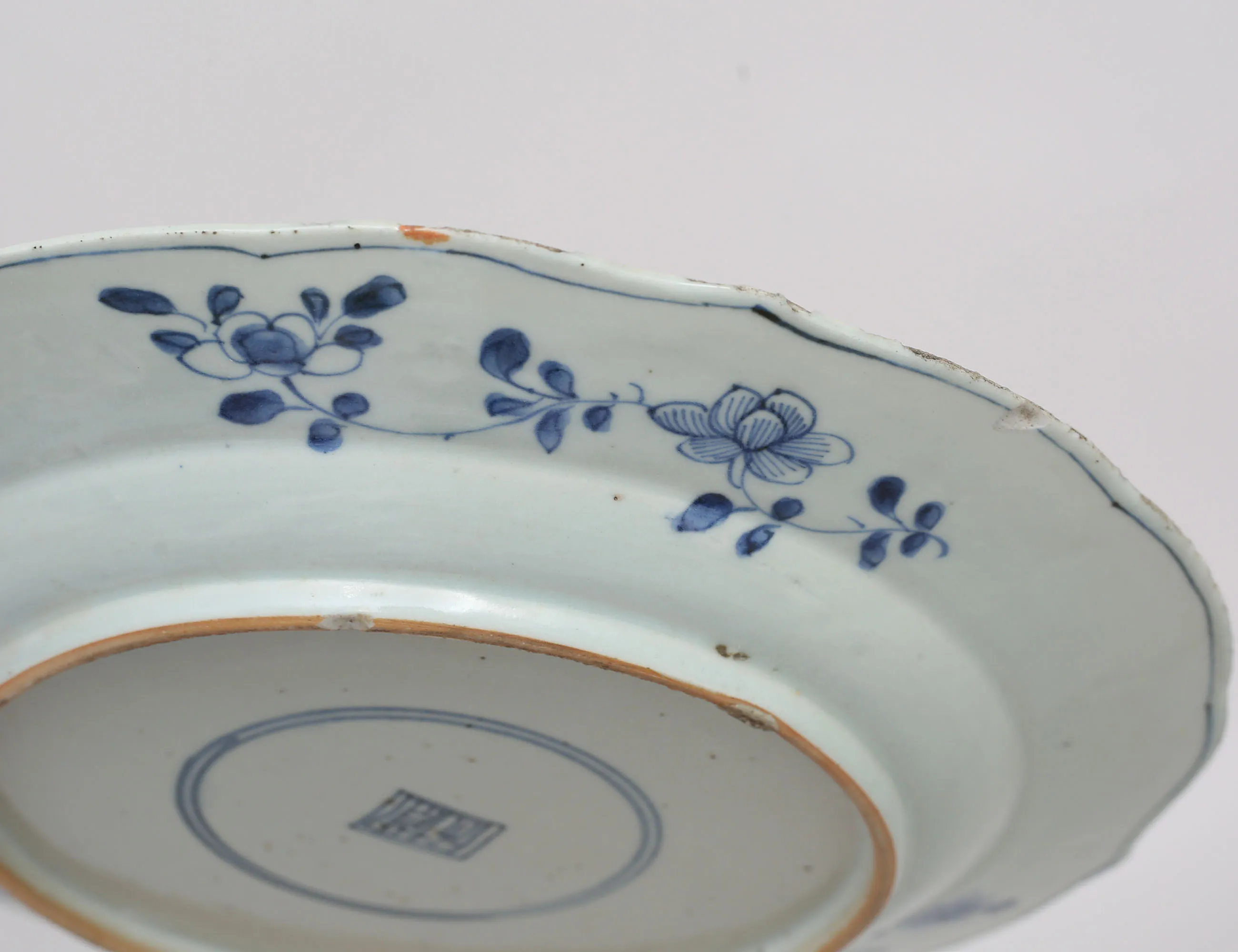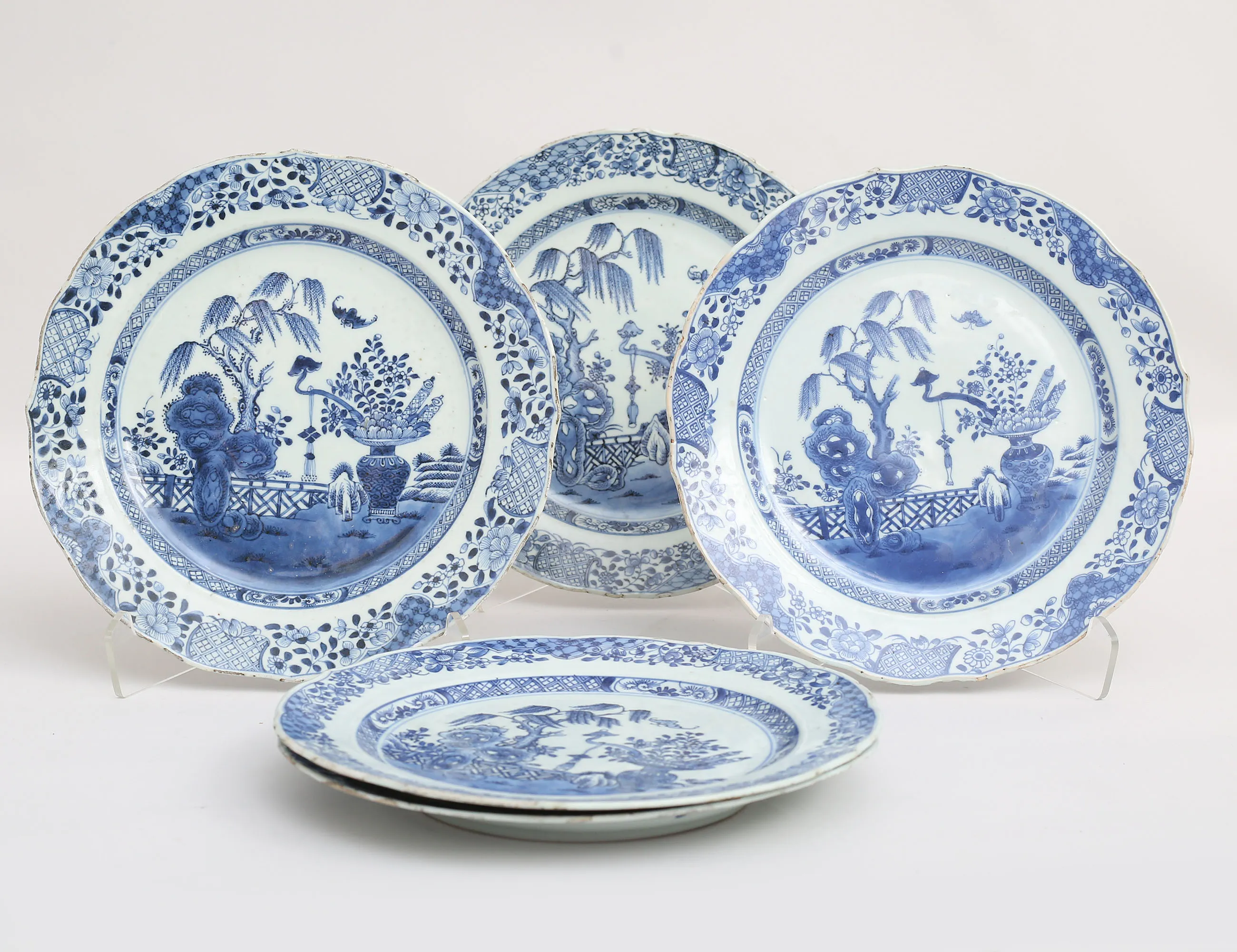 Qianlong 1736-1795, blåvit underglasyrdekor, konturerad kant, diameter 25 (2 med nagg, samtliga med smärre kantglasyrslitage)