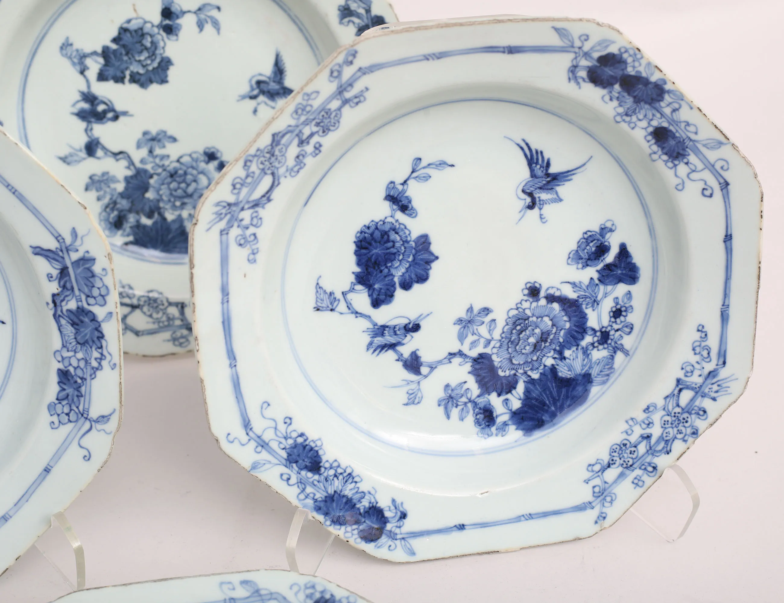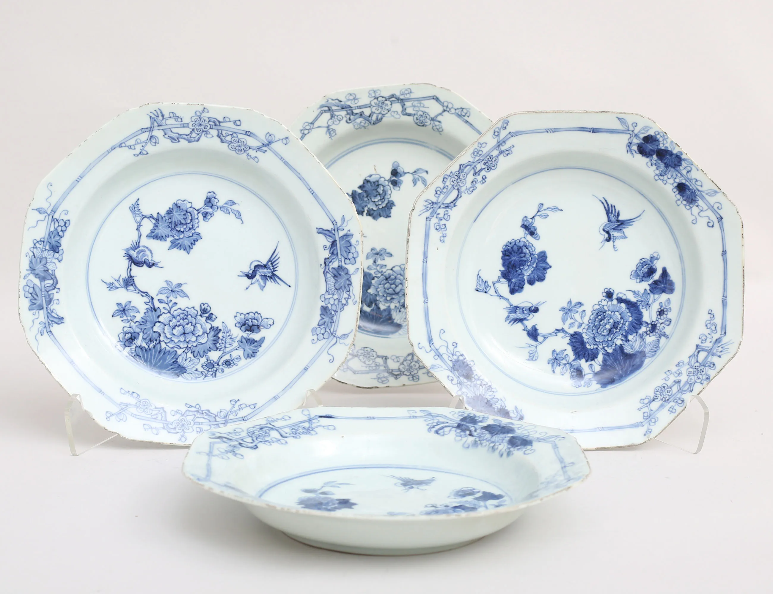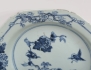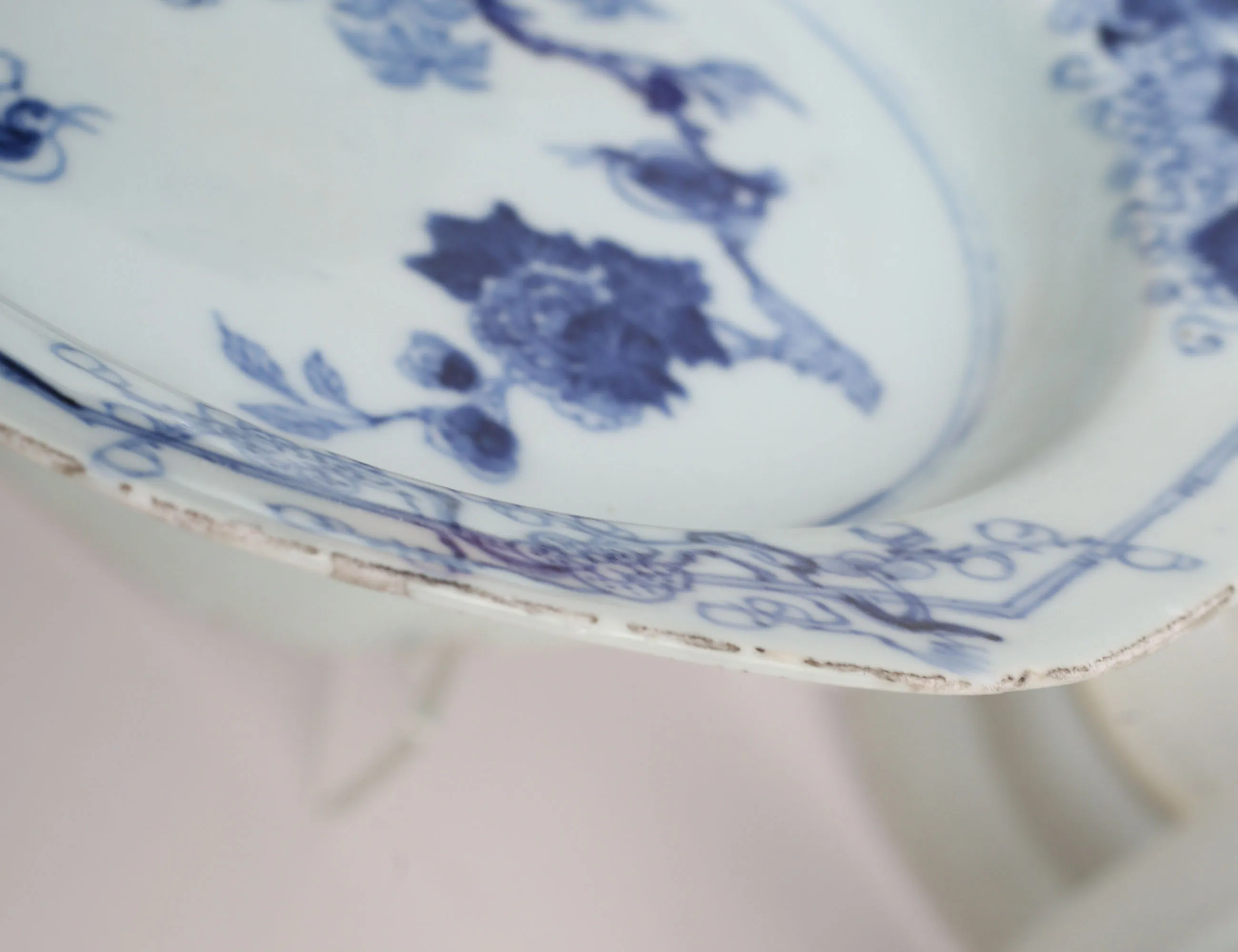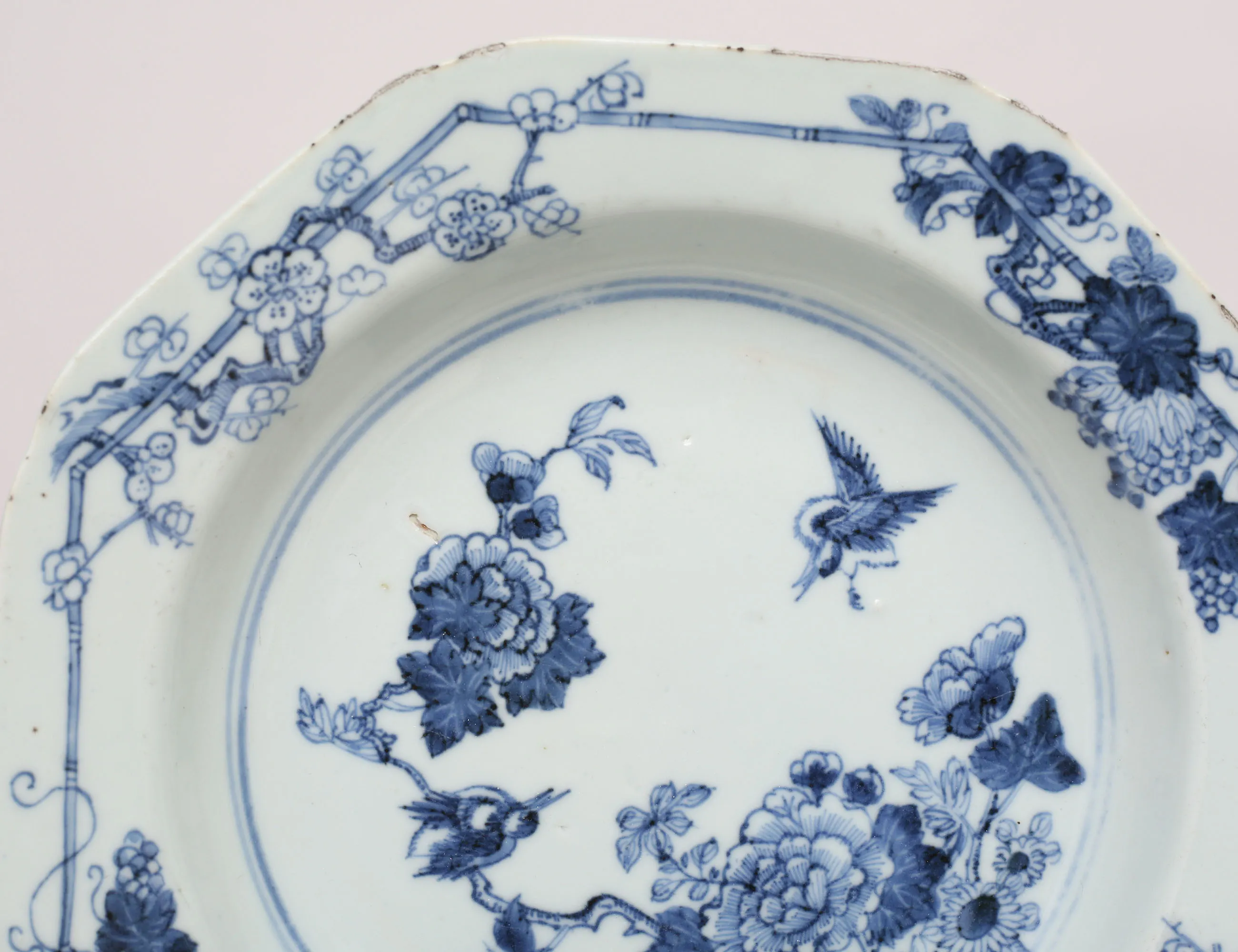 Qianlong 1736-1795, blåvit underglasyrdekor, motiv av fåglar och blommor, diameter 22,5 (kantglasyrslitage)