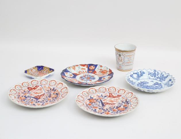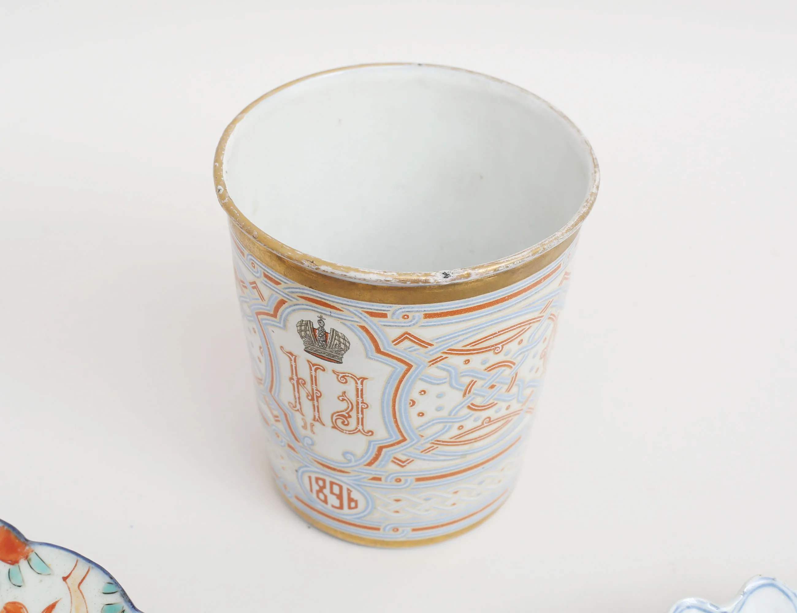 1 par samt 1+1, diameter 19,5-22 (ett med sprickor och retuscher) , kröningsmugg emalj på koppar, Tsar Nikolaj II 1896, höjd 10,5 (kantslitage) fat porslin Ryssland, 10,5x10,5 (6)