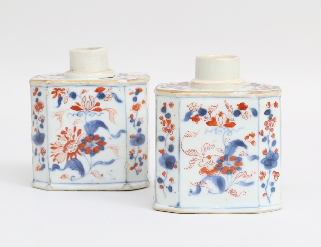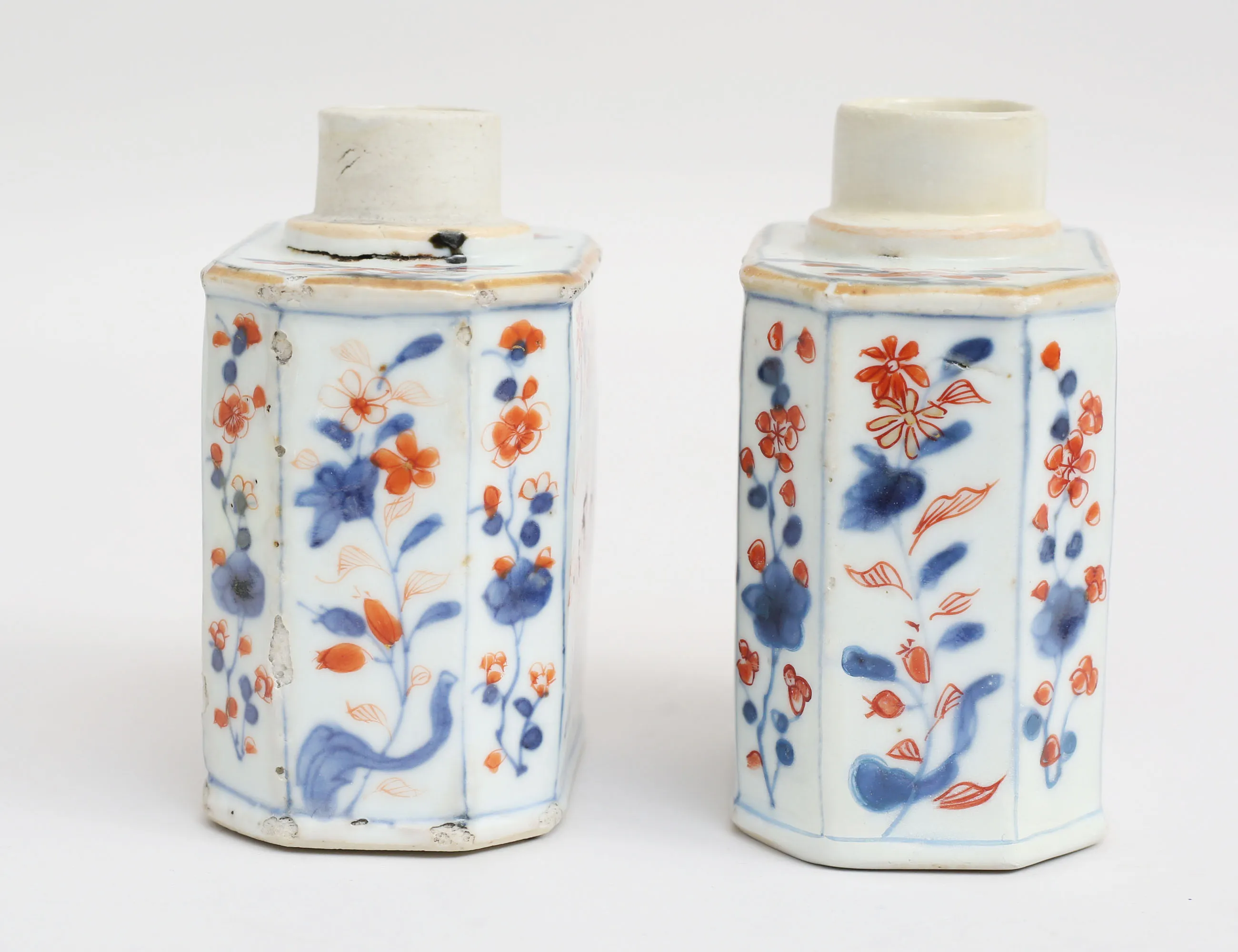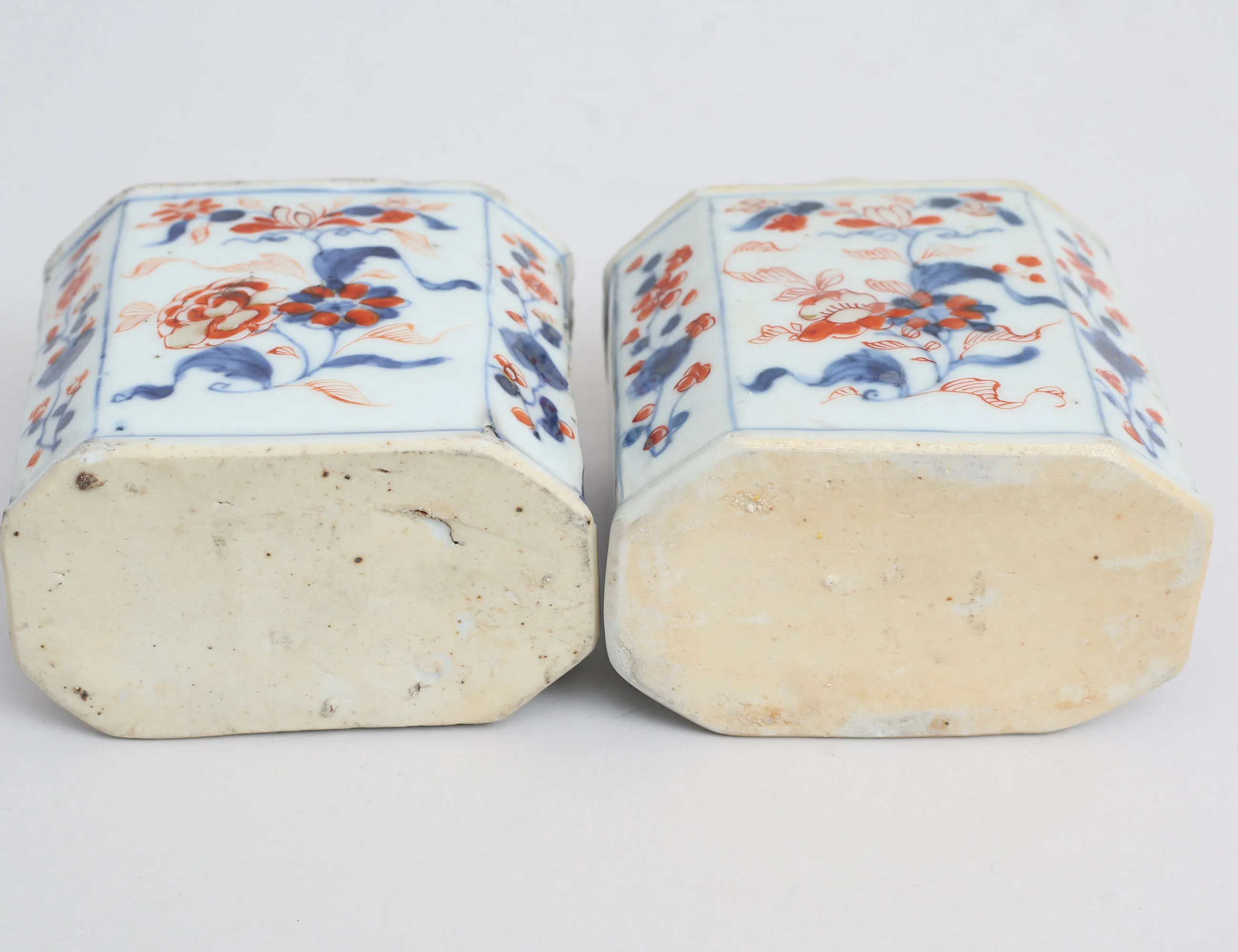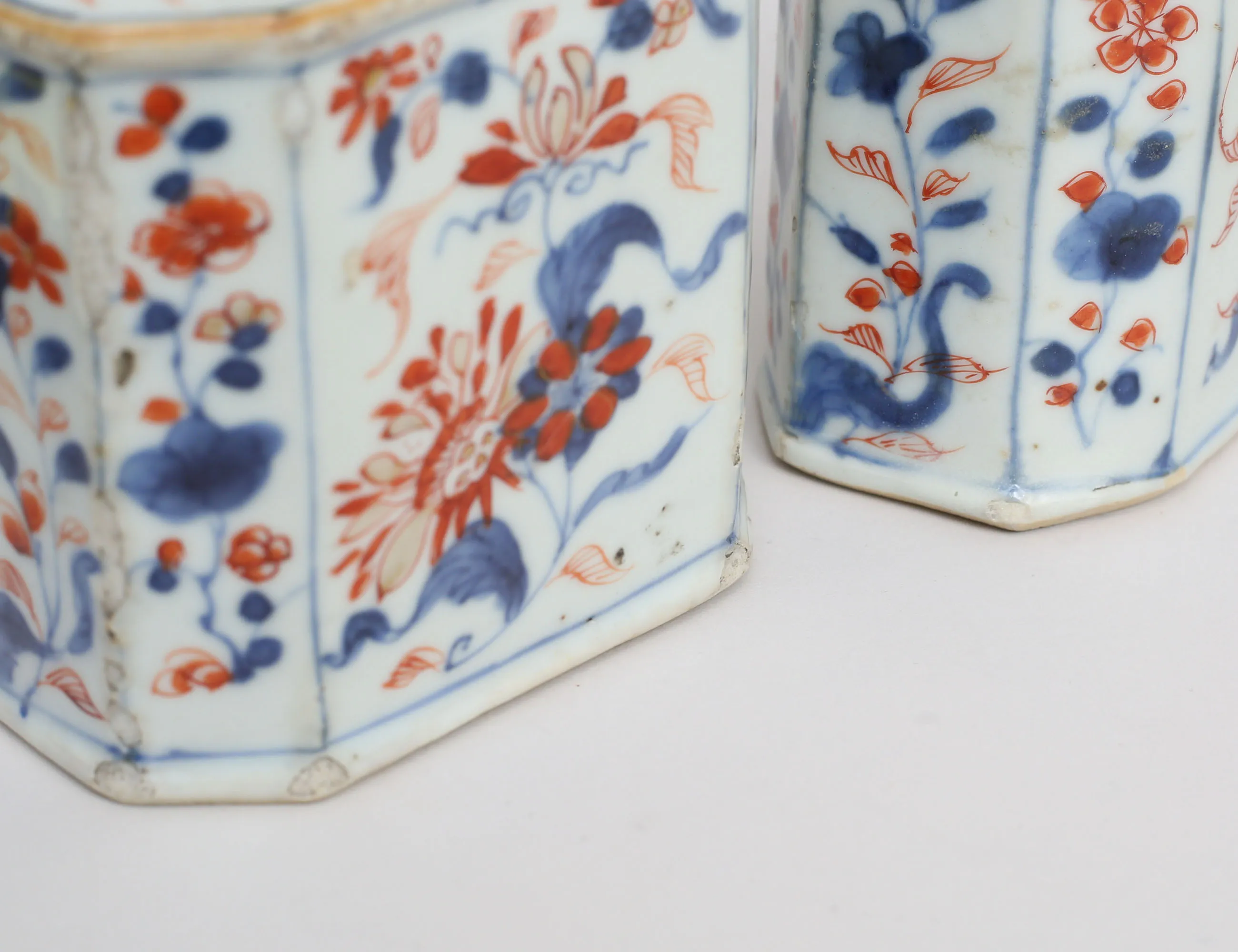 Qianlong 1736-1795, imaridekor i järnoxidrött på blåvit underglasyrfond, oktagonal form, höjd 11, bredd 9x5,5 (en öppning med konstlagning, en med omfattande glasyrnaggar)
