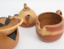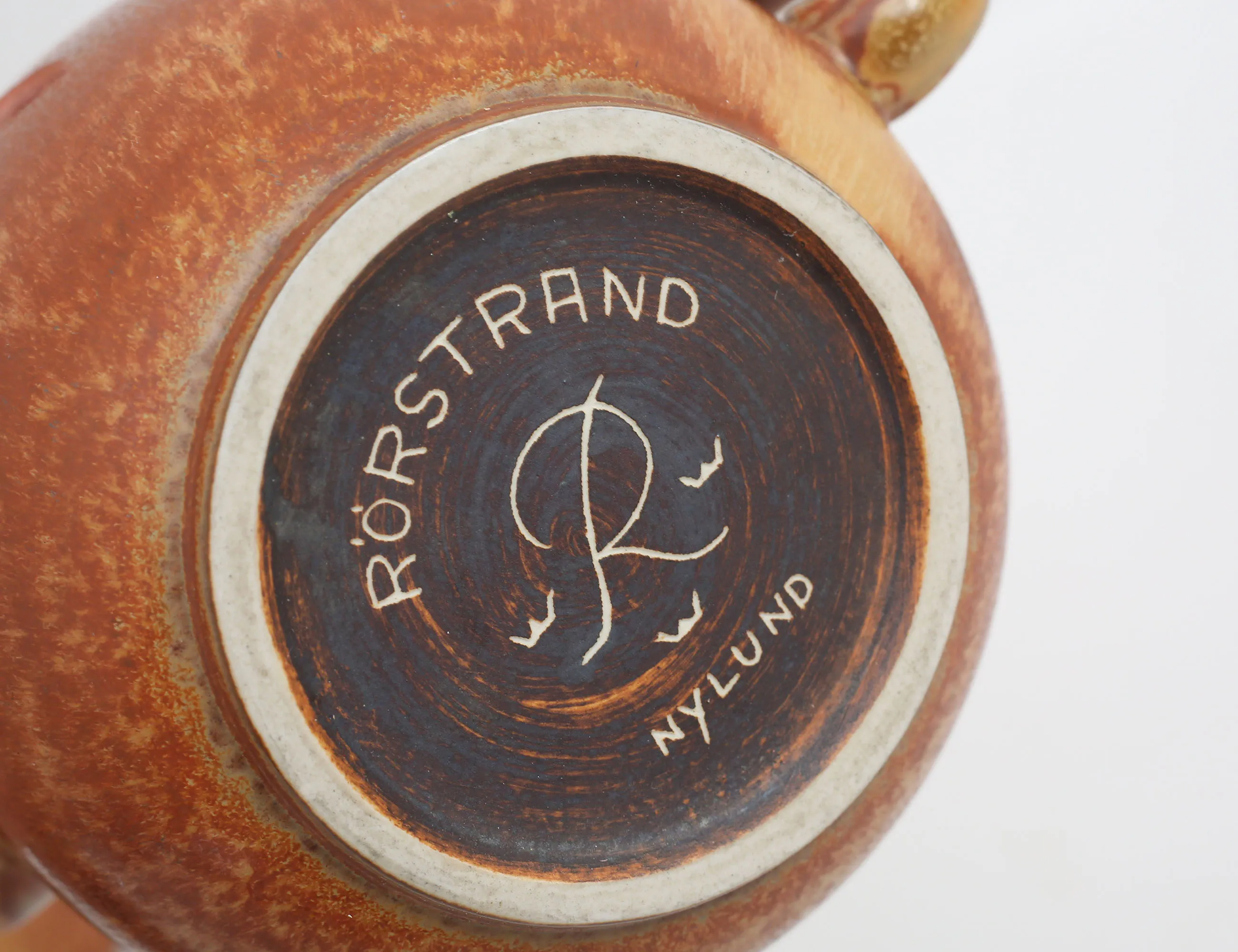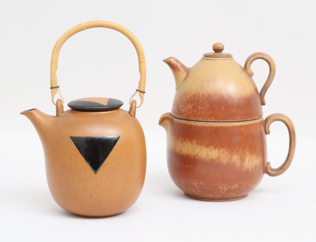 Gunnar Nylund, tekanna med underliggande varmvattenkanna, glaserat stengods, signerad, respektive tekanna Inger Persson, stengods, signerad, höjd 22/25