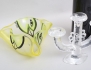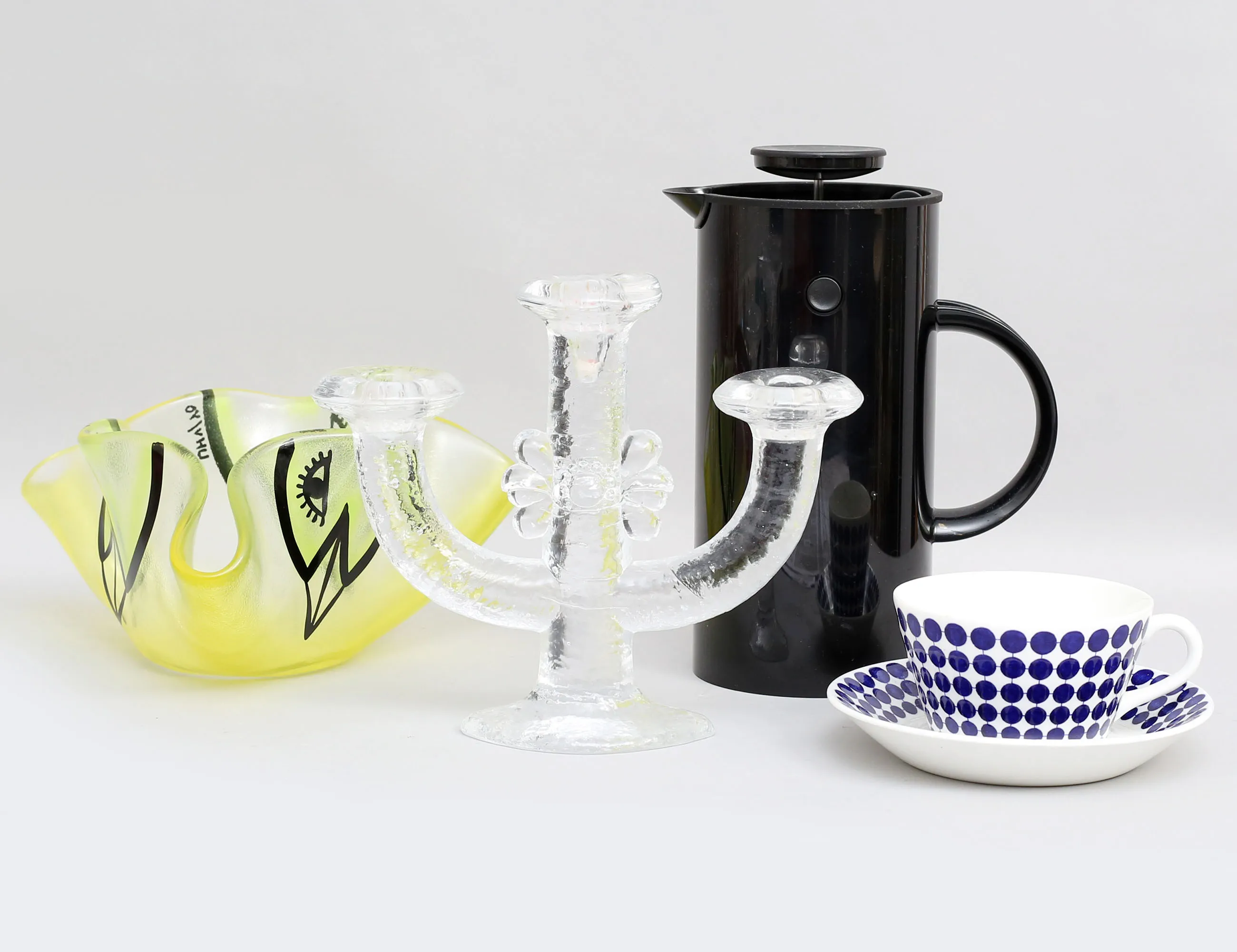Stig Lindberg Gustavsberg, höjd 6, skål veckad Ulrica Hydman Vallien, höjd 10,5, termoskanna/kaffepress design Erik Magnussen, Stelton Danmark, höjd 21, kandelaber för 3 ljus, design Staffan Gellerstedt Pukeberg, höjd 19