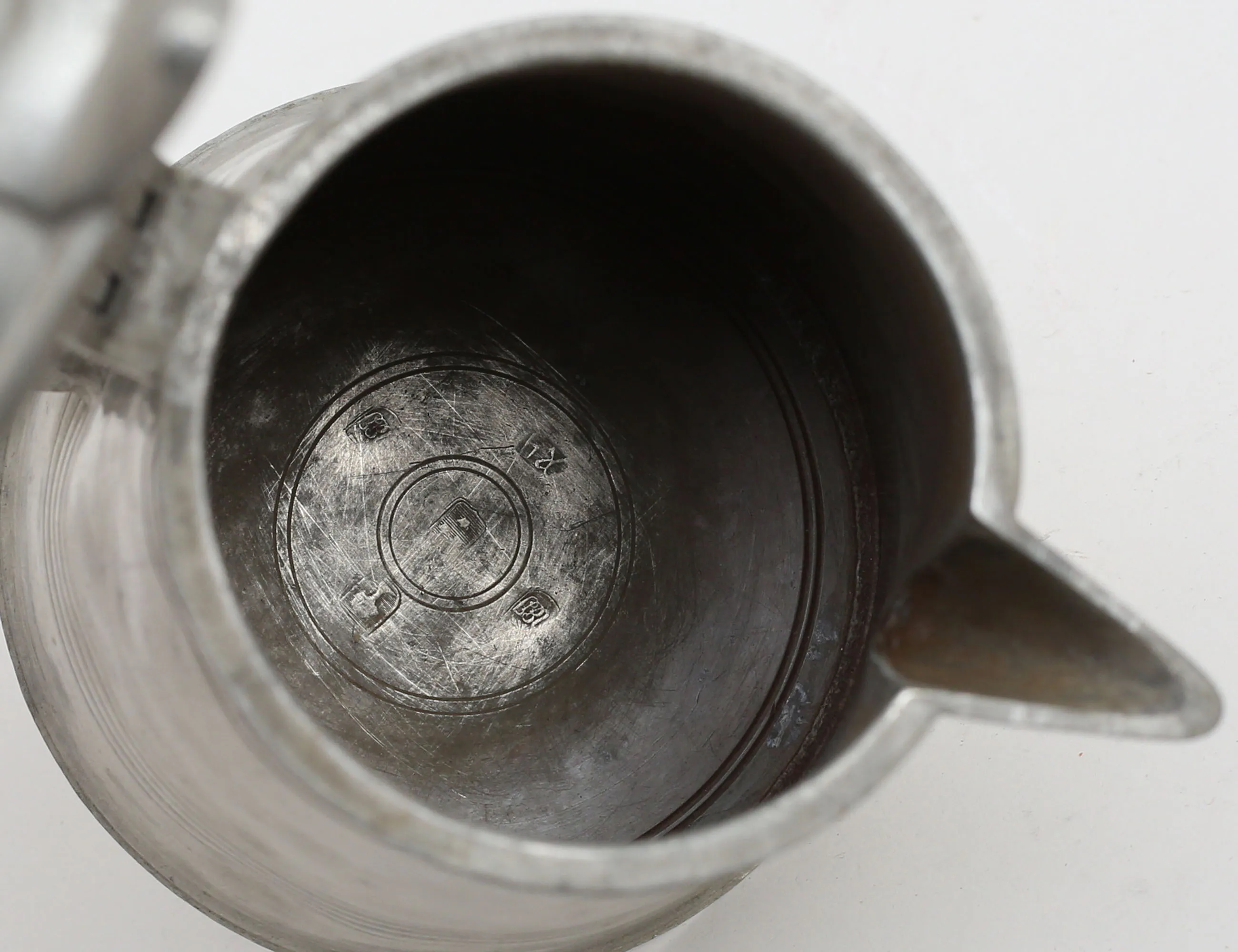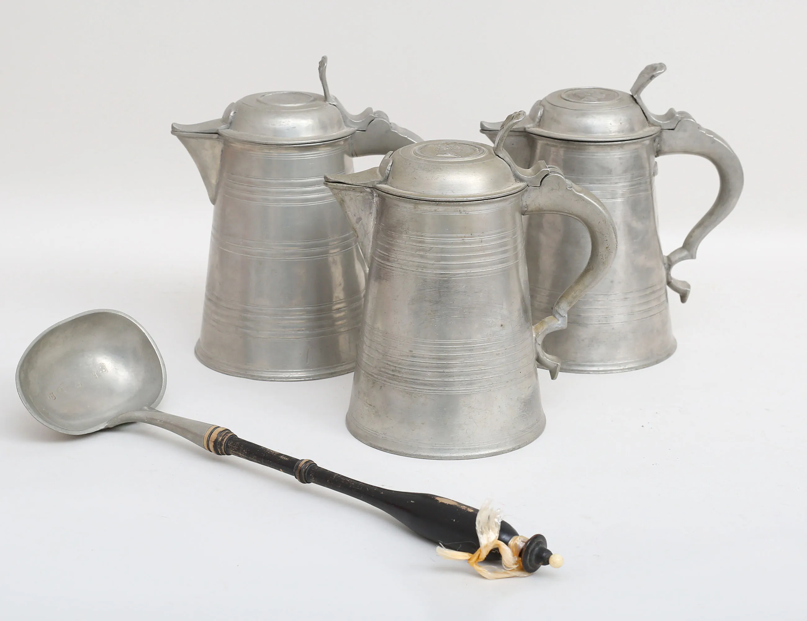tre stop - 1843, 1847 samt 1849, höjd 20, soppslev 1841, svarvat trähandtag med benknopp, längd 39 (smärre hänkellagningar) (4)