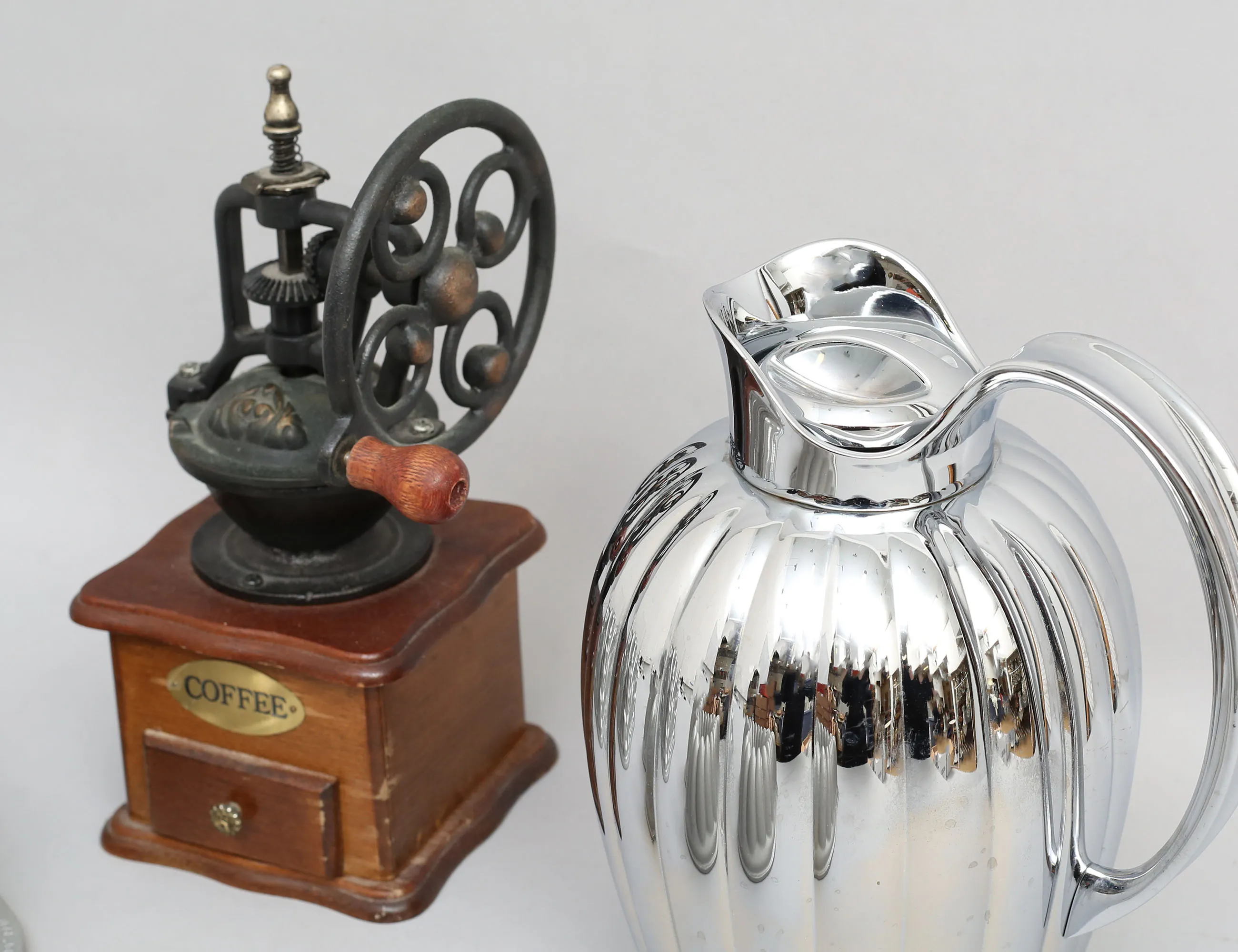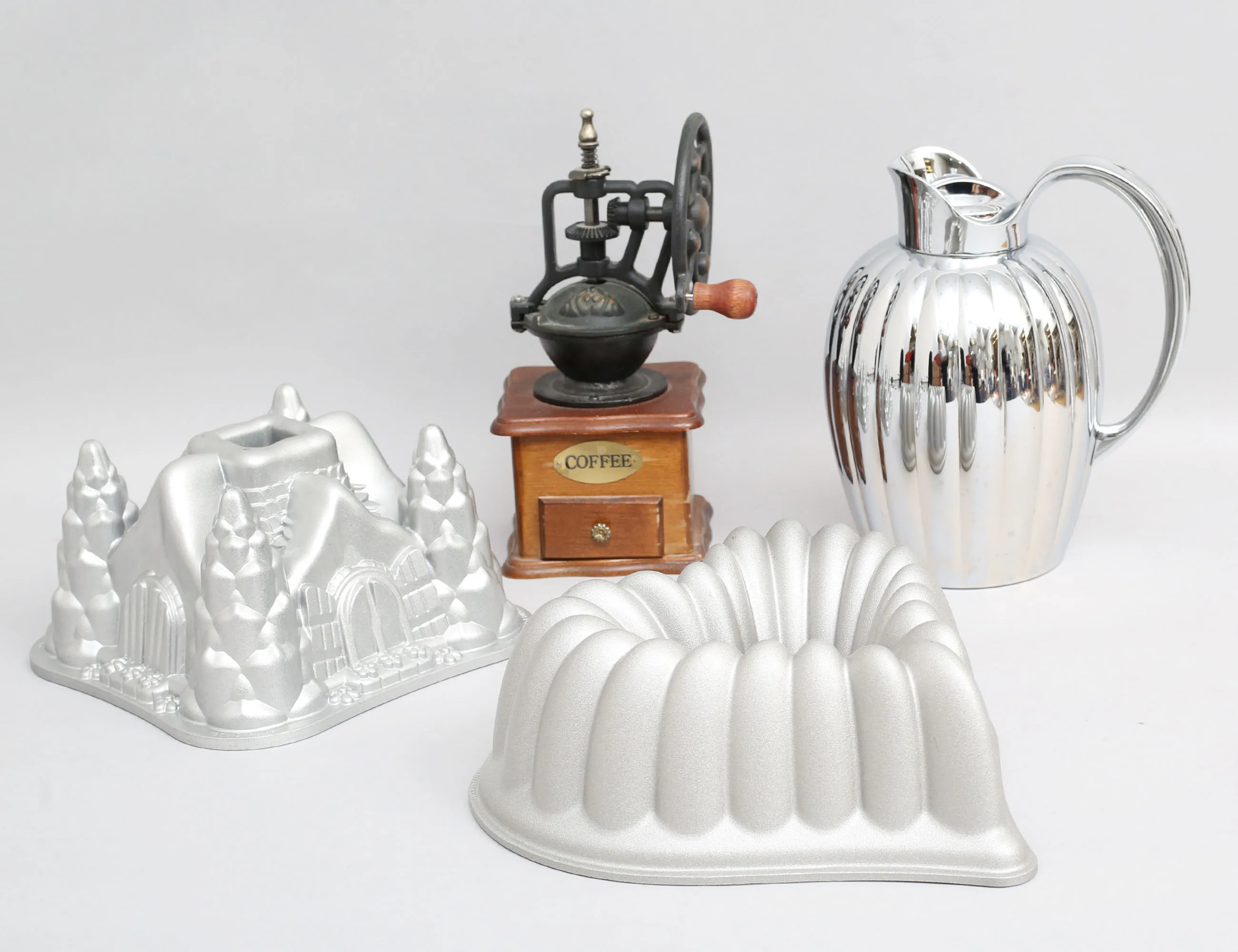 design Sigvard Bernadotte, rostfritt stål, höjd 24, 2 bakformar Nordic Ware USA, gjuten aluminium, höjd 10/13, kaffekvarn nutida, gjutgods och trä, höjd 27