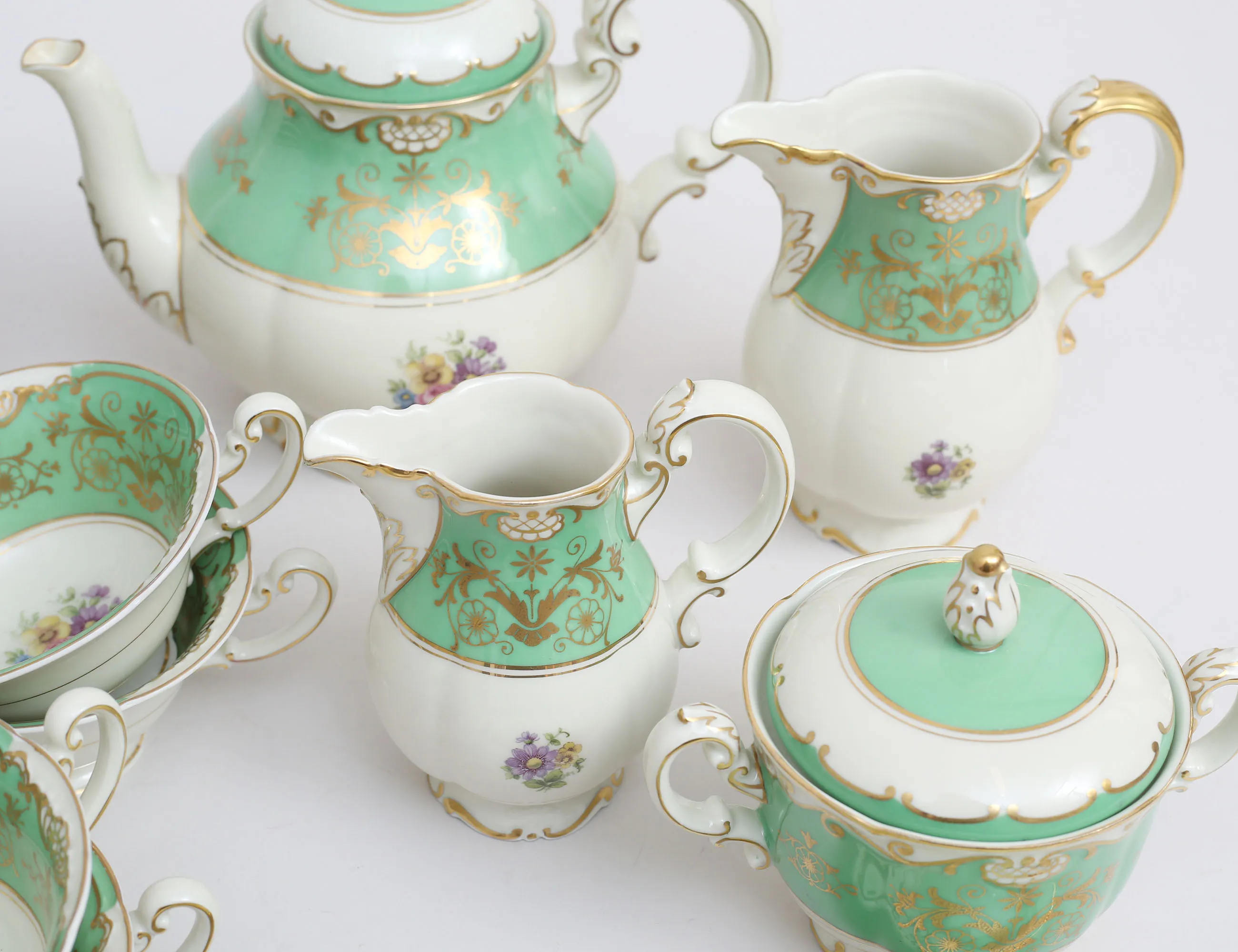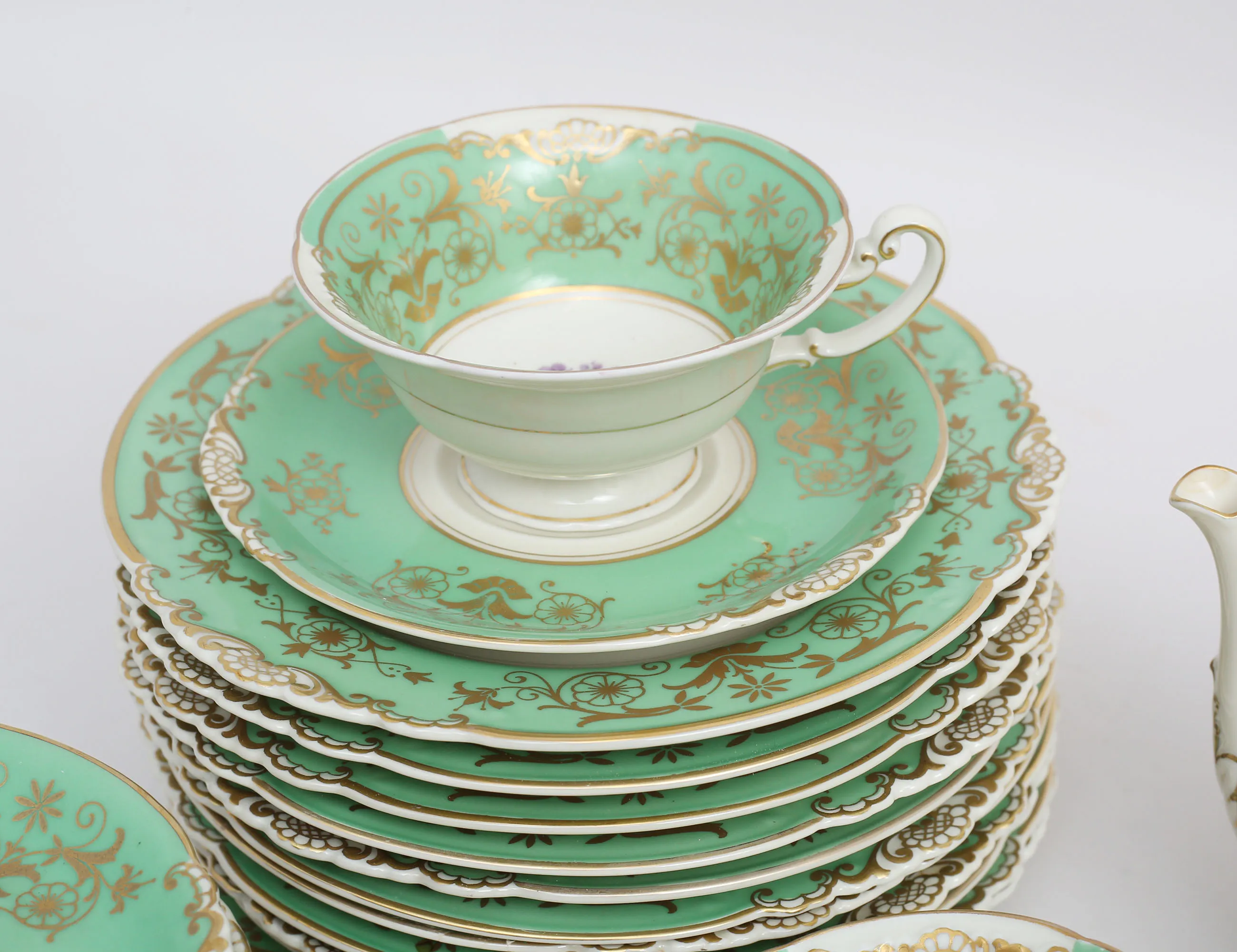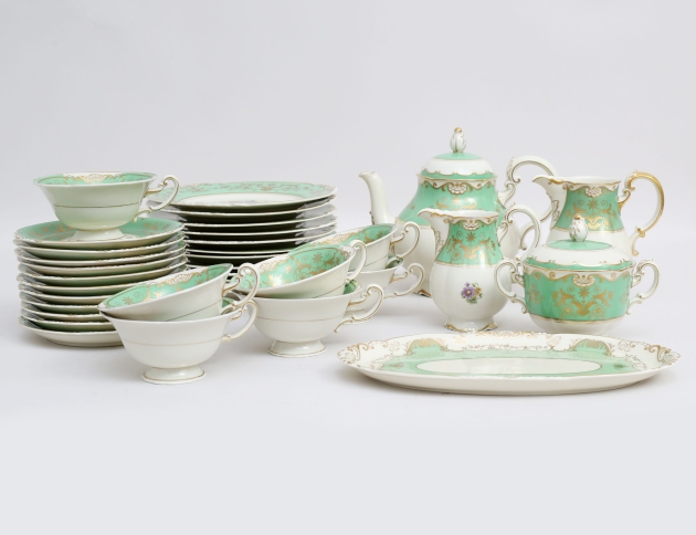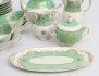 7 tekoppar med fat, 11 assietter, tekanna, fat, sockerskål, grädd- samt mjölkkanna, polykrom dekor delvis förgylld mot grön fond, höjd 5,5