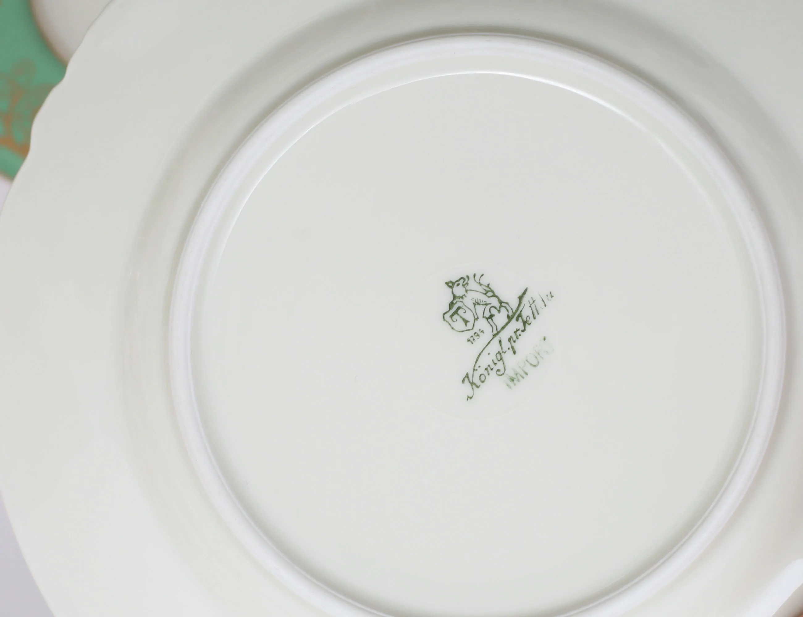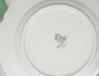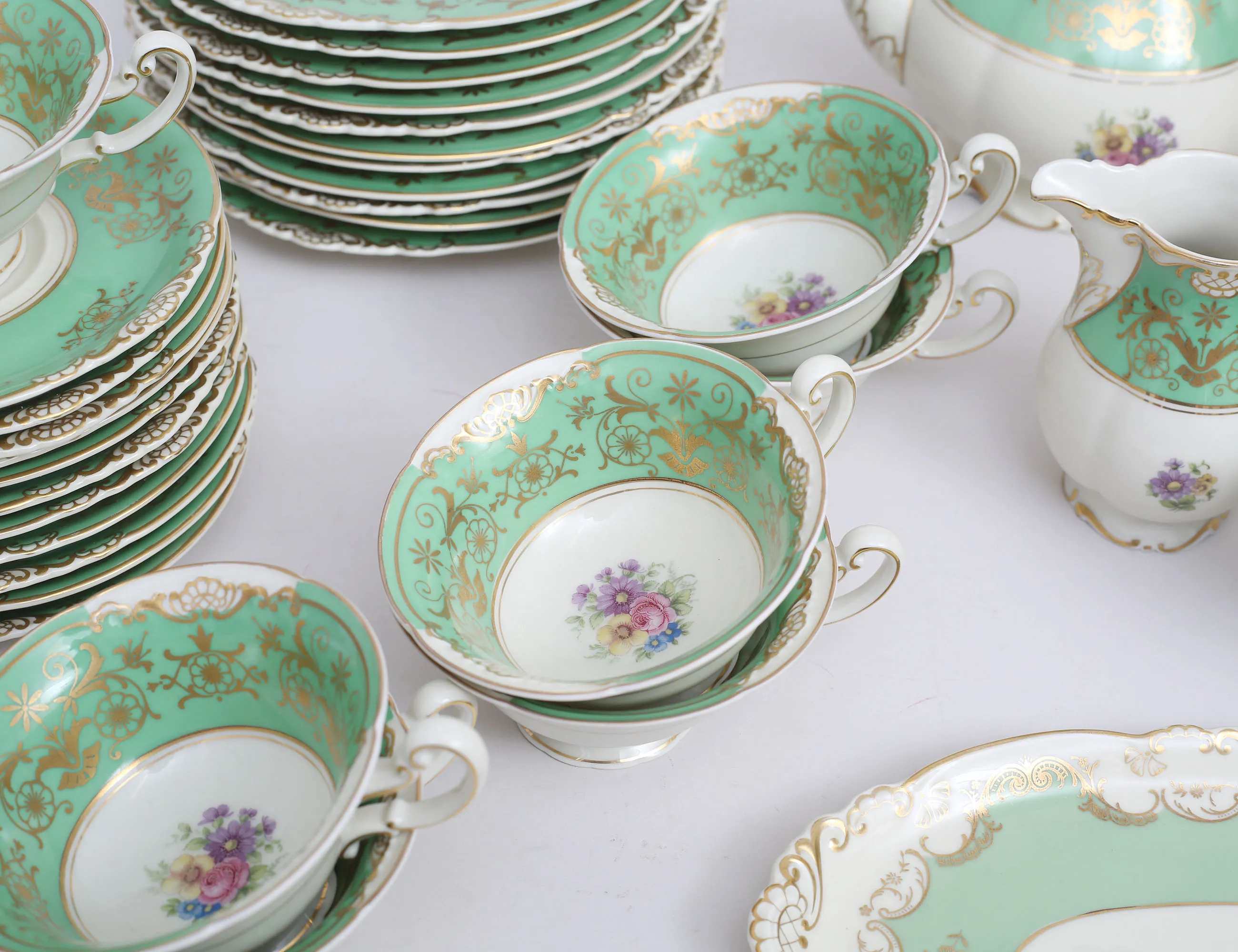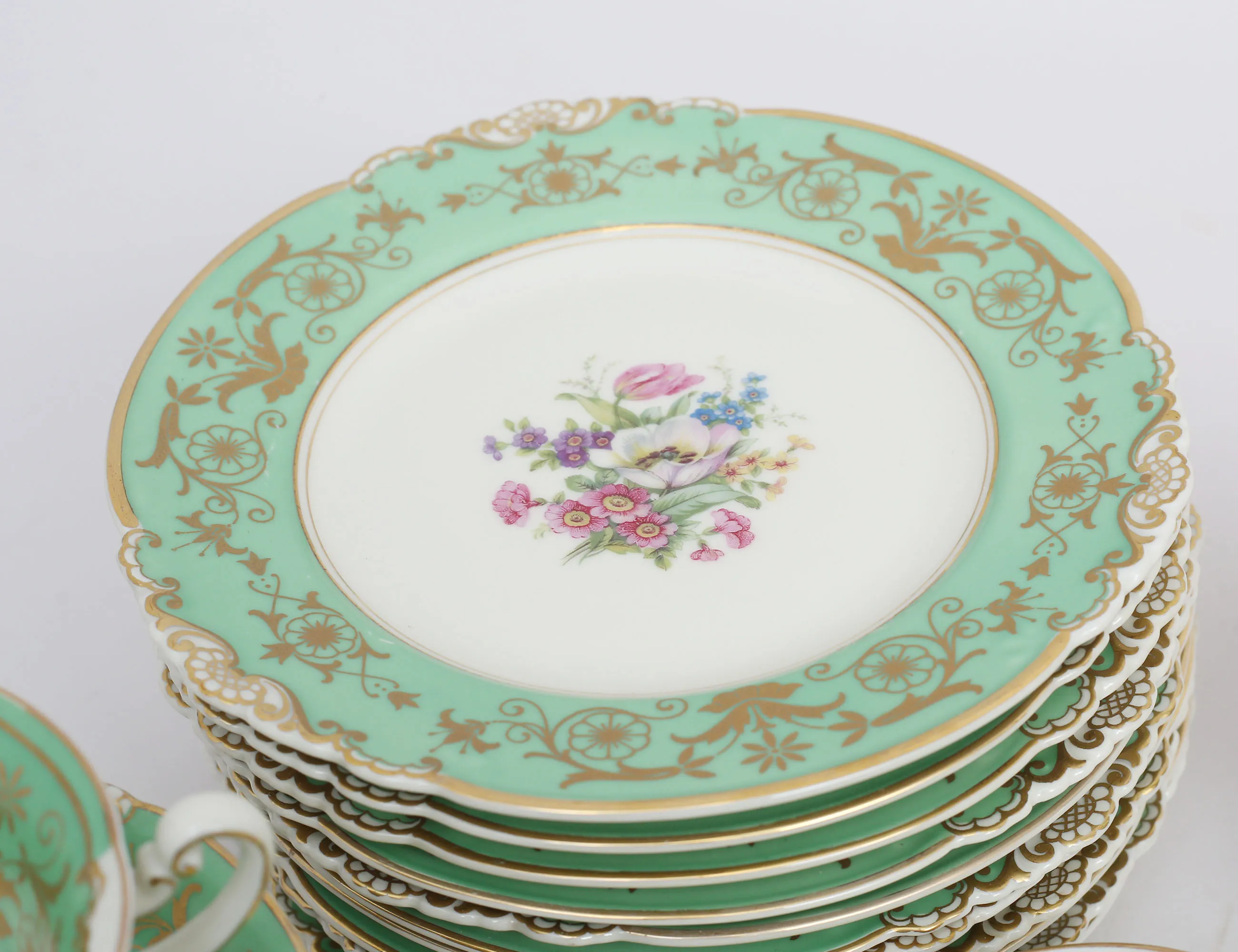 7 tekoppar med fat, 11 assietter, tekanna, fat, sockerskål, grädd- samt mjölkkanna, polykrom dekor delvis förgylld mot grön fond, höjd 5,5