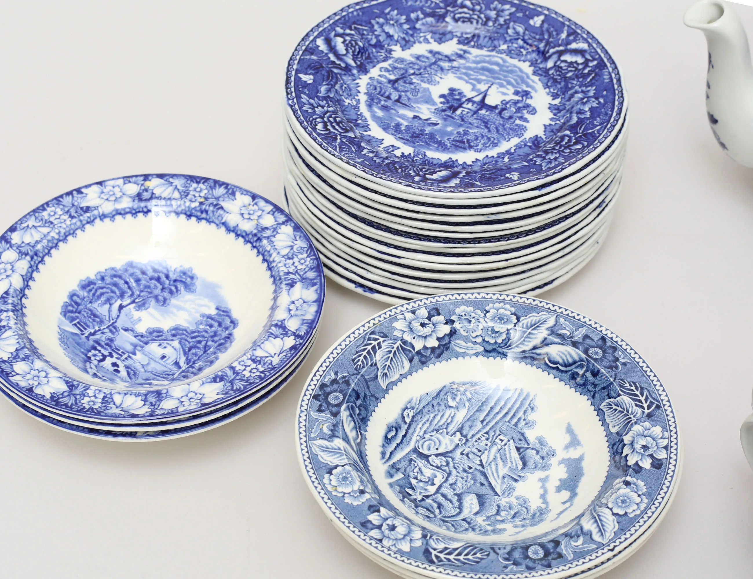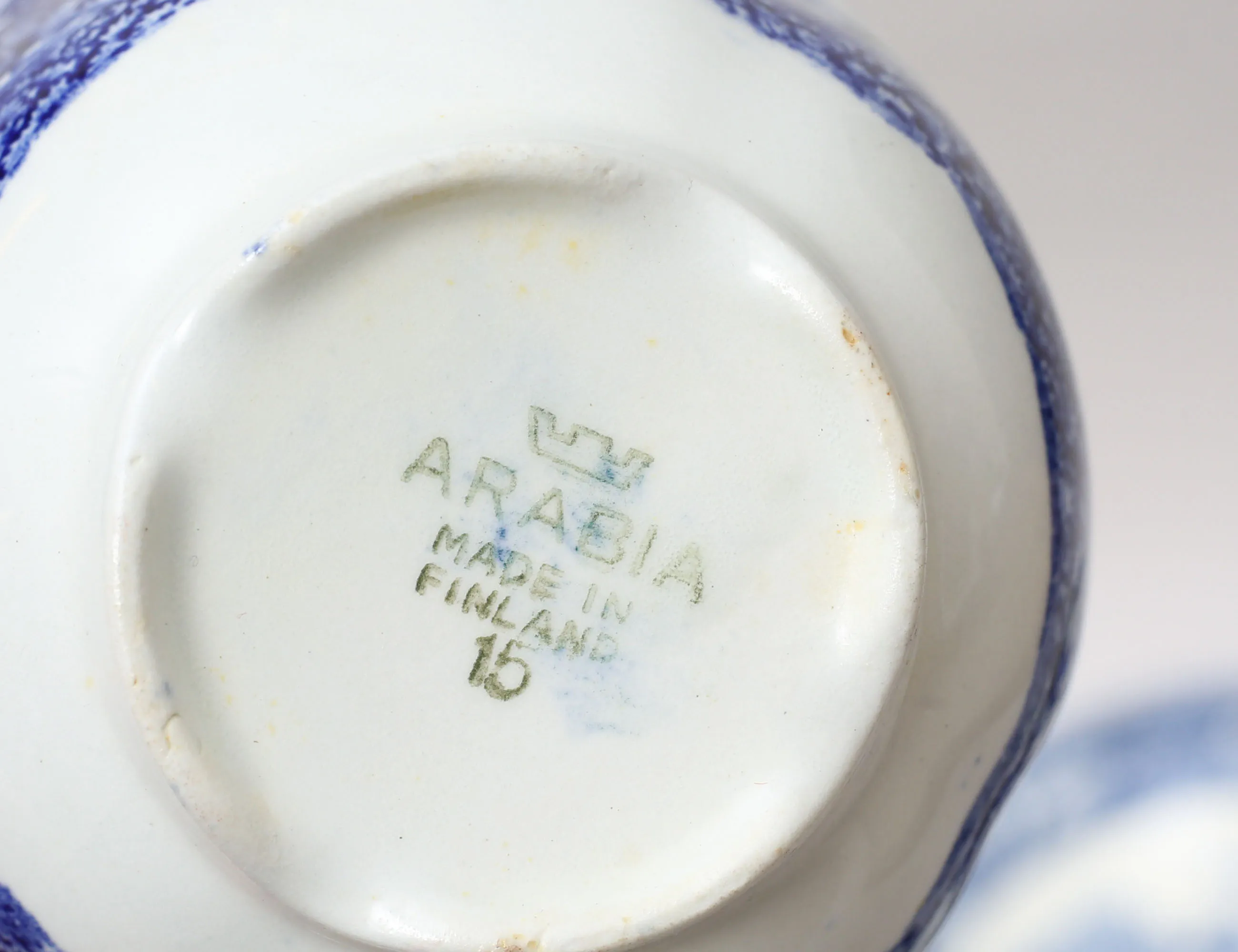 Reinhard Richter Arabia Finland, 12 koppar med fat, 15 assietter, kanna samt gräddkanna, höjd 6, diameter 17, 6 frukostskålar "Woodland" England medföljer (2 koppar med micronagg, tekannan med nagg) (35)