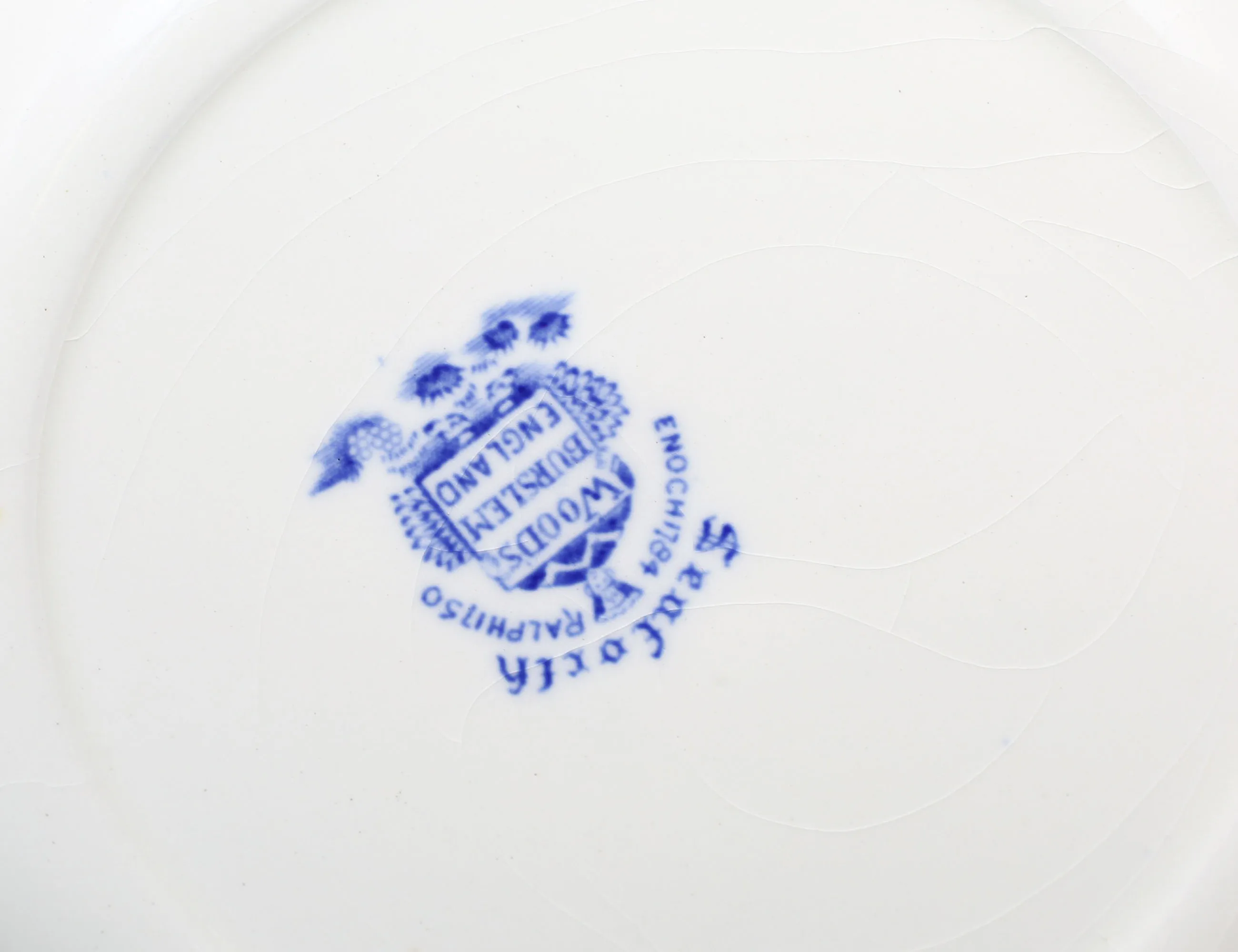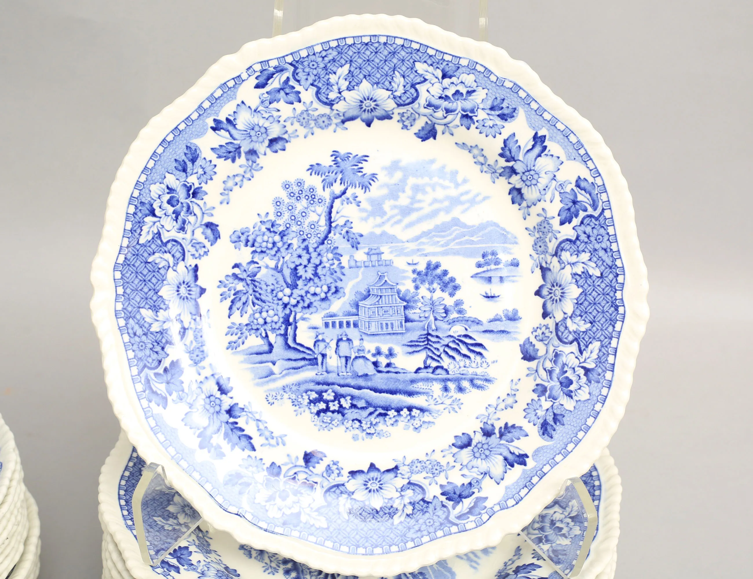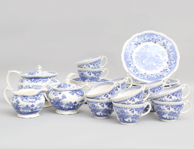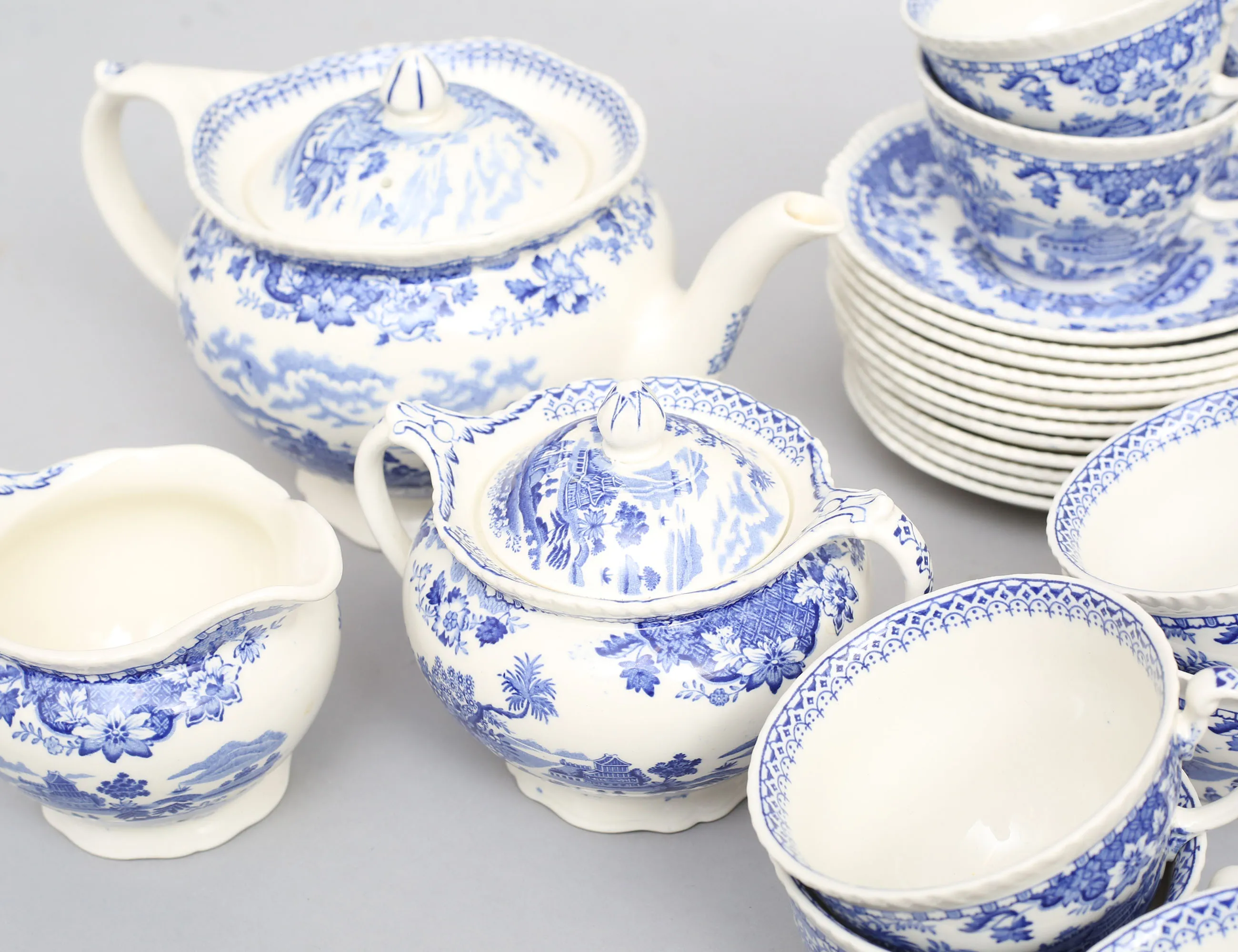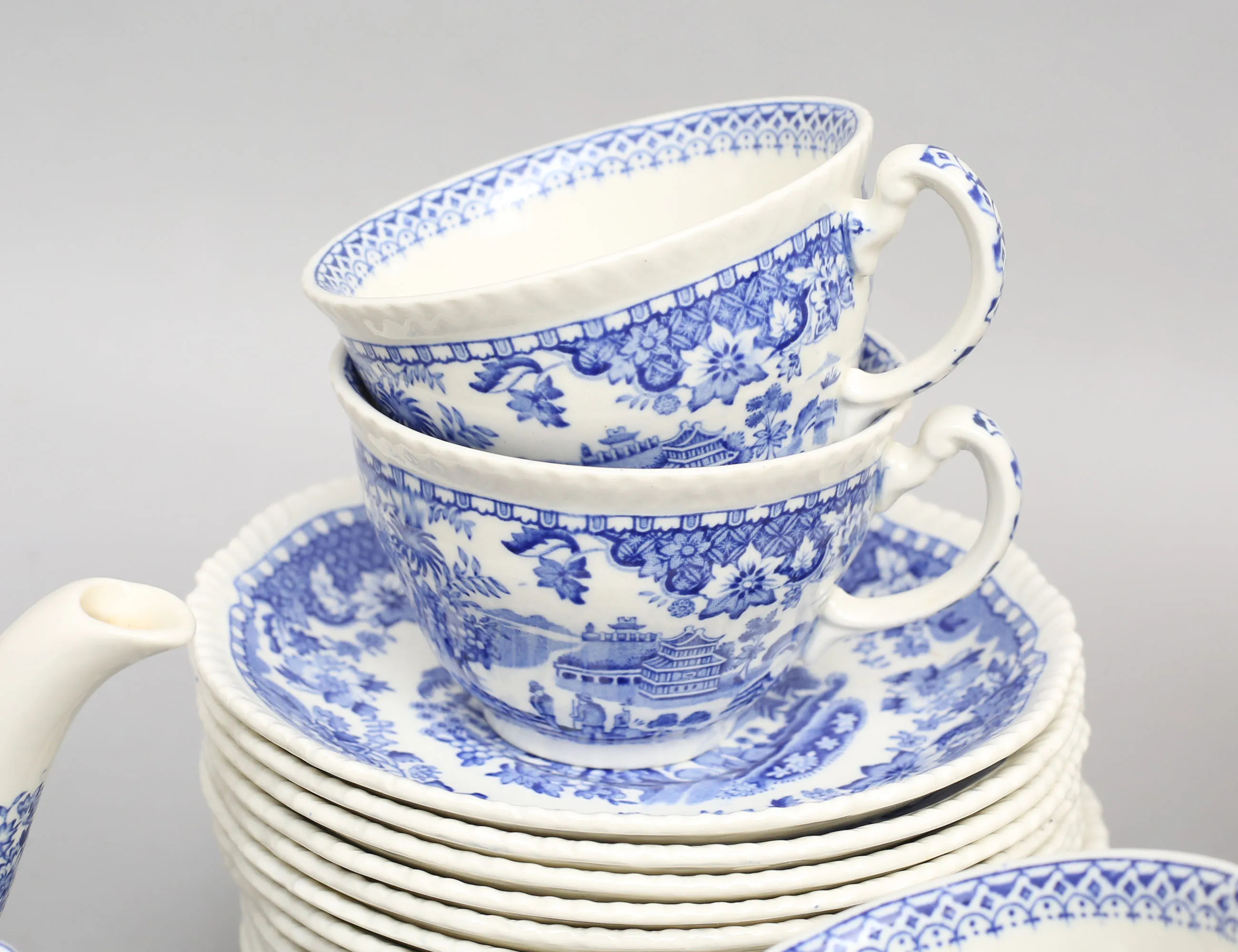 12 koppar med fat, 12 assietter, kanna, sockerskål samt gräddkanna, blåvit underglasyrdekor, höjd 6 (27)
