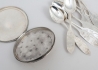 modell Nordisk med graverad blomsterslinga, MEMA Linköping 1985, dosa silver, CG Hallberg Stockholm 1949, silvervikt ca. 250 gram, längd 11,5, diameter 8, äldre svenska sedlar bla. 100kr 1943 medföljer