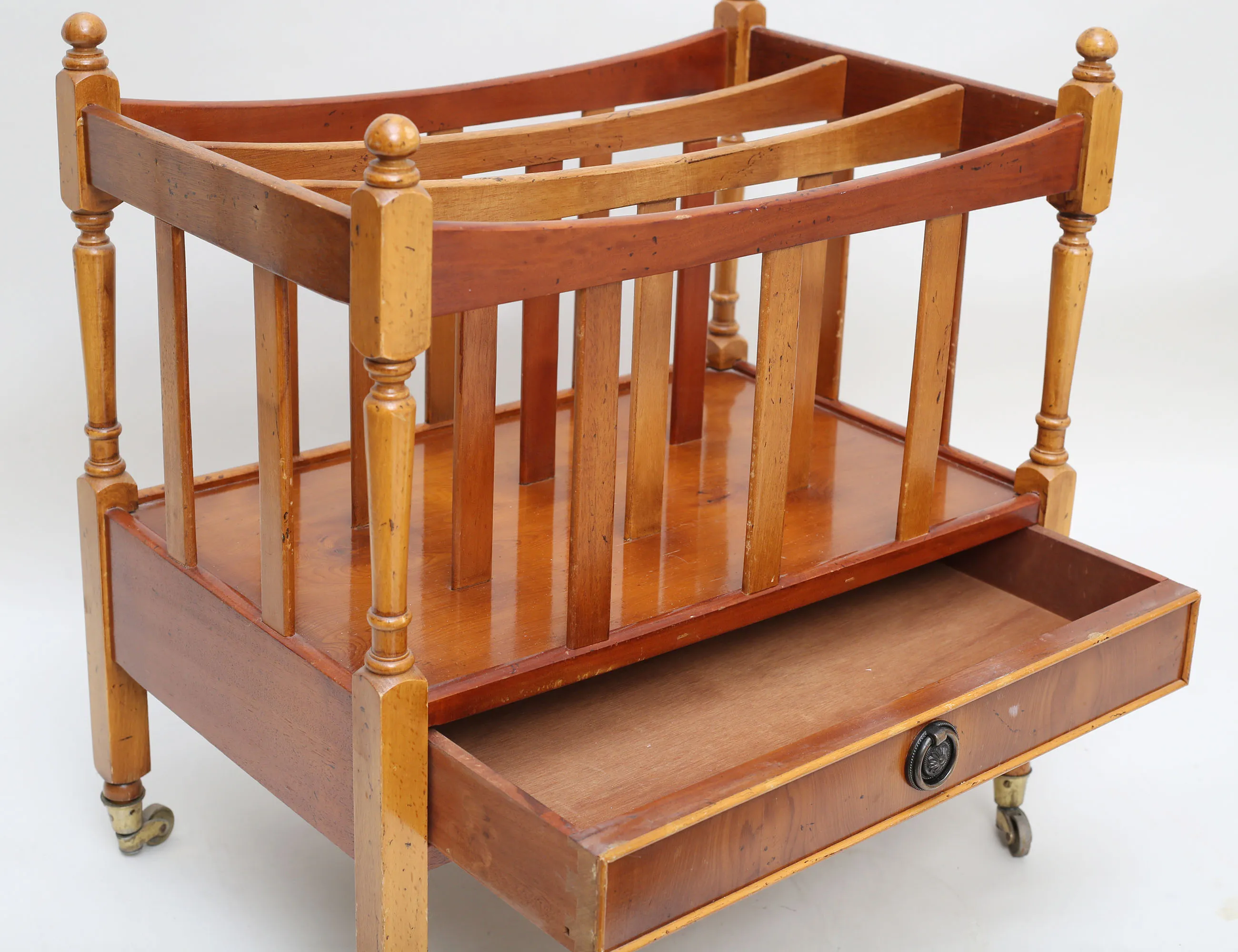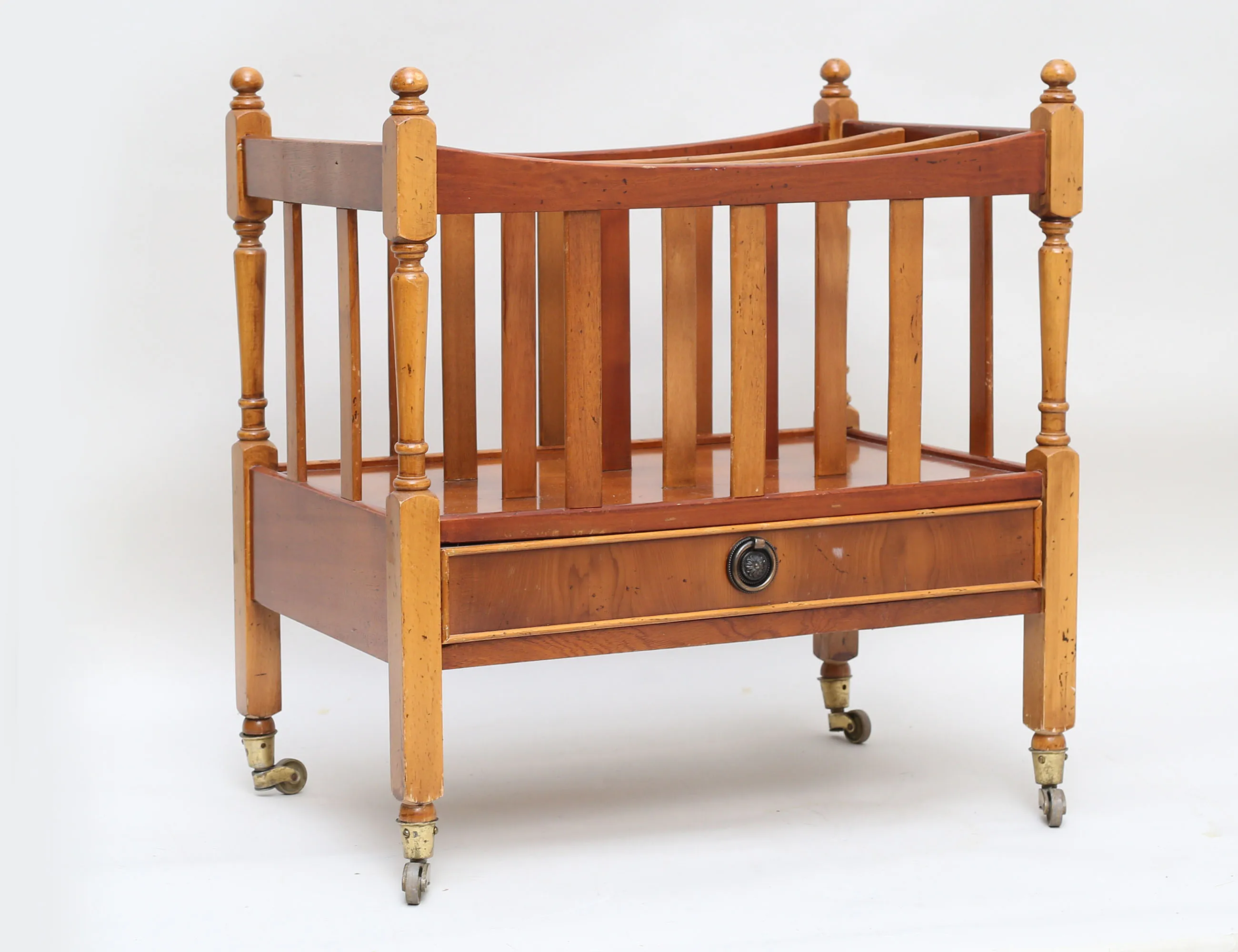 idegran, tre fack samt en låda, draghandtag i mässing, hjultrissor i mässing, höjd 53, bredd 51x33 (bruksslitage)